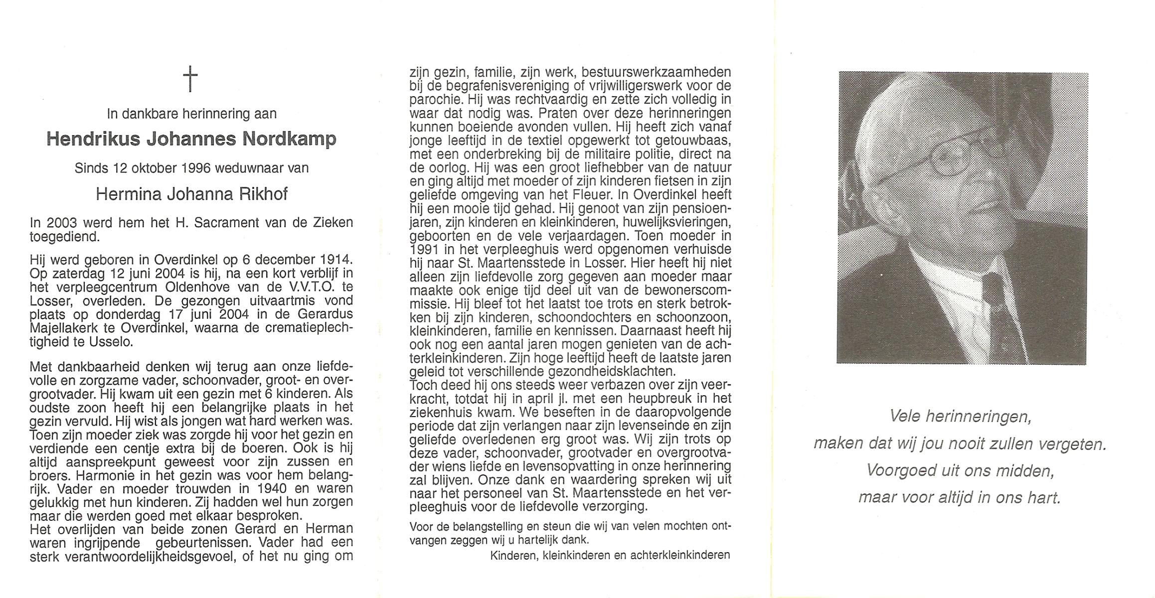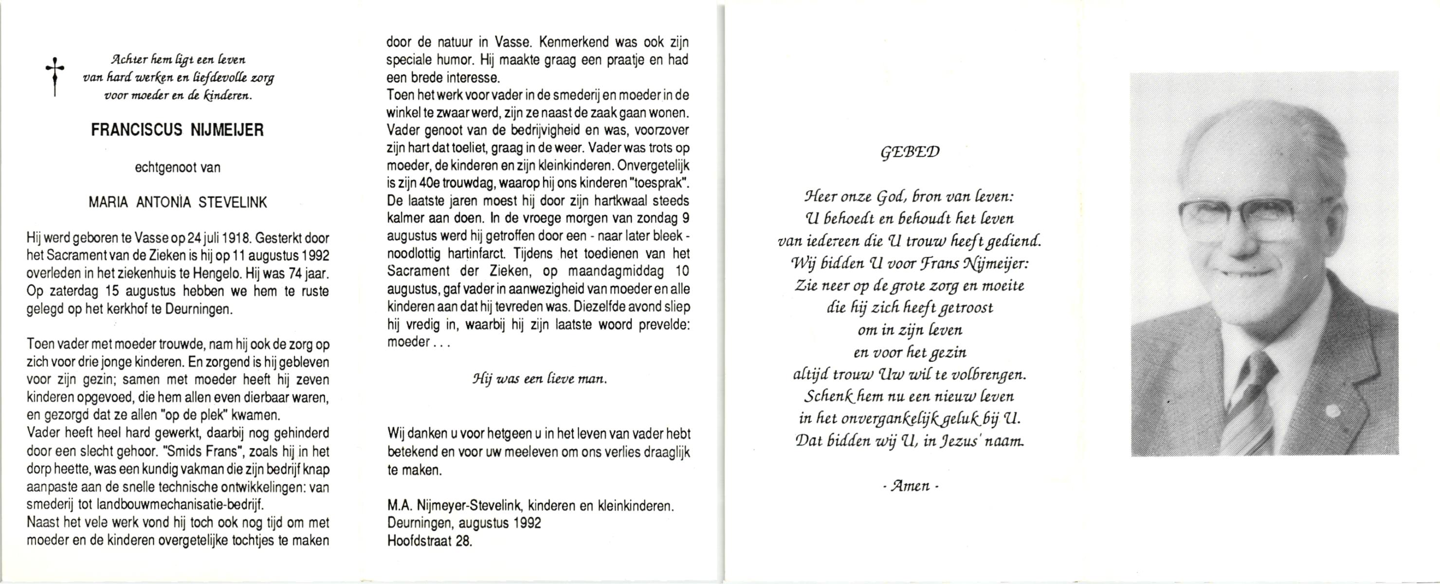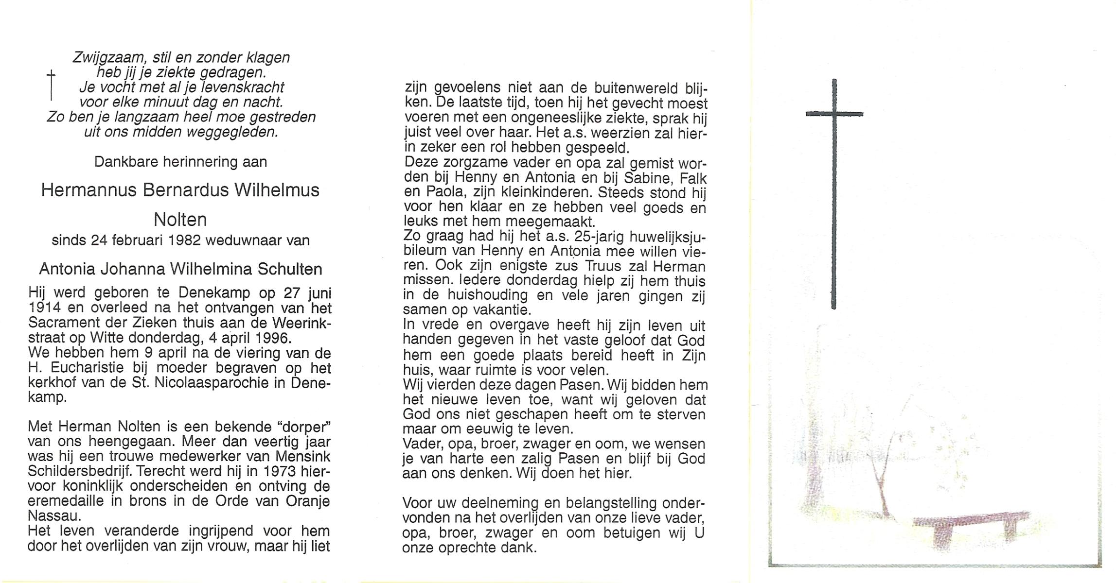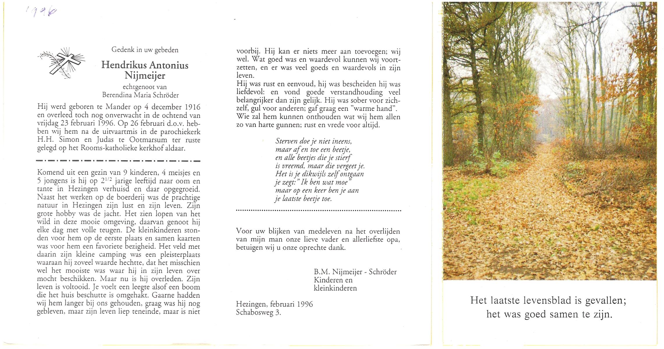 NIJKAMP, Wilhelmus Josephus, geboren op 4-3-1908 te Schoonheten, overleden op 17-6-1996 te Raalte op 88-jarige leeftijd, begraven op 21-6-1996 te Luttenberg, Raalte.