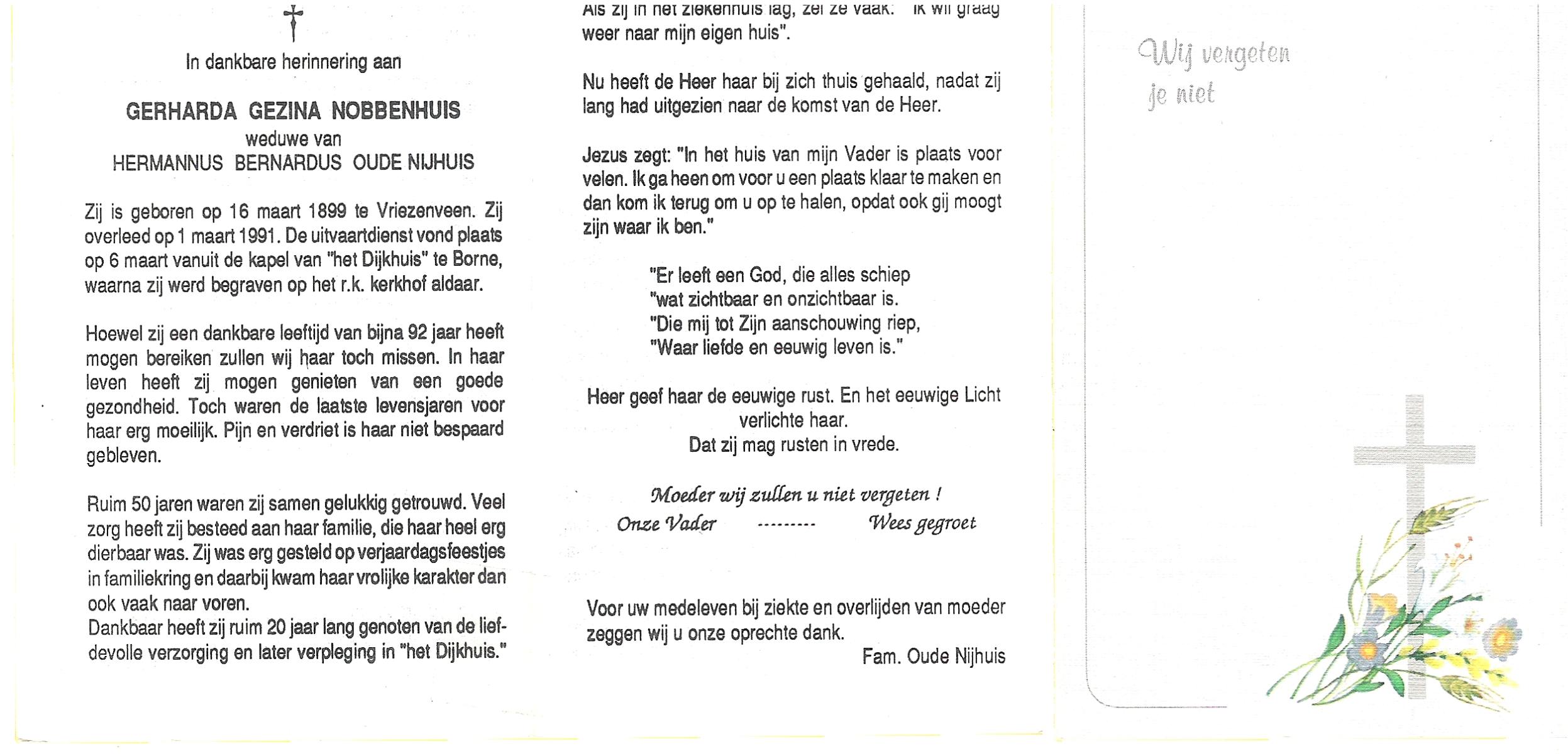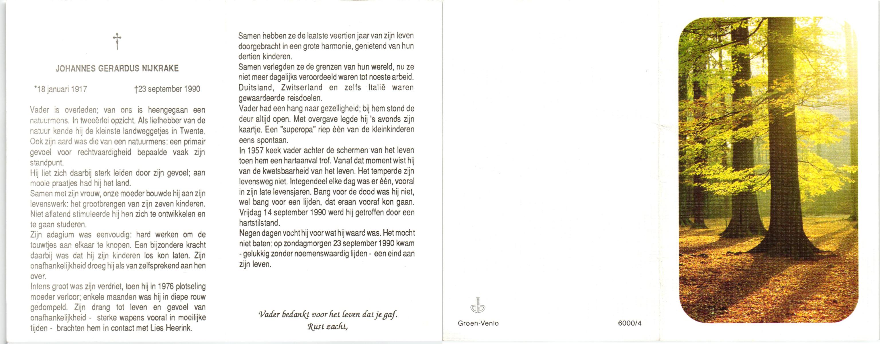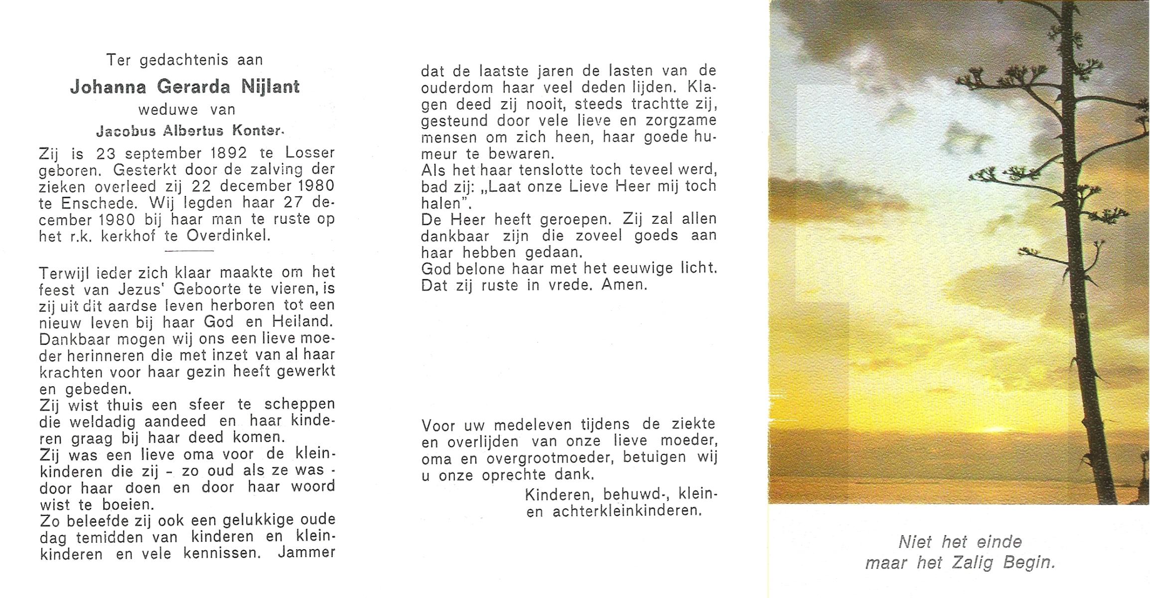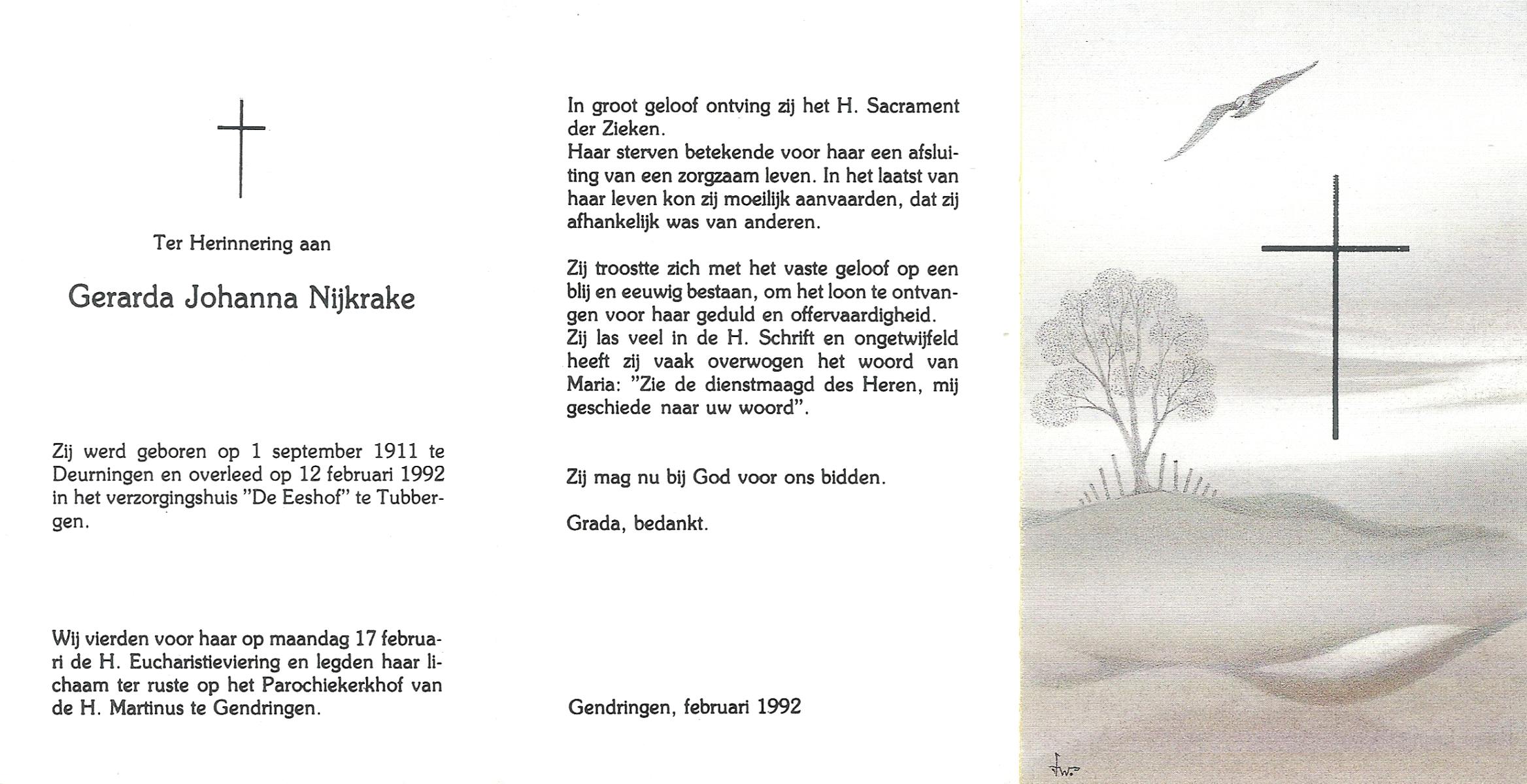 NIJKRAKE, Gerarda Johanna, geboren op 1-9-1911 te Deurningen, overleden op 12-2-1992 te Tubbergen op 80-jarige leeftijd, begraven op 17-2-1992 te Gendringen.