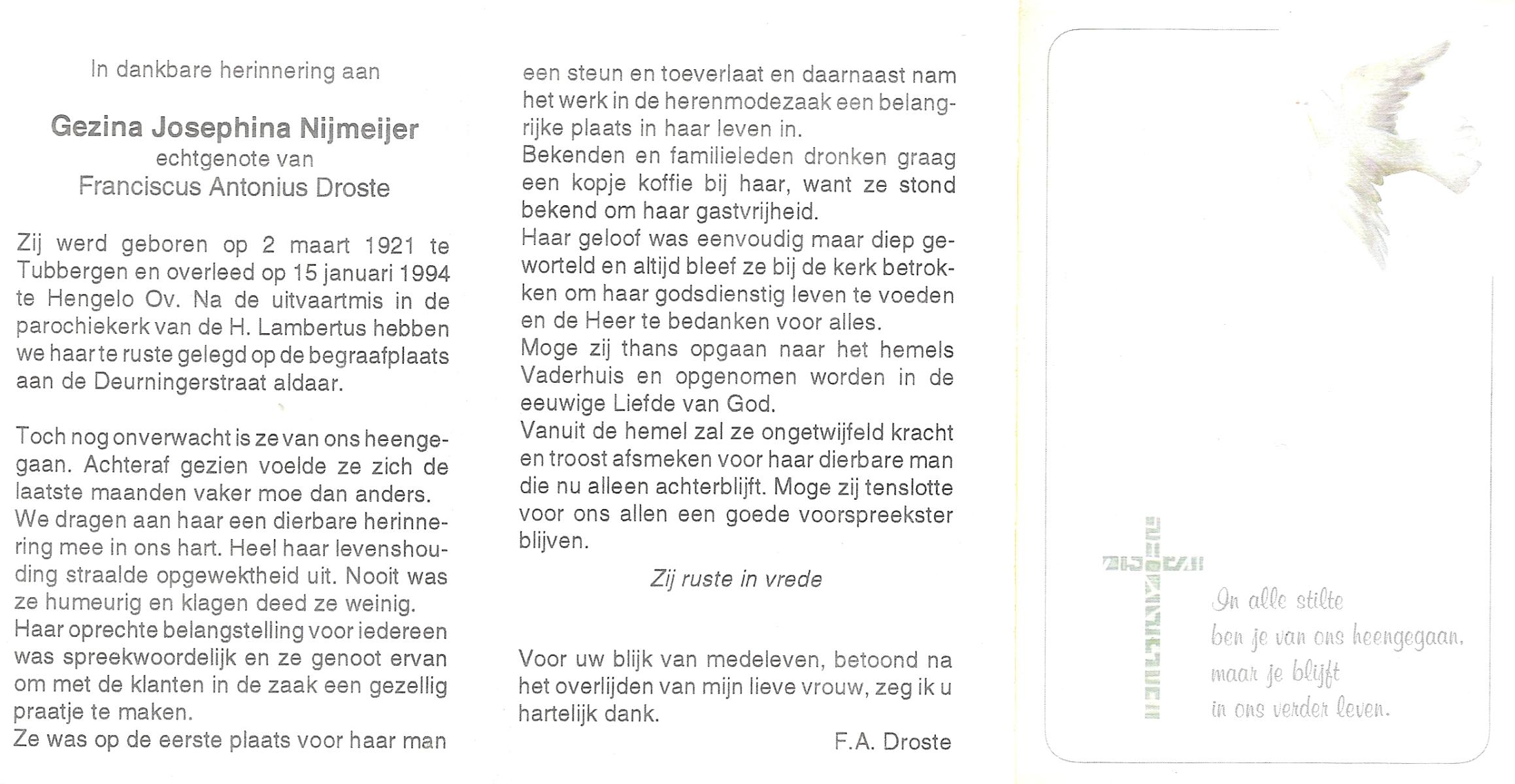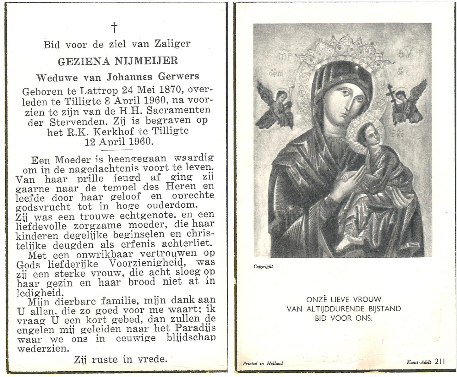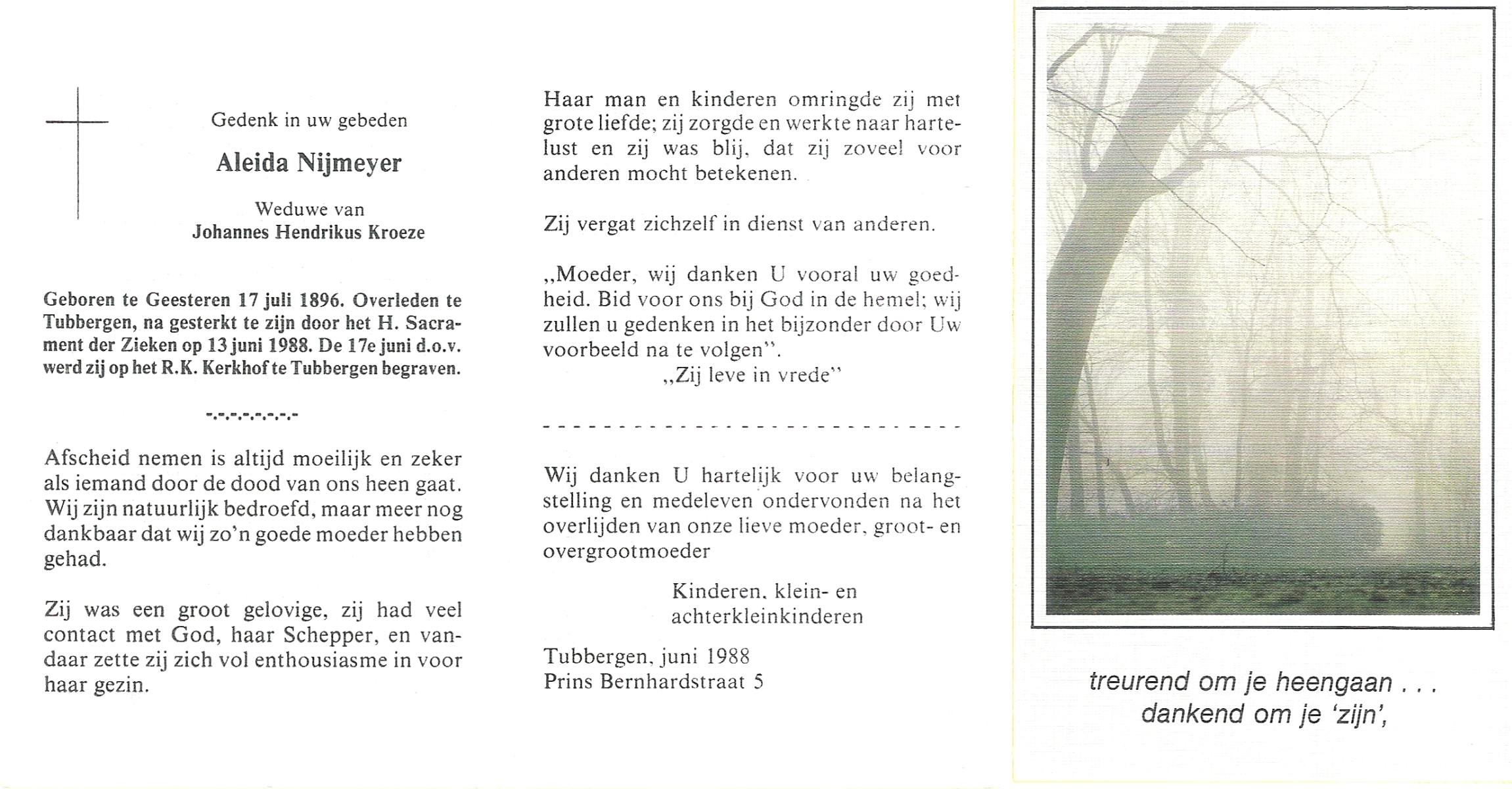 NIJKRAKE, Gerarda Johanna, geboren op 1-9-1911 te Deurningen, overleden op 12-2-1992 te Tubbergen op 80-jarige leeftijd, begraven op 17-2-1992 te Gendringen.
