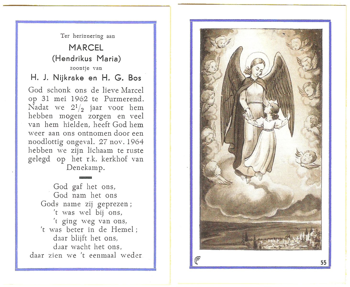 NIJKRAKE, Marcel (Hendrikus Maria), geboren op 31-5-1962 te Purmerend, overleden op 27-11-1964 op 2-jarige leeftijd, begraven te Denekamp.