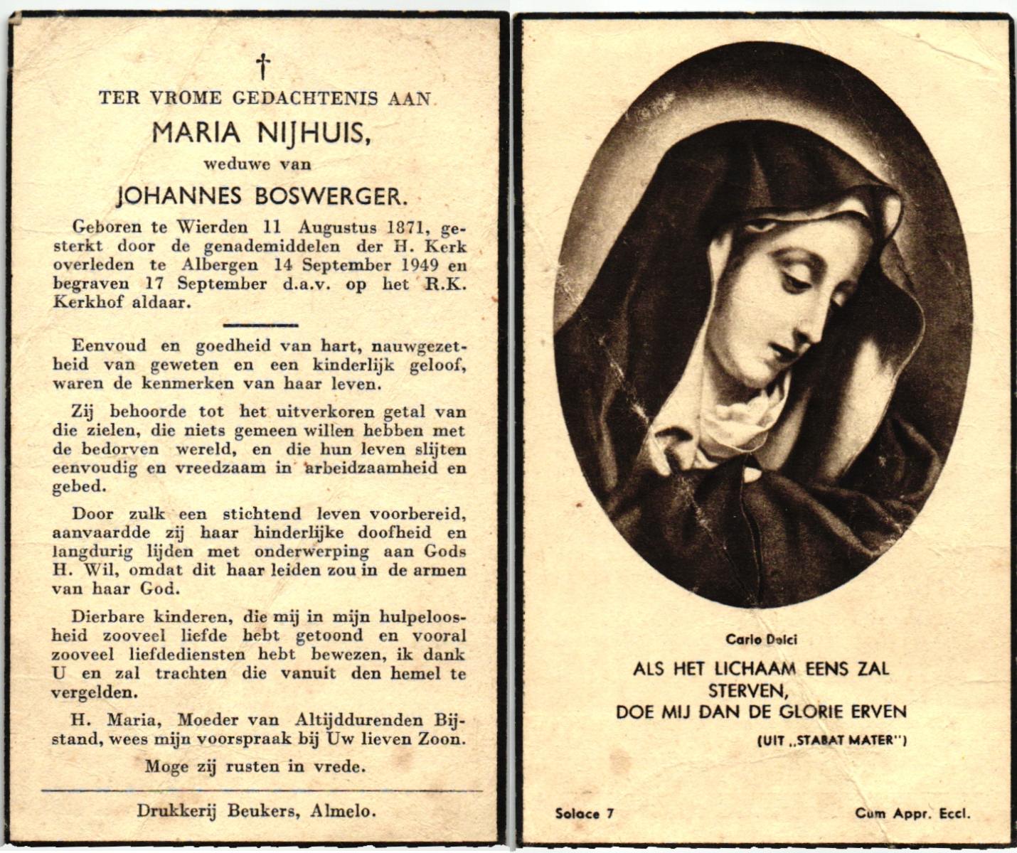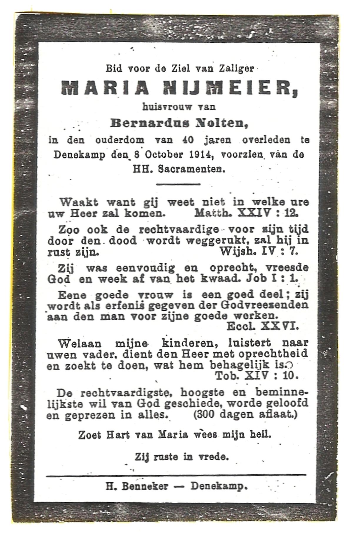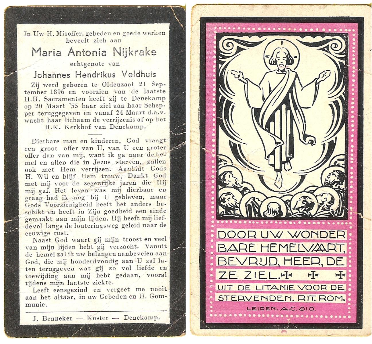 NIJKRAKE, Maria Antonia, geboren op 21-09-1896 te Oldenzaal, overleden op 20-3-1955 te Denekamp op 58-jarige leeftijd, begraven op 24-3-1955 te Denekamp.