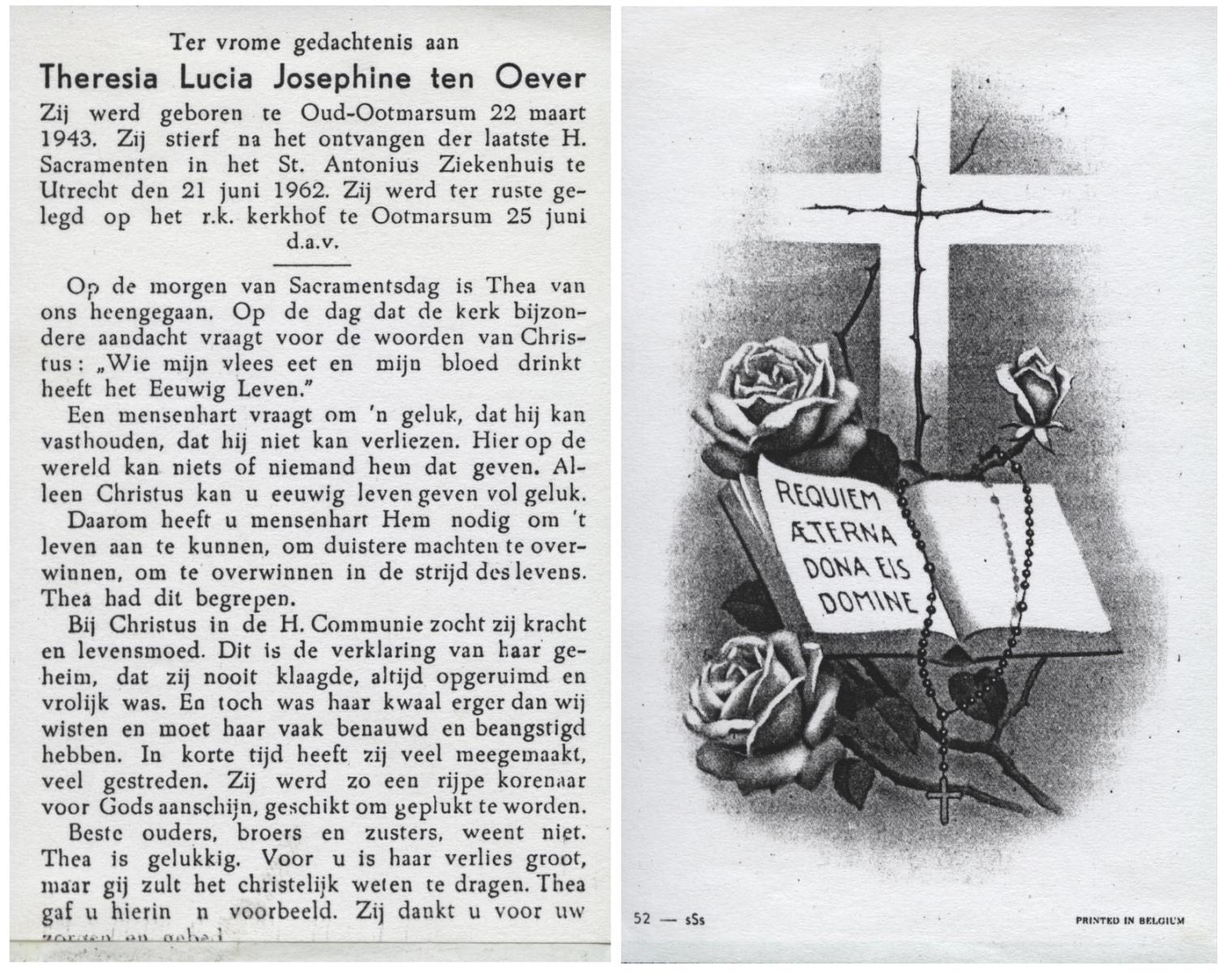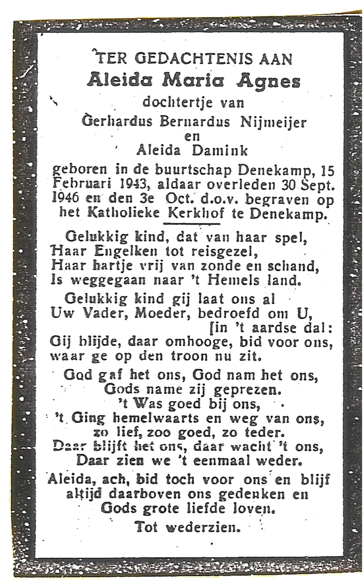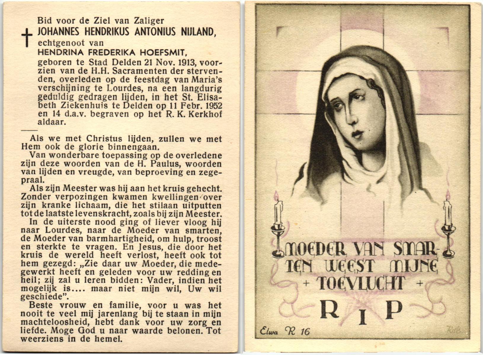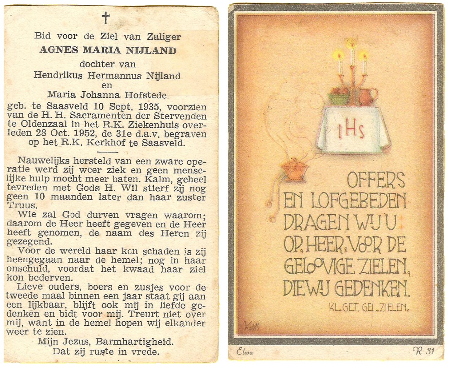 NIJLAND, Agnes Maria, geboren op 10-9-1935 te Saasveld, overleden op 28-10-1952 te Oldenzaal op 17-jarige leeftijd, begraven op 31-10-1952 te Saasveld.