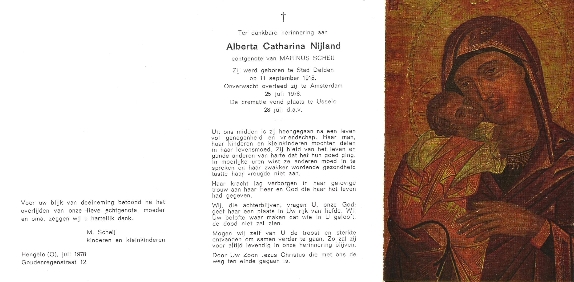 NIJLAND, Alberta Catharina, geboren op 11-9-1915 te Delden, Stad, overleden op 25-7-1978 te Amsterdam op 62-jarige leeftijd, gecremeerd op 28-7-1978 te Usselo.