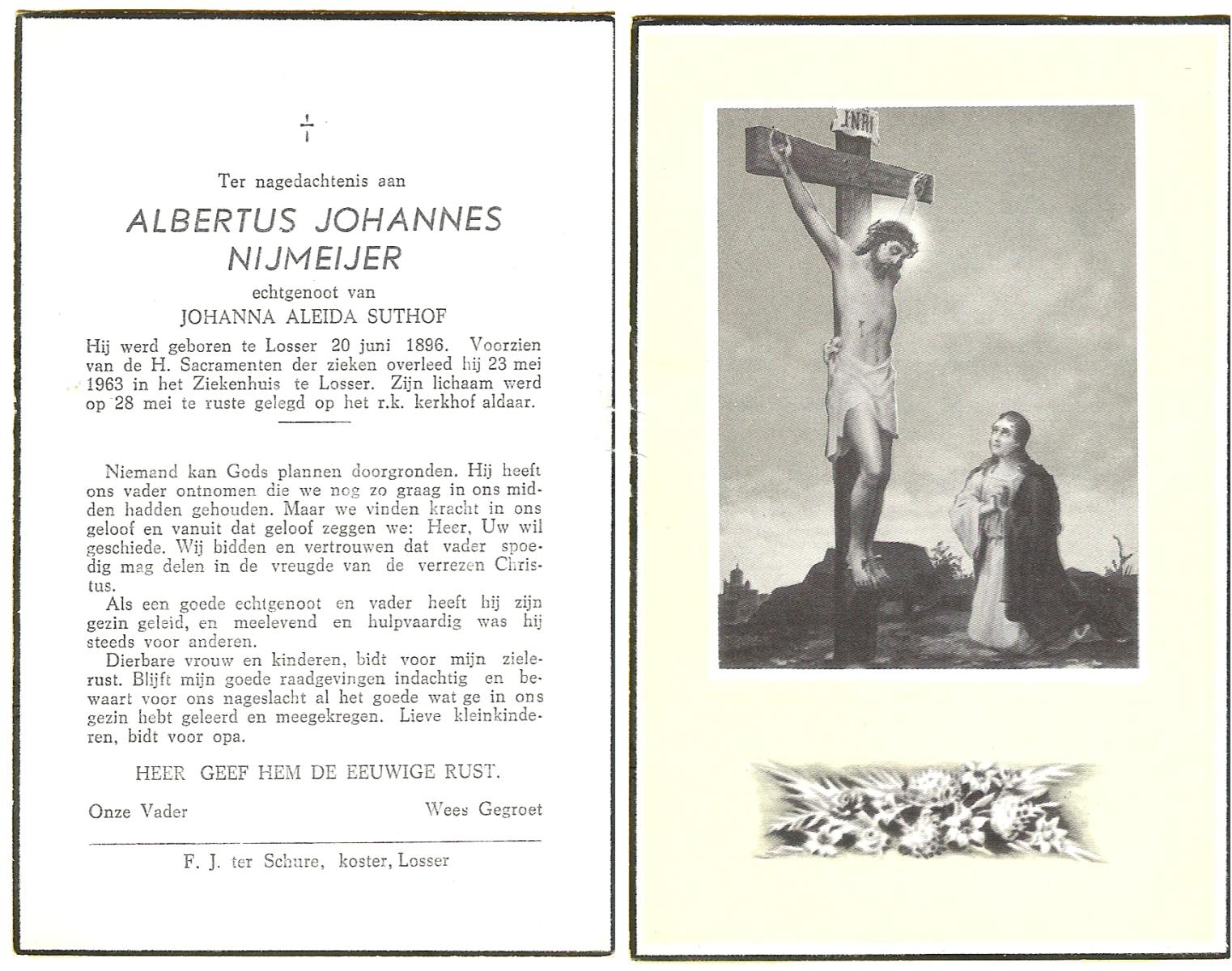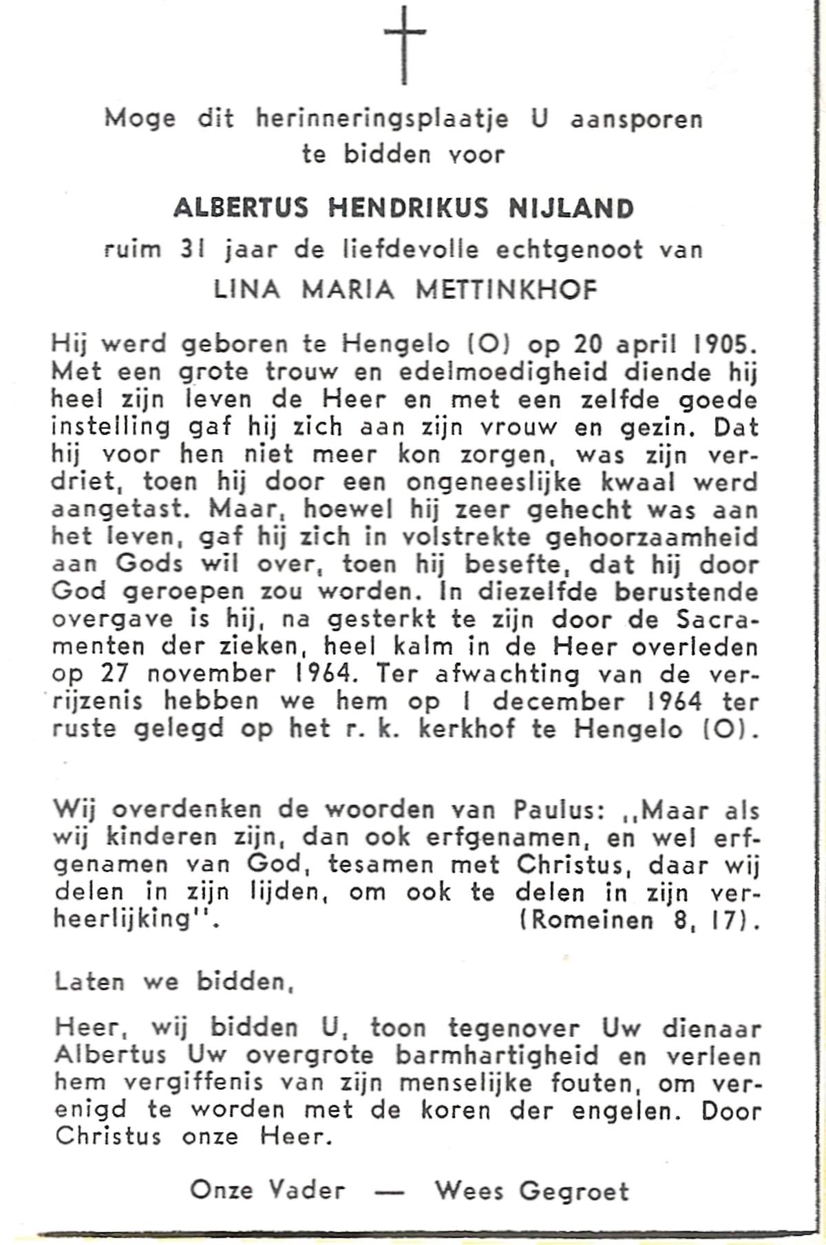 NIJLAND, Albertus Hendrikus, geboren op 20-4-1905 te Hengelo (O), overleden op 27-11-1964 op 59-jarige leeftijd, begraven op 1-12-1964 te Hengelo (Ov.).