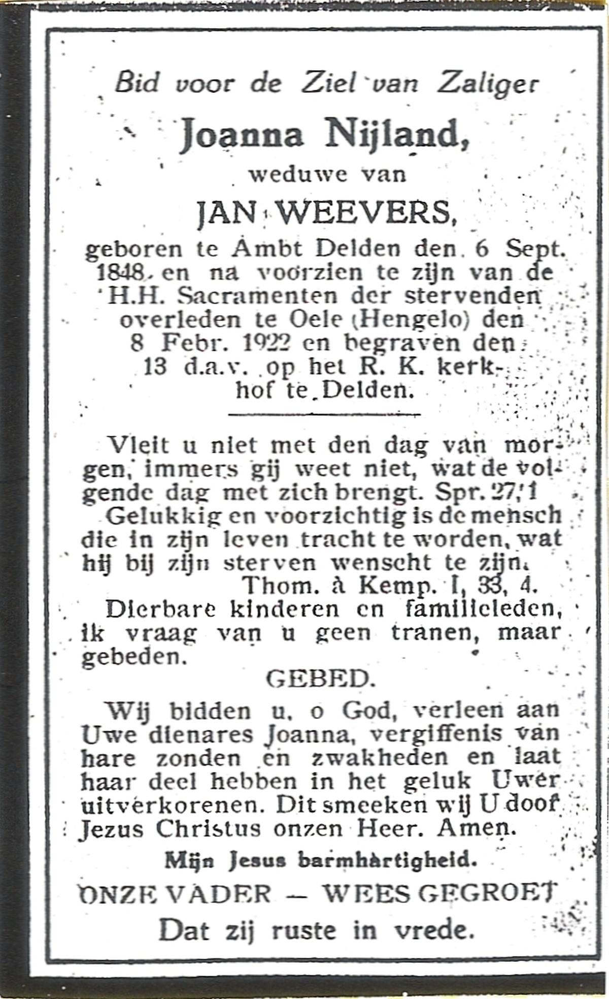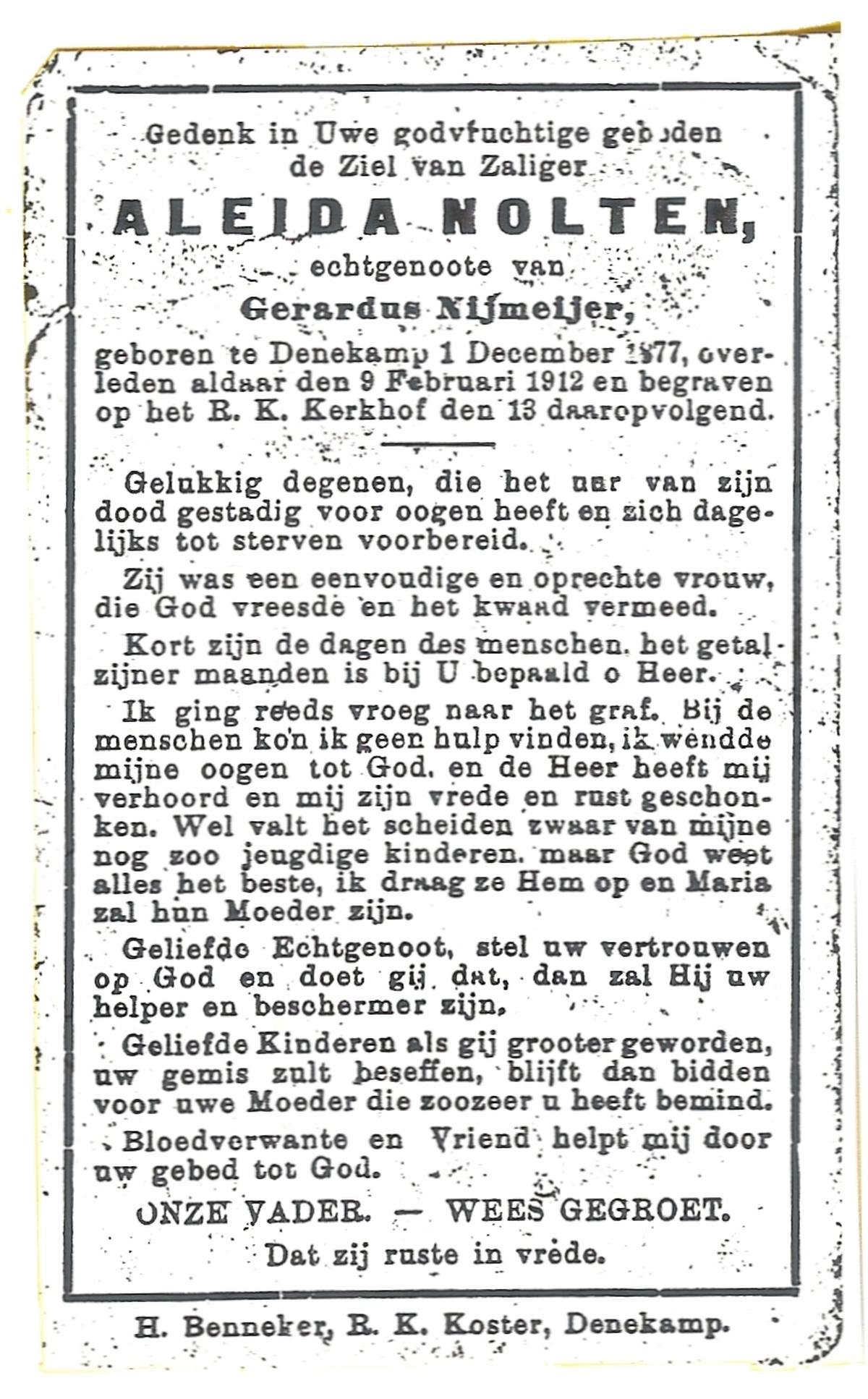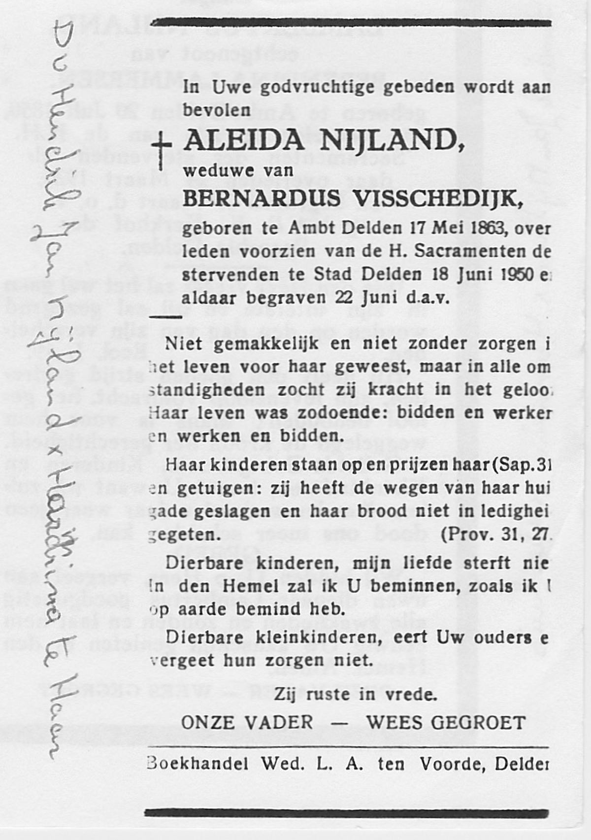 NIJLAND, Aleida, geboren op 17-05-1863 te Delden, Ambt, overleden op 18-6-1950 te Delden, Stad op 87-jarige leeftijd, begraven op 22-6-1950 te Delden, Stad.
