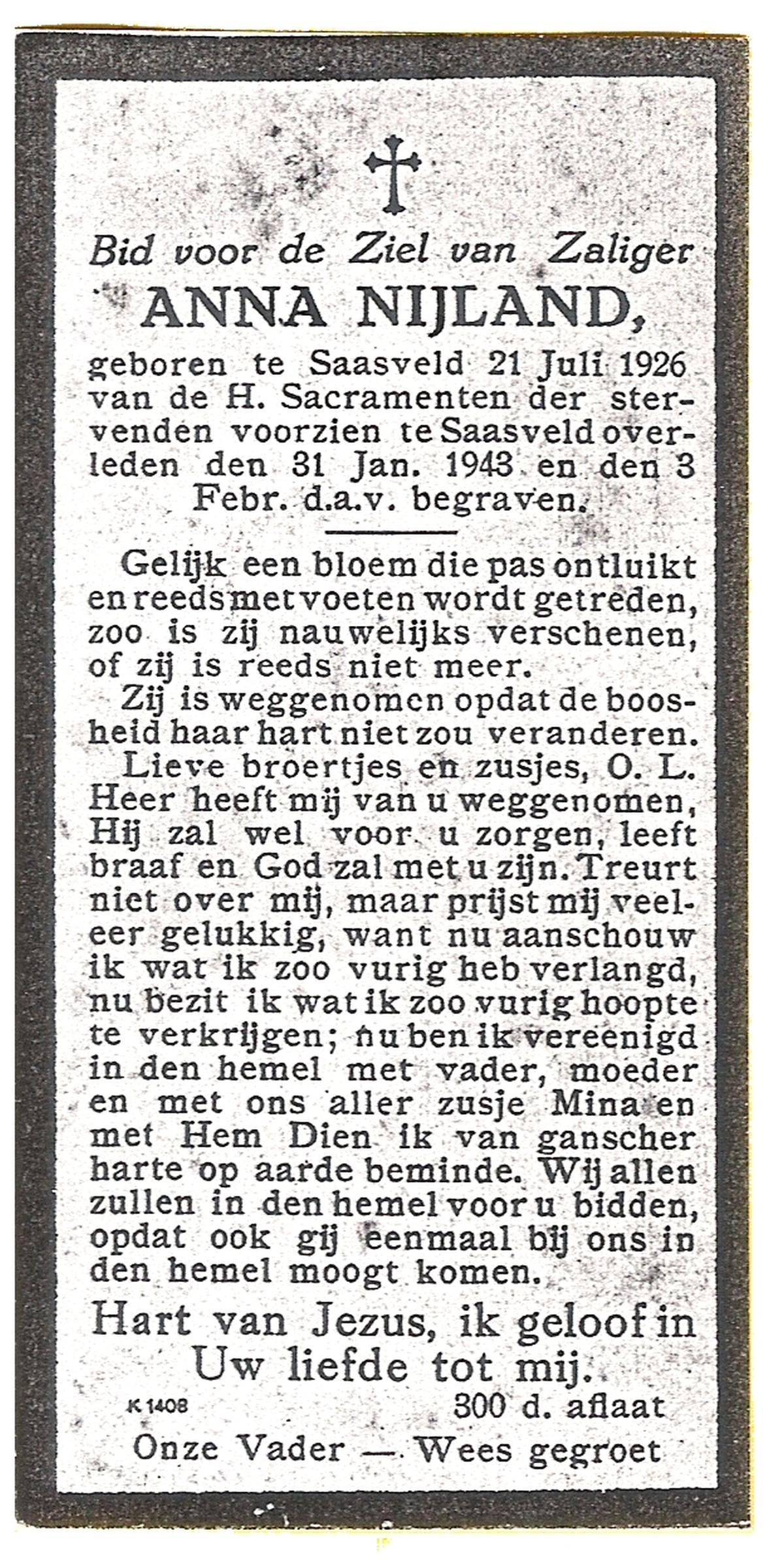 NIJLAND, Anna, geboren op 21-7-1926 te Saasveld, overleden op 31-1-1943 te Saasveld op 21-jarige leeftijd, begraven op 3-2-1943 te Saasveld.