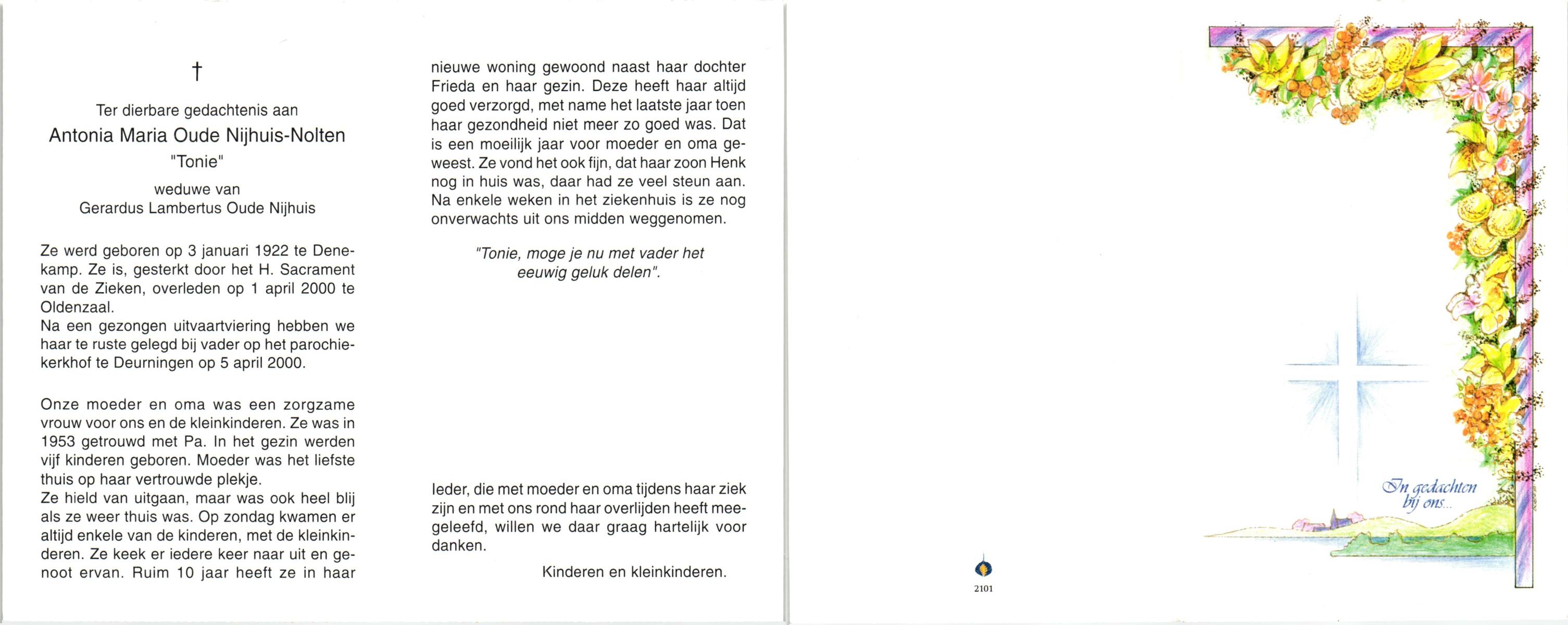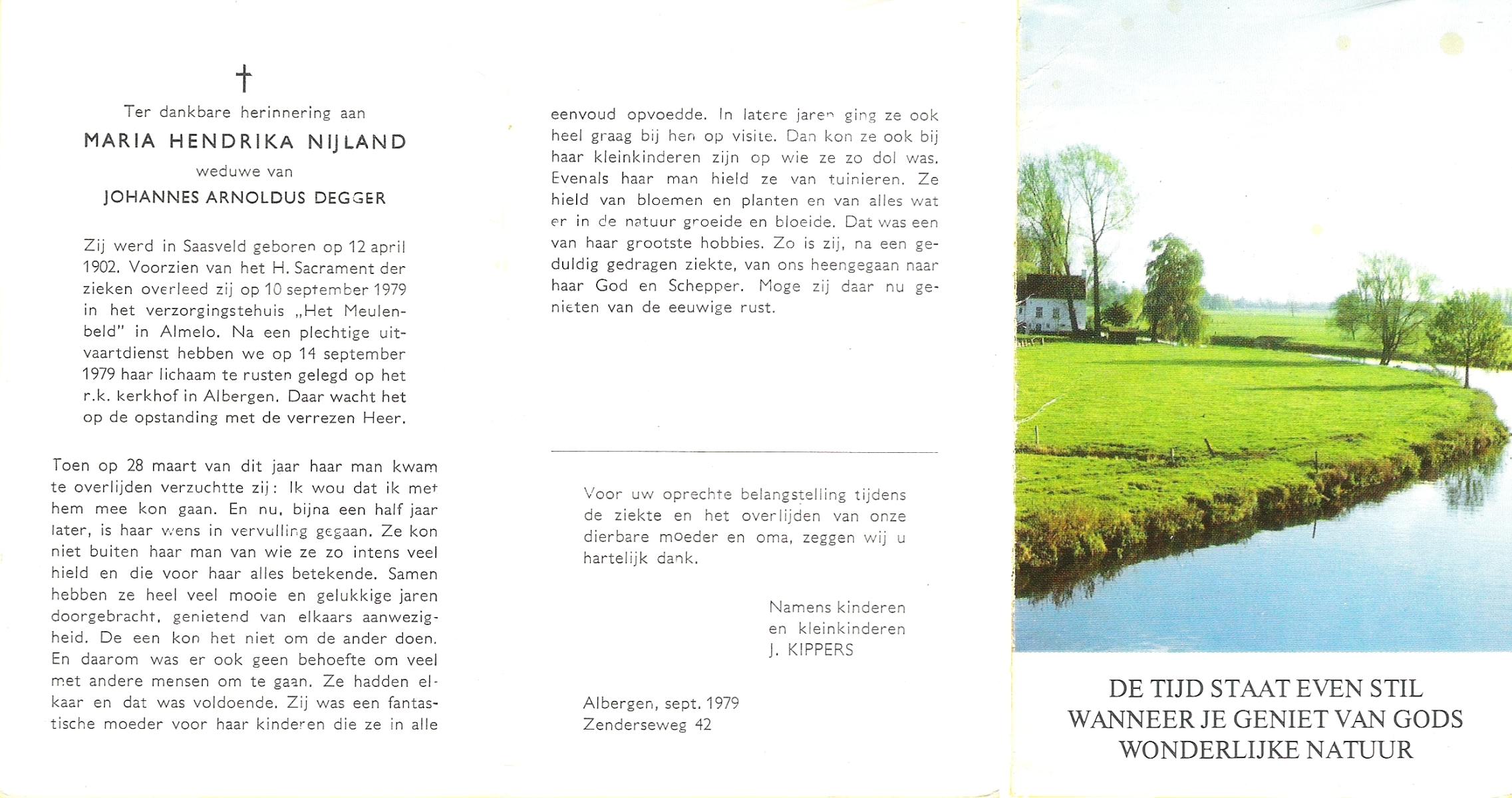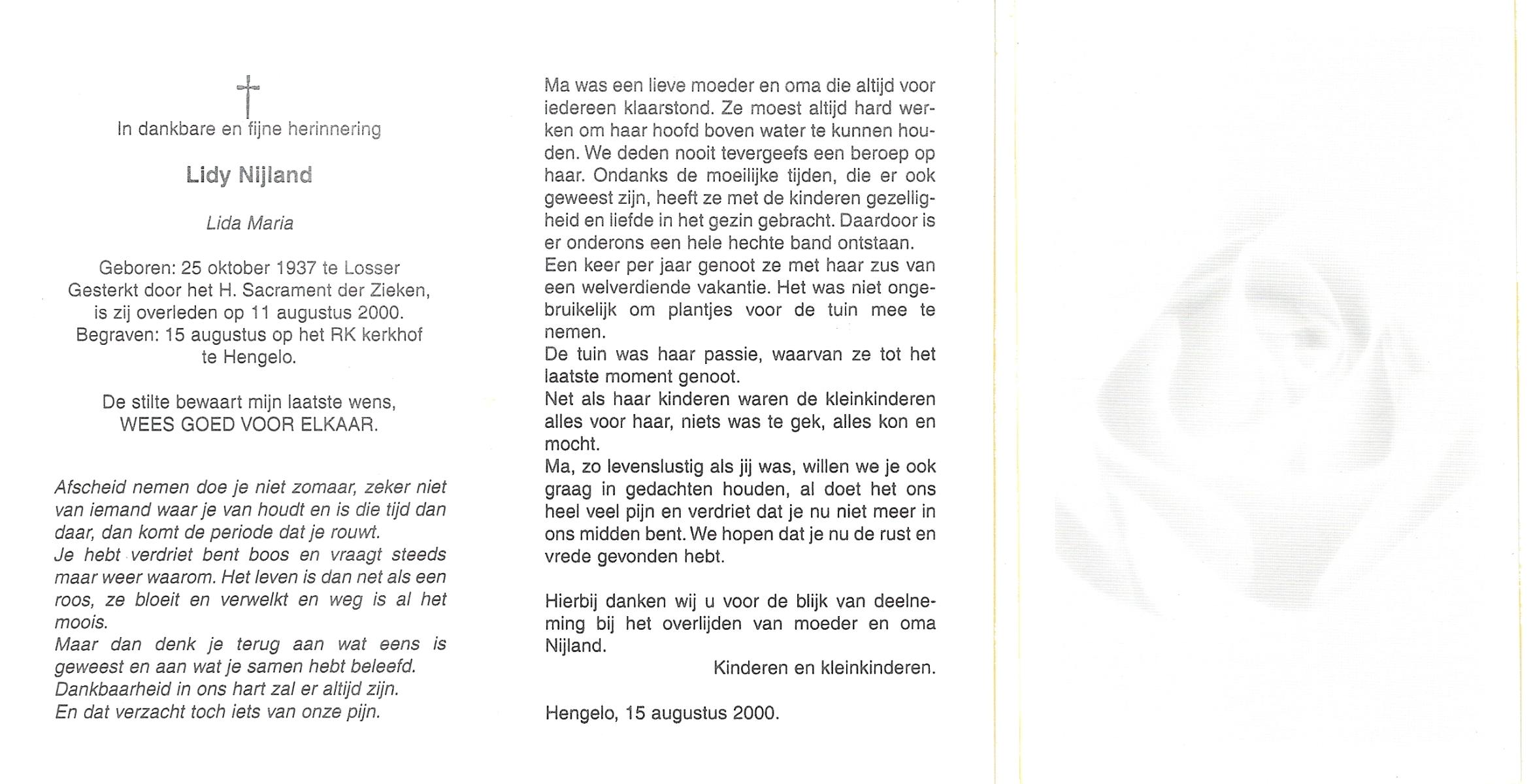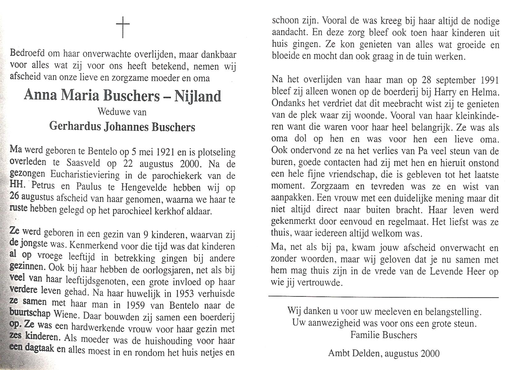 NIJLAND, Anna Maria, geboren op 5-5-1921 te Bentelo, overleden op 22-8-2000 te Saasveld op 79-jarige leeftijd, begraven op 26-8-2000 te Hengevelde.