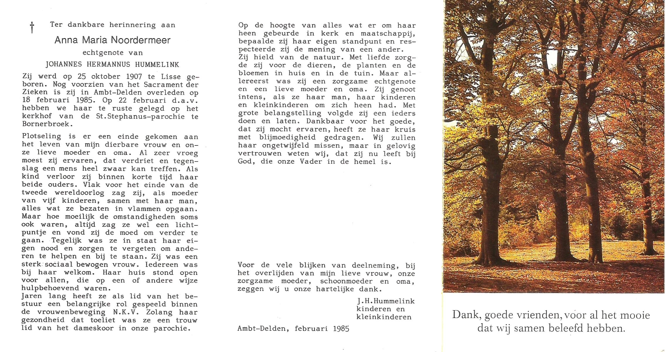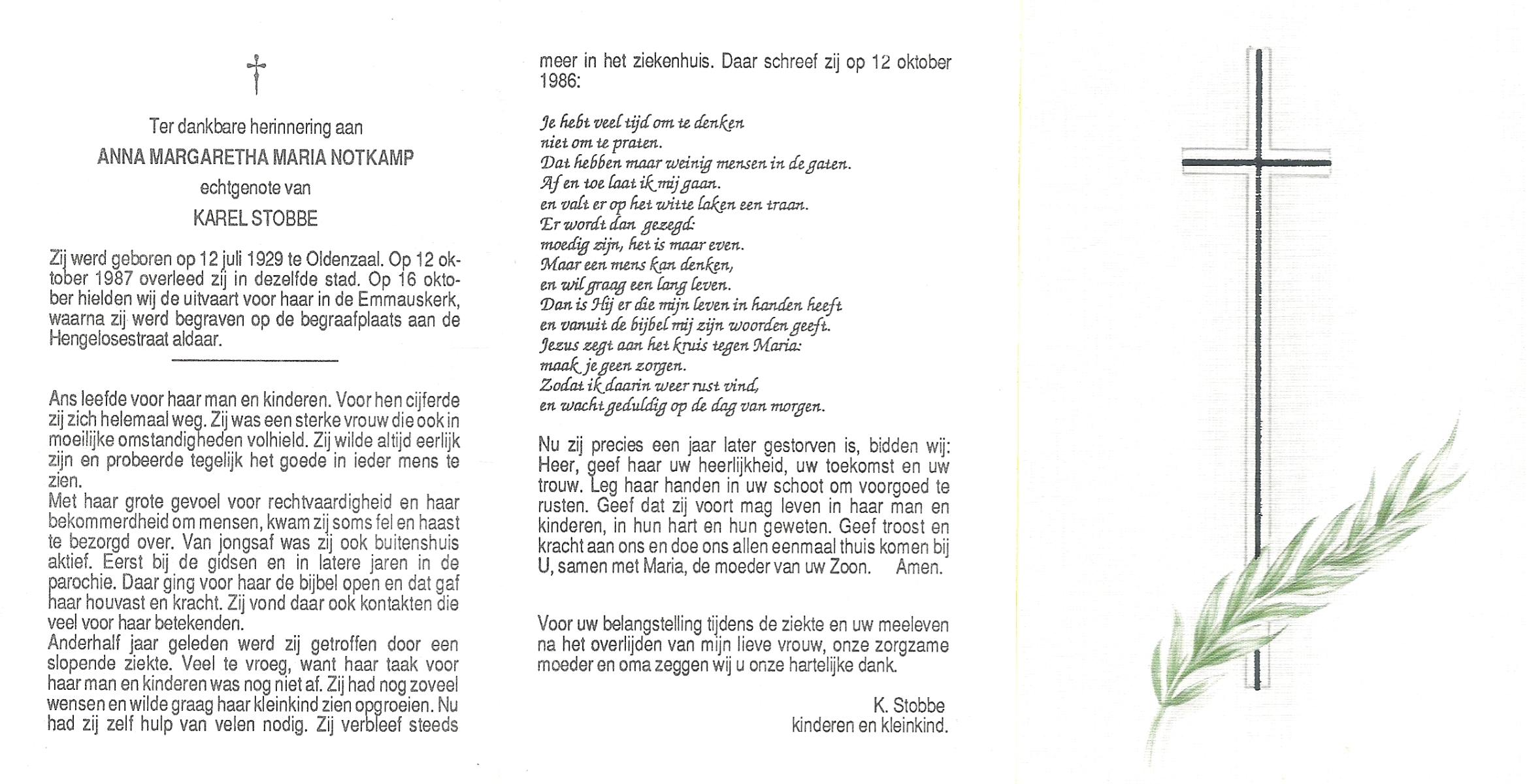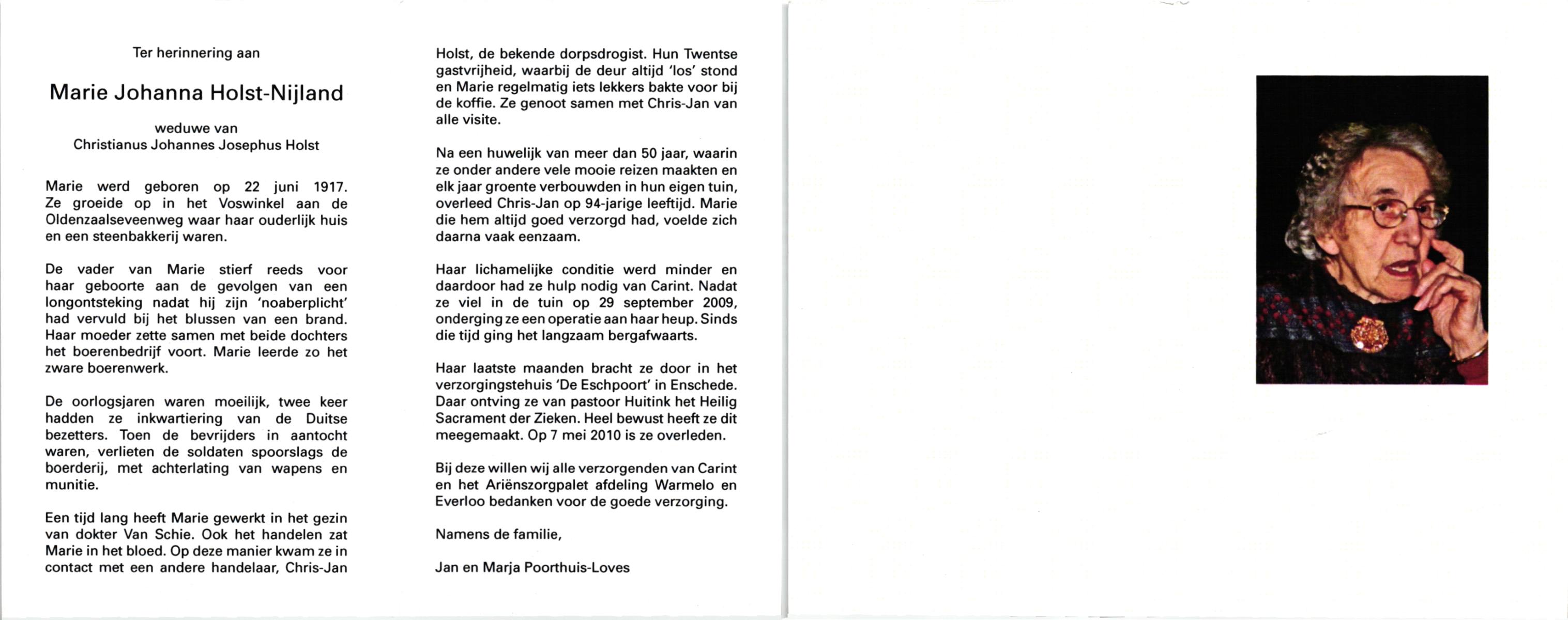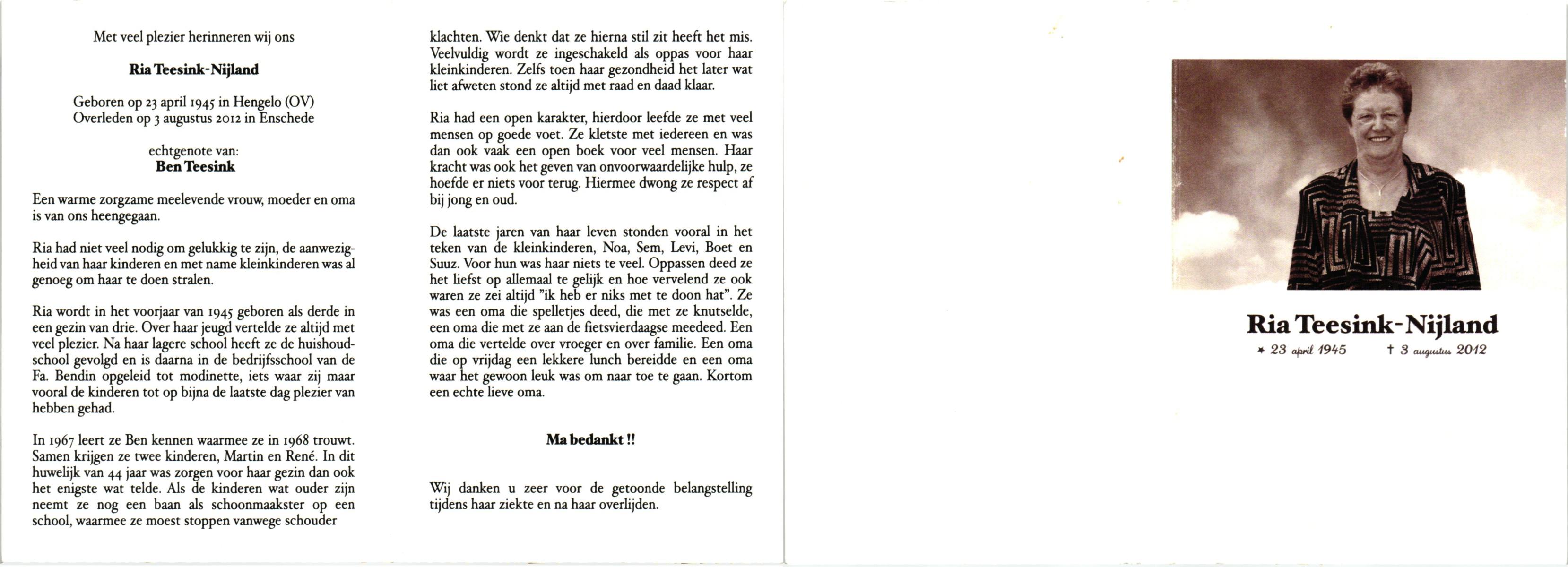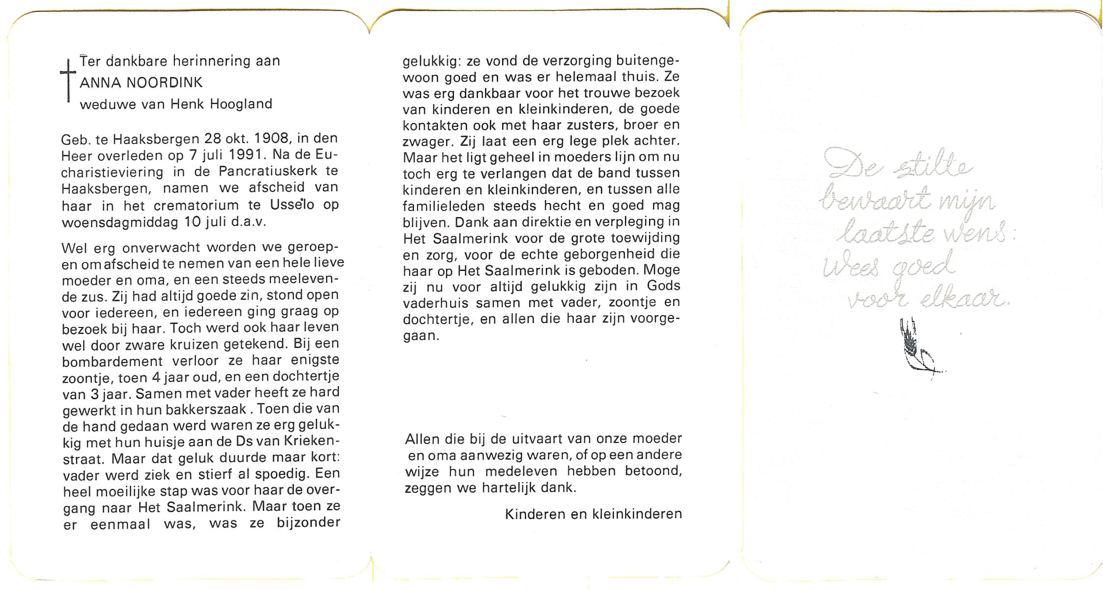 NIJLAND, Anna Maria, geboren op 5-5-1921 te Bentelo, overleden op 22-8-2000 te Saasveld op 79-jarige leeftijd, begraven op 26-8-2000 te Hengevelde.