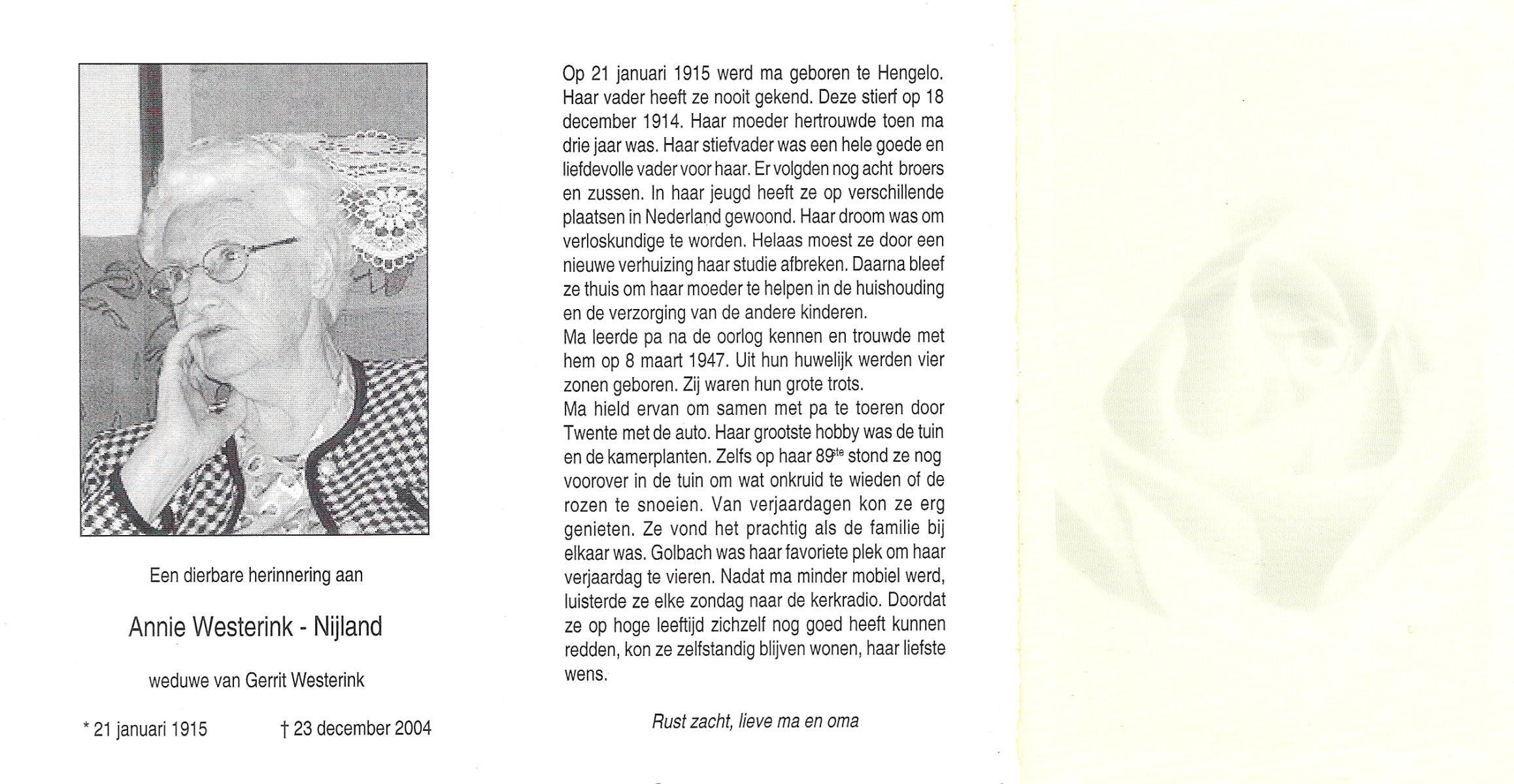 NIJLAND, Annie, geboren op 21-1-1915 te Hengelo (O), overleden op 23-12-2004 op 89-jarige leeftijd.