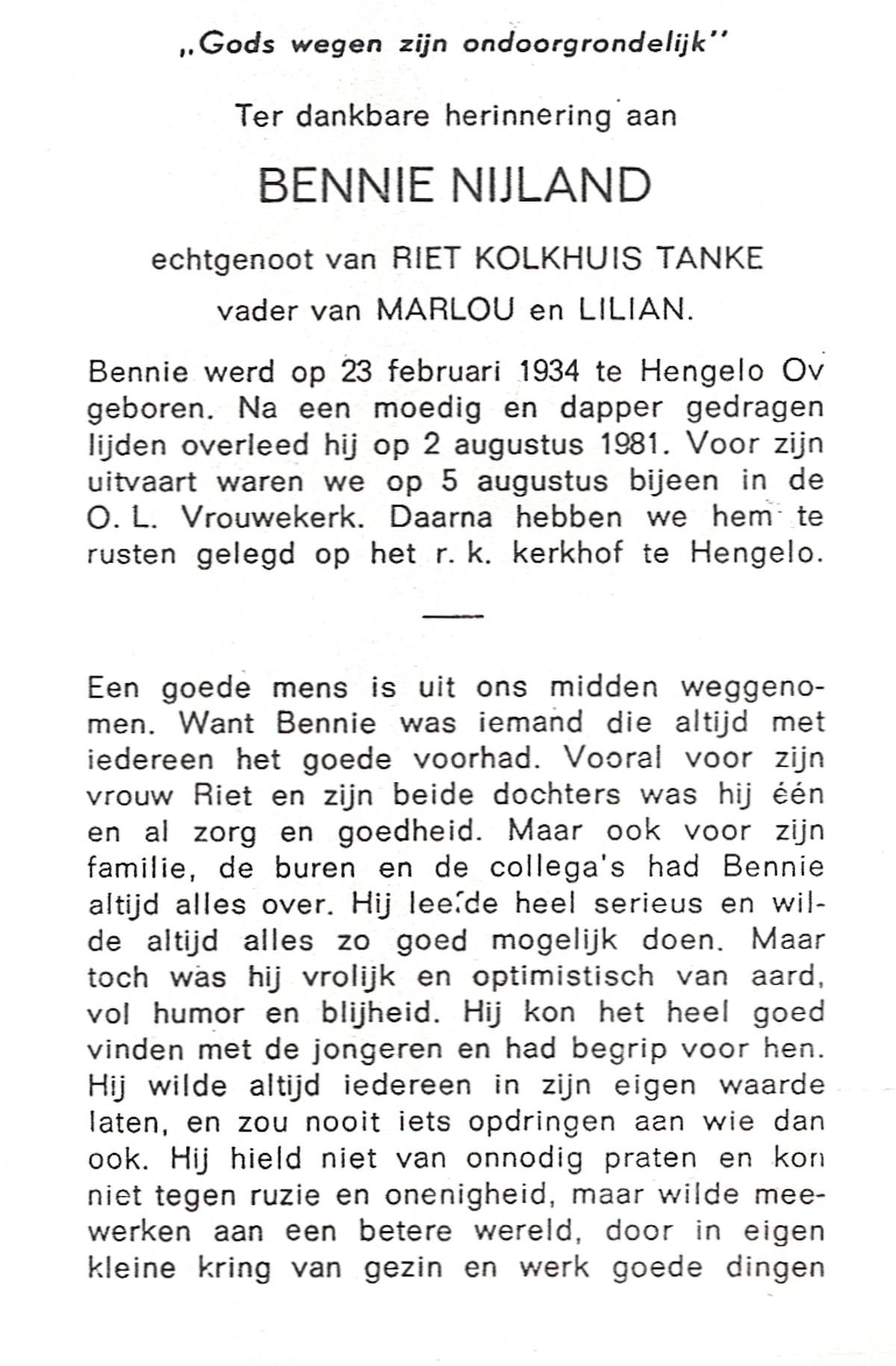 NIJLAND, Bennie, geboren op 23-2-1934 te Hengelo (O), overleden op 2-8-1981 op 47-jarige leeftijd, begraven op 5-8-1981 te Hengelo (Ov.).