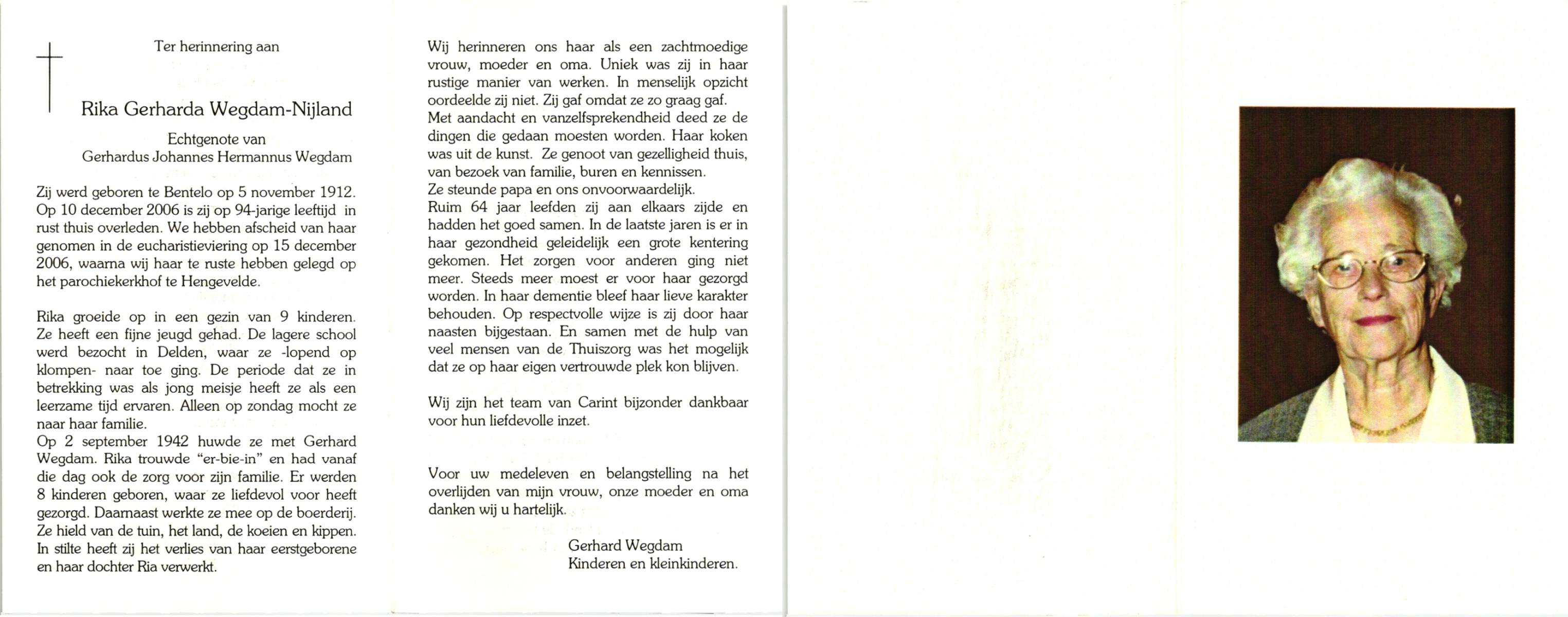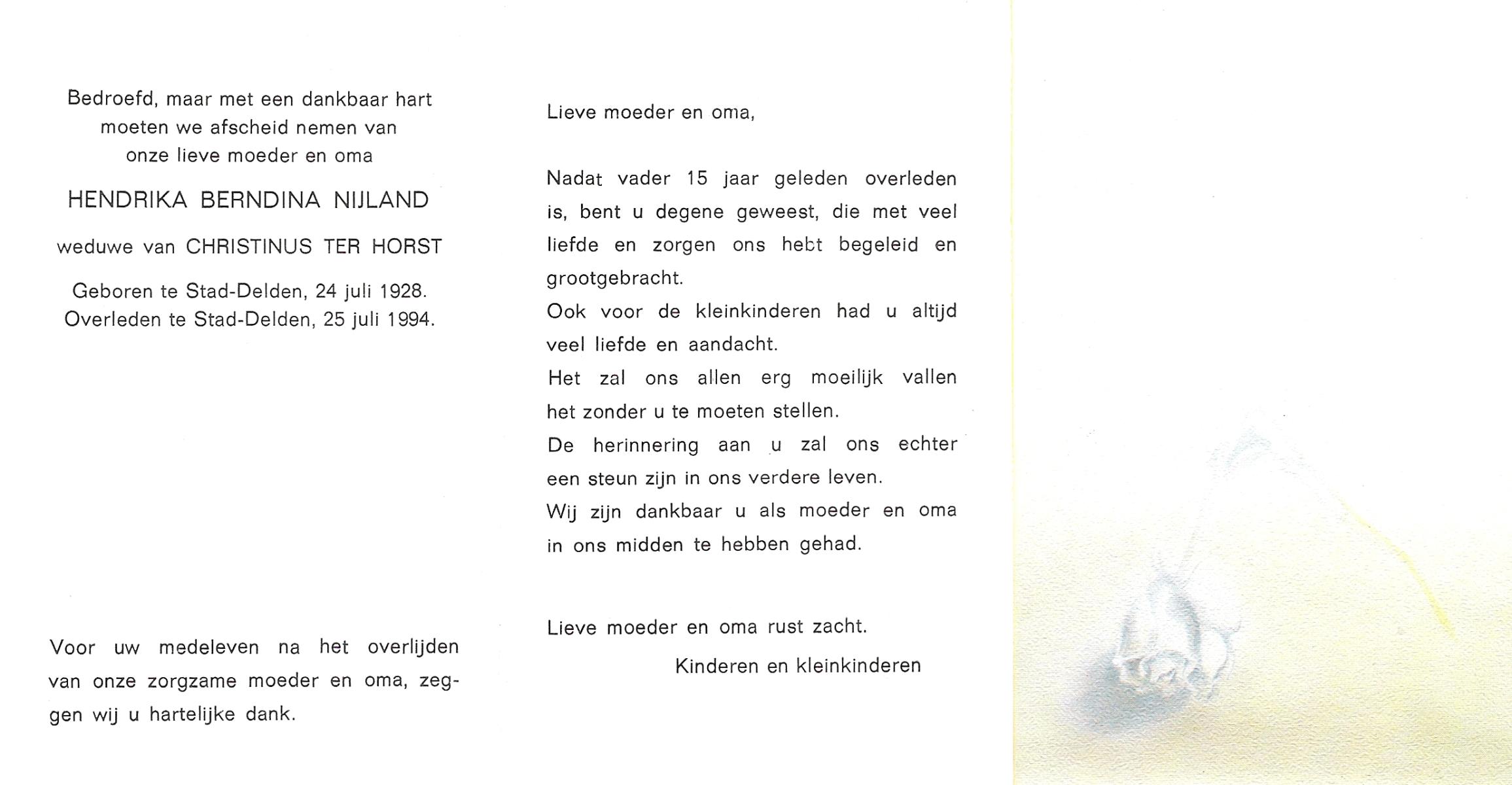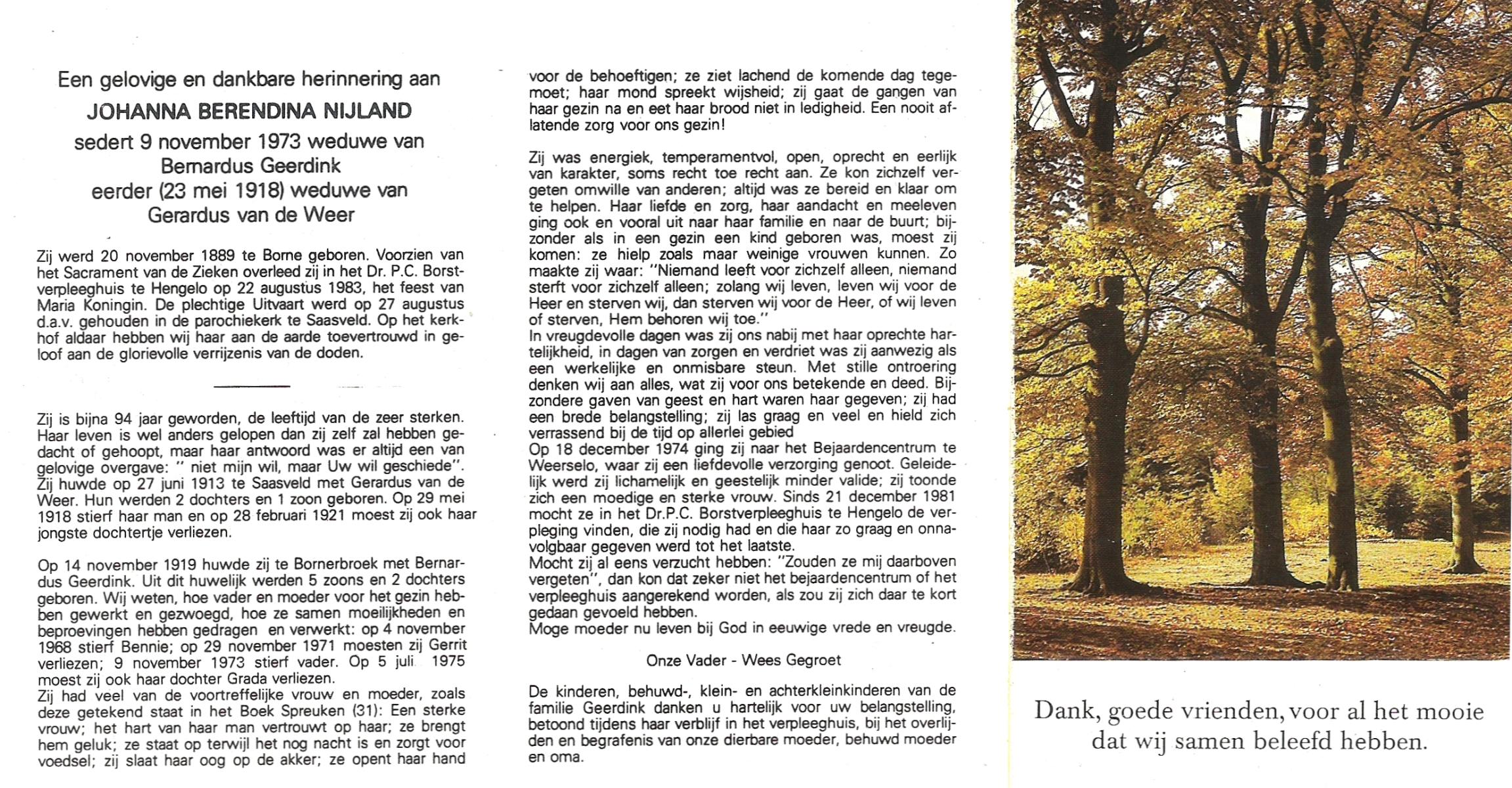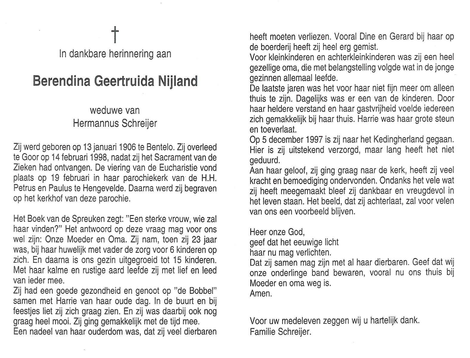 NIJLAND, Berendina Geertruida, geboren op 13-1-1906 te Bentelo, overleden op 14-2-1998 te Goor op 92-jarige leeftijd, begraven op 19-2-1998 te Hengevelde.