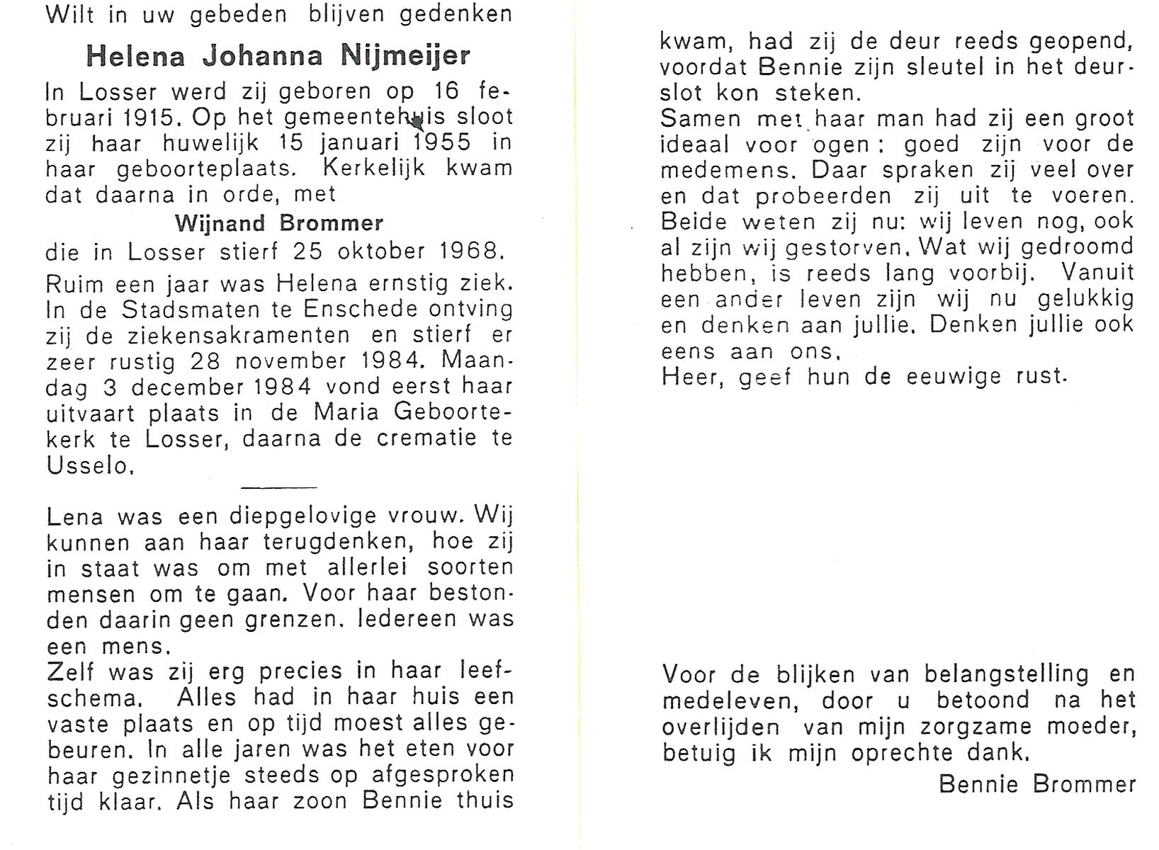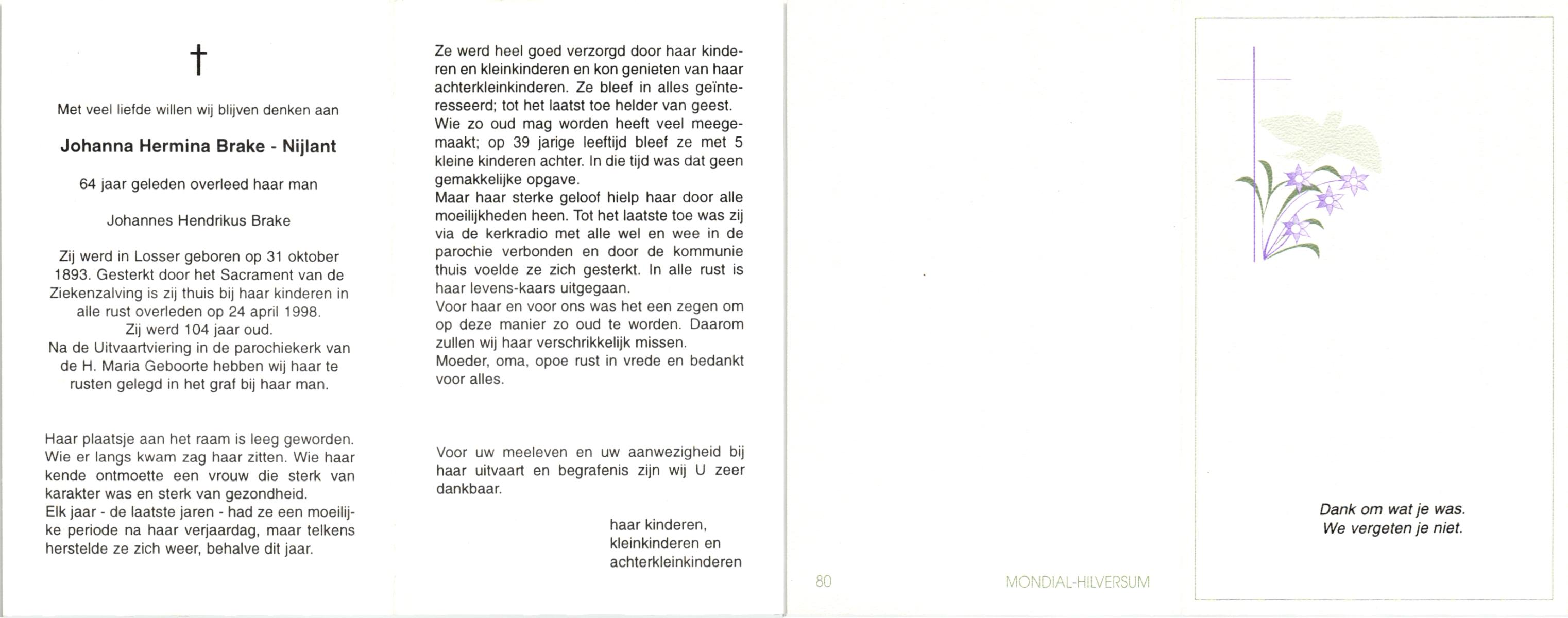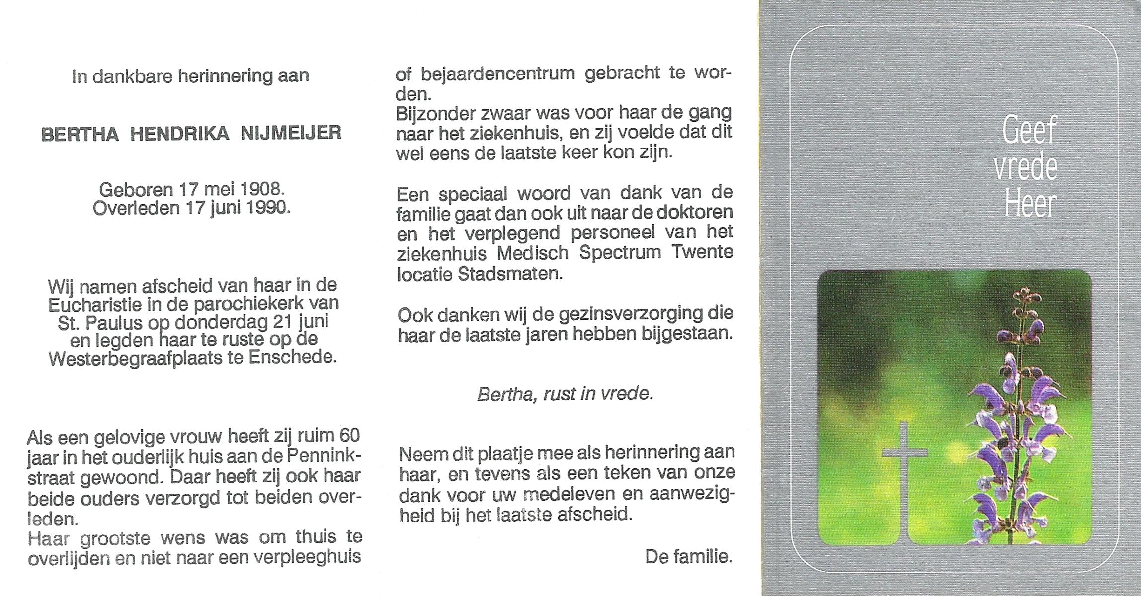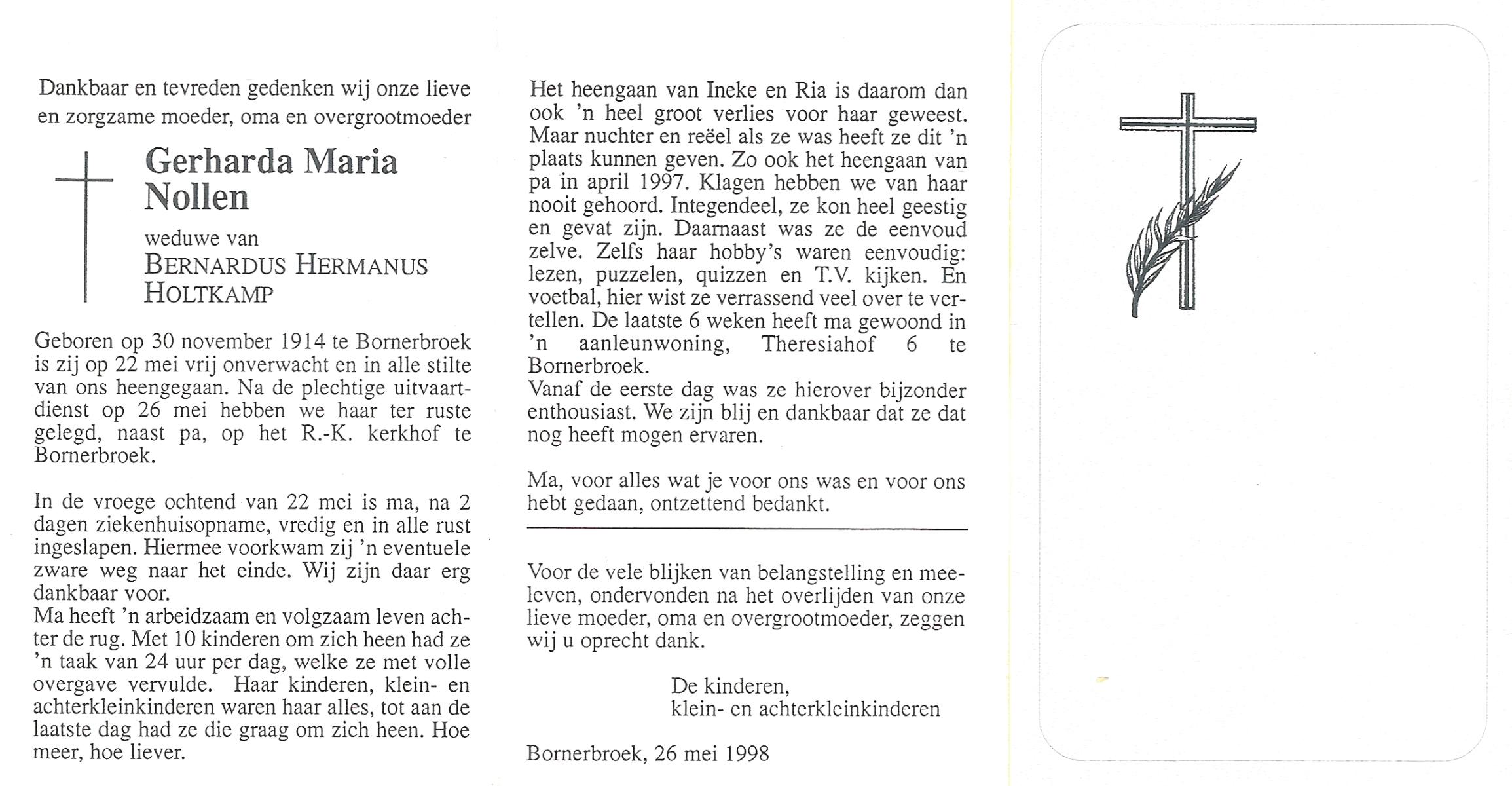 NIJLAND, Berendina Geertruida, geboren op 13-1-1906 te Bentelo, overleden op 14-2-1998 te Goor op 92-jarige leeftijd, begraven op 19-2-1998 te Hengevelde.
