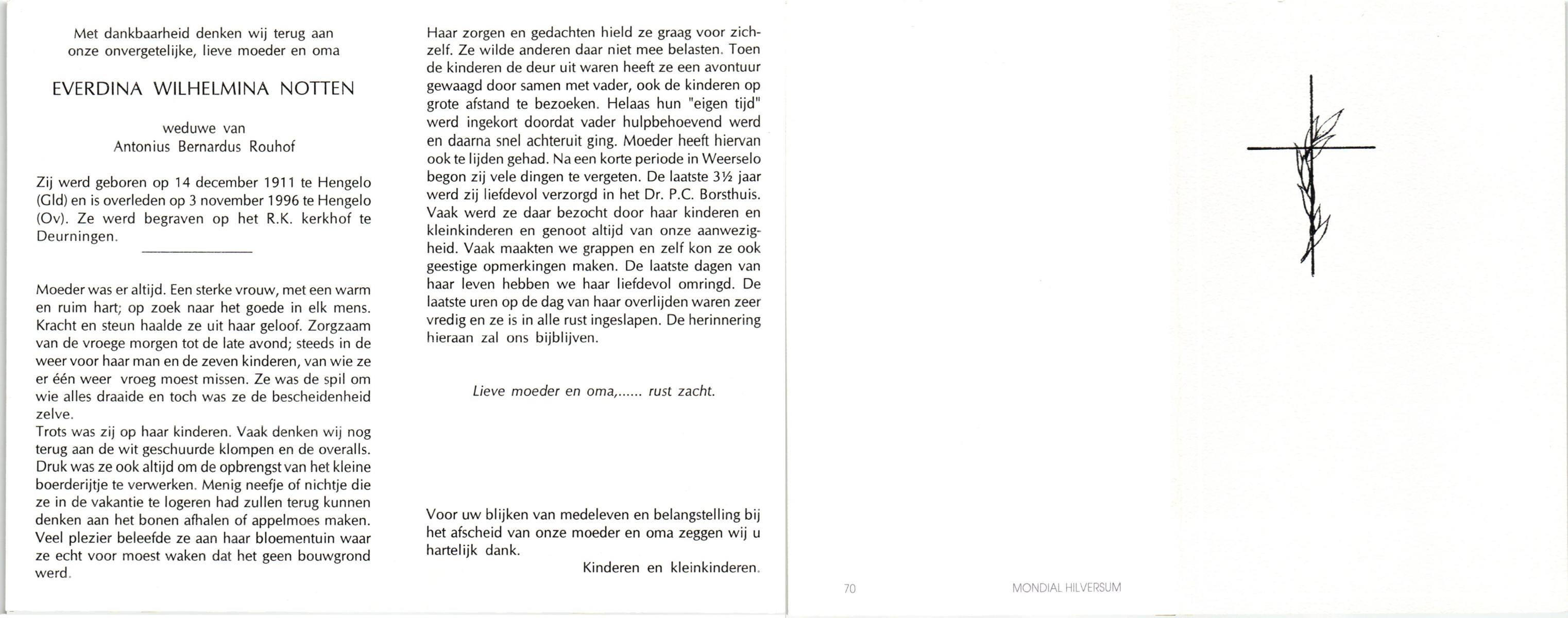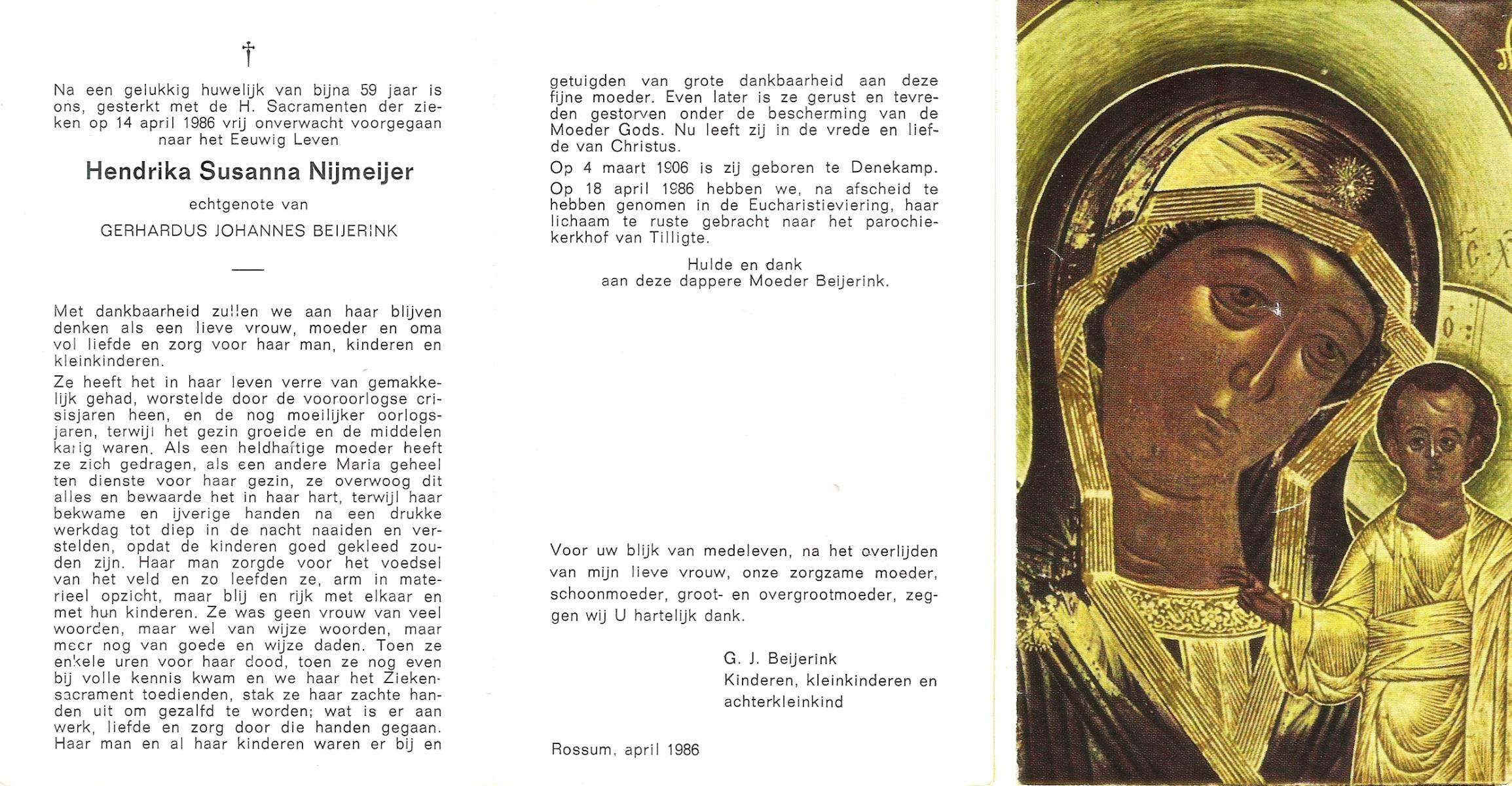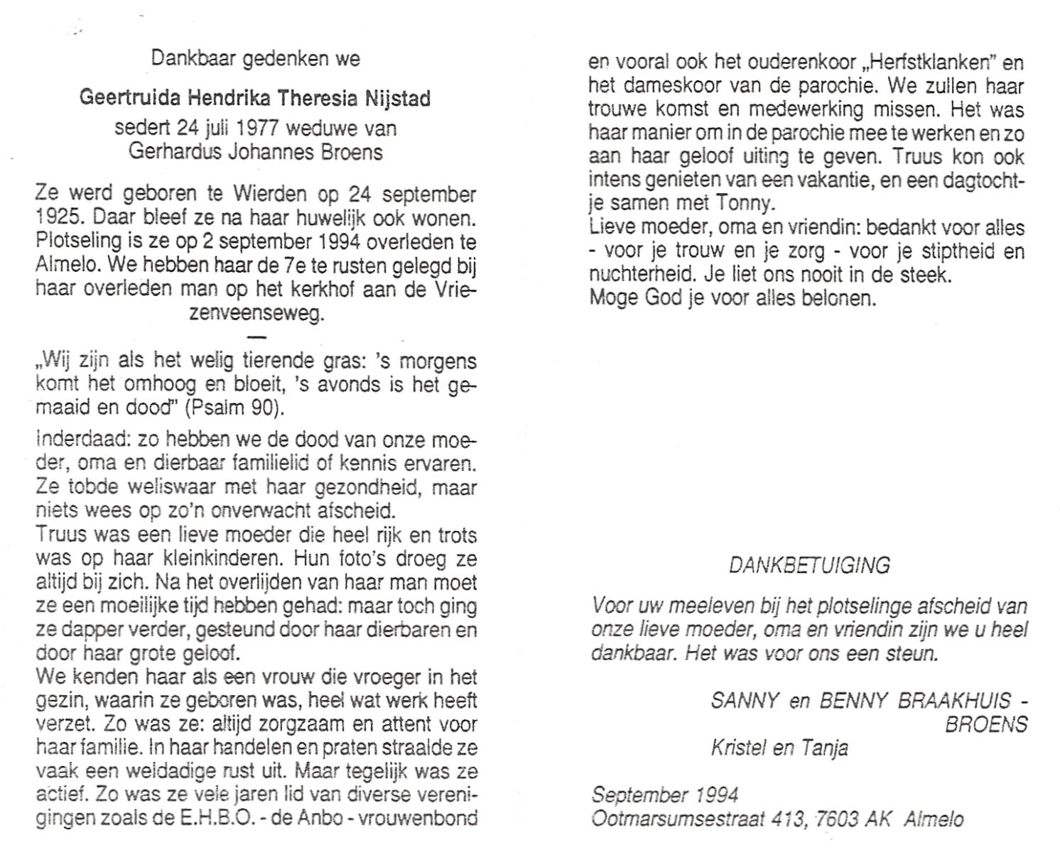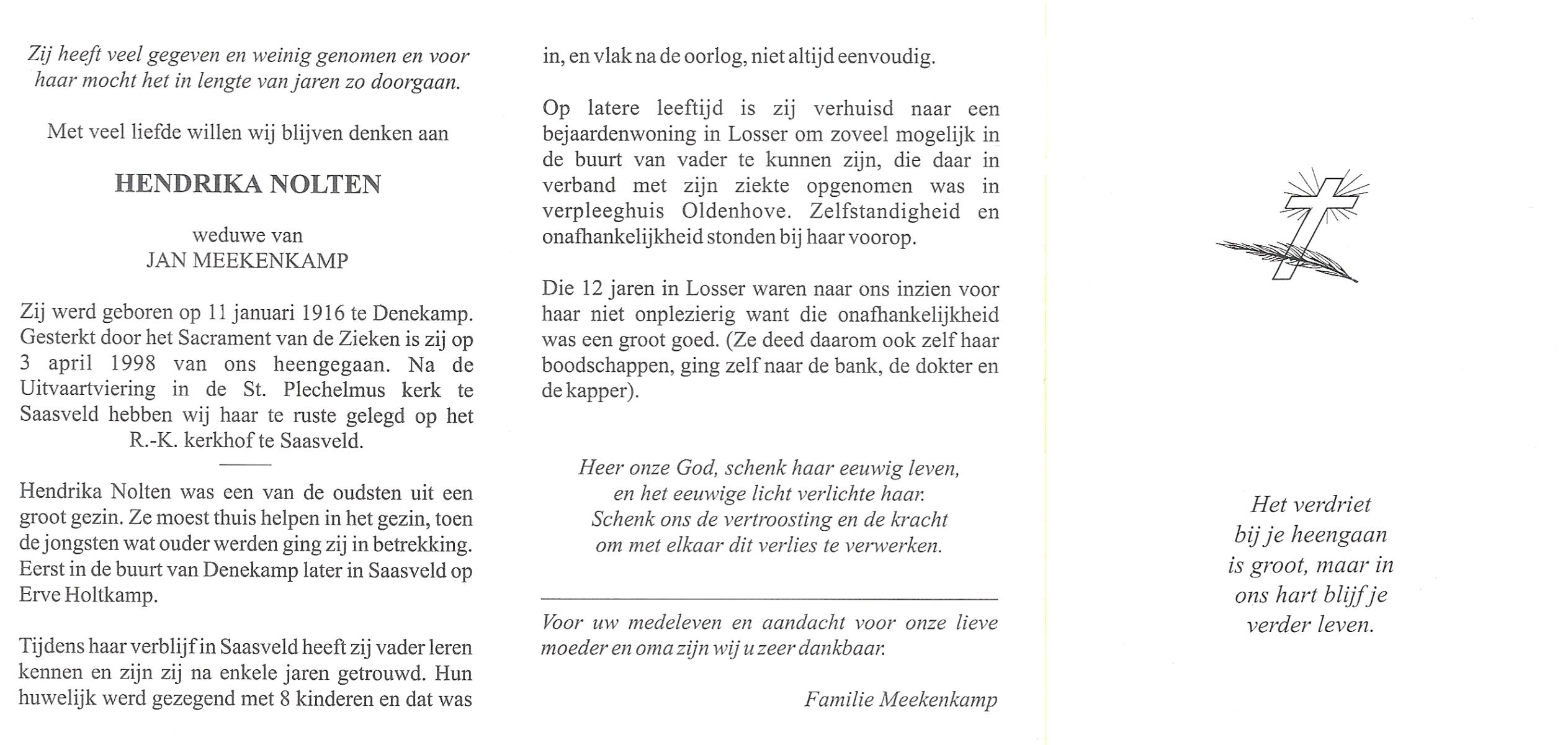 NIJLAND, Berendina Geertruida, geboren op 13-1-1906 te Bentelo, overleden op 14-2-1998 te Goor op 92-jarige leeftijd, begraven op 19-2-1998 te Hengevelde.