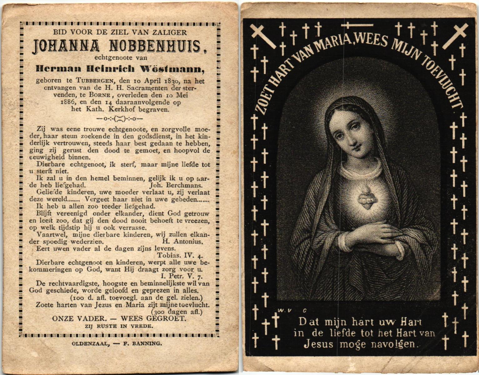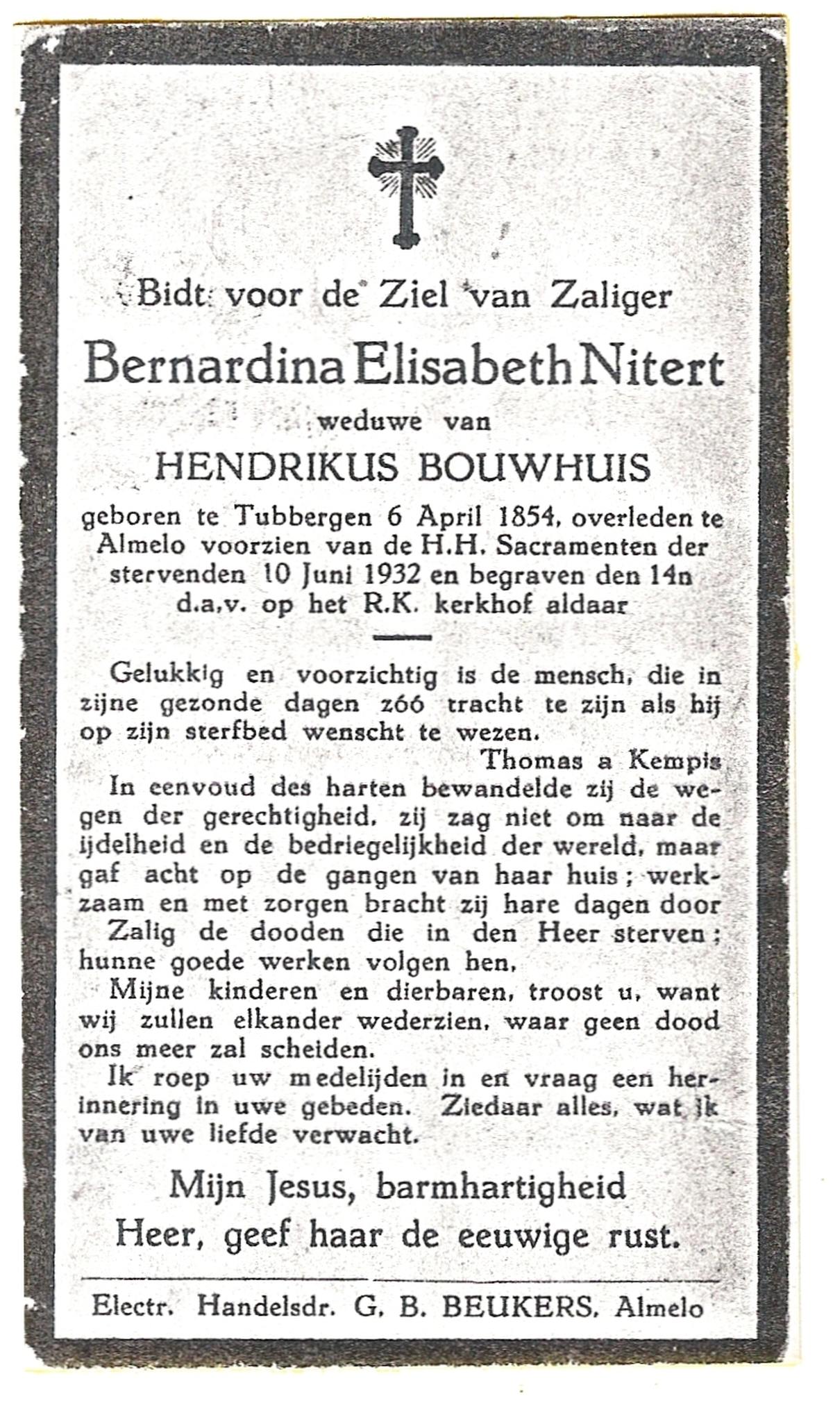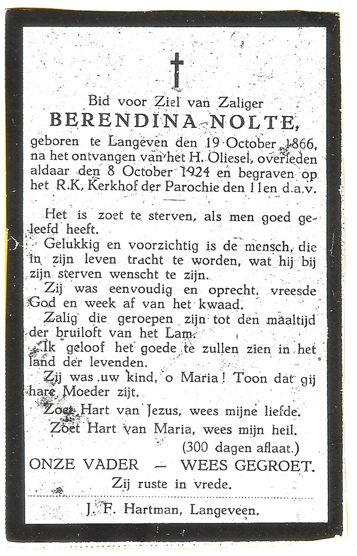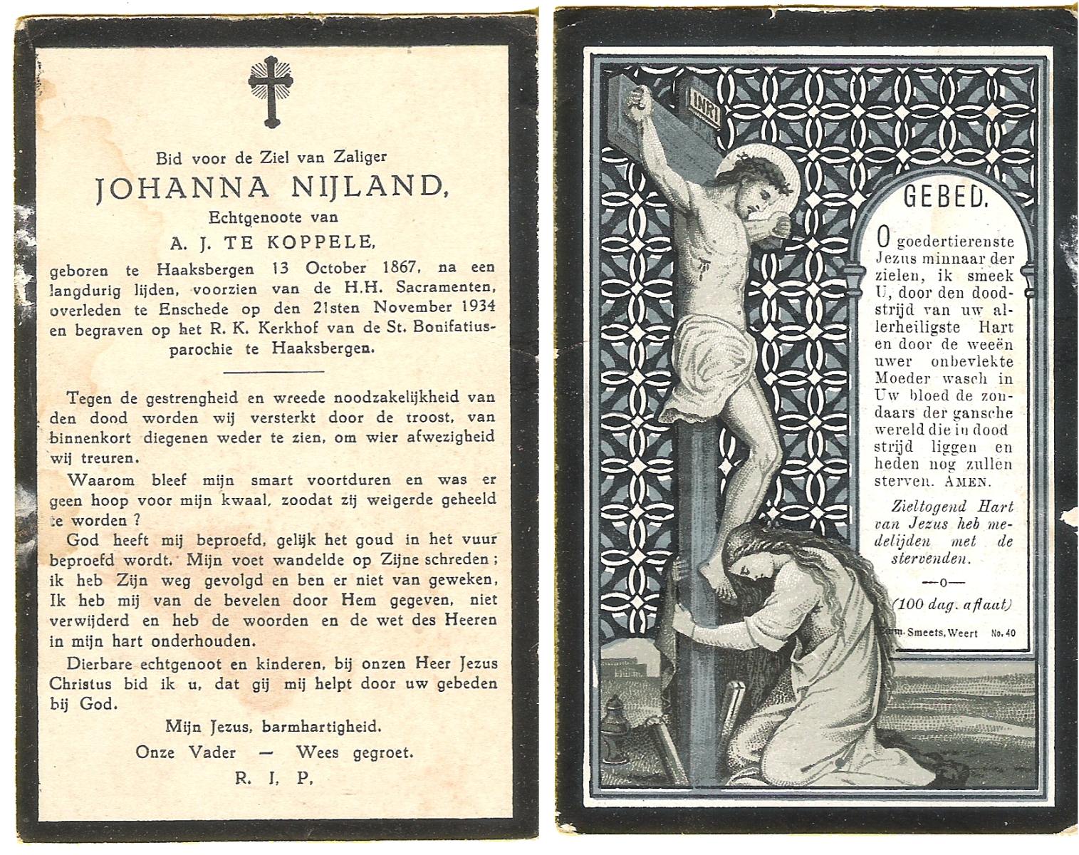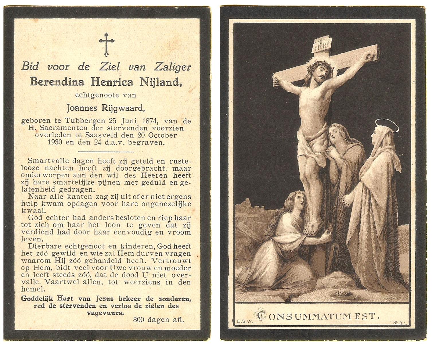 NIJLAND, Berendina Henrica, geboren op 25-06-1874 te Tubbergen, overleden op 20-10-1930 te Saasveld op 56-jarige leeftijd, begraven op 24-10-1930 te Saasveld.