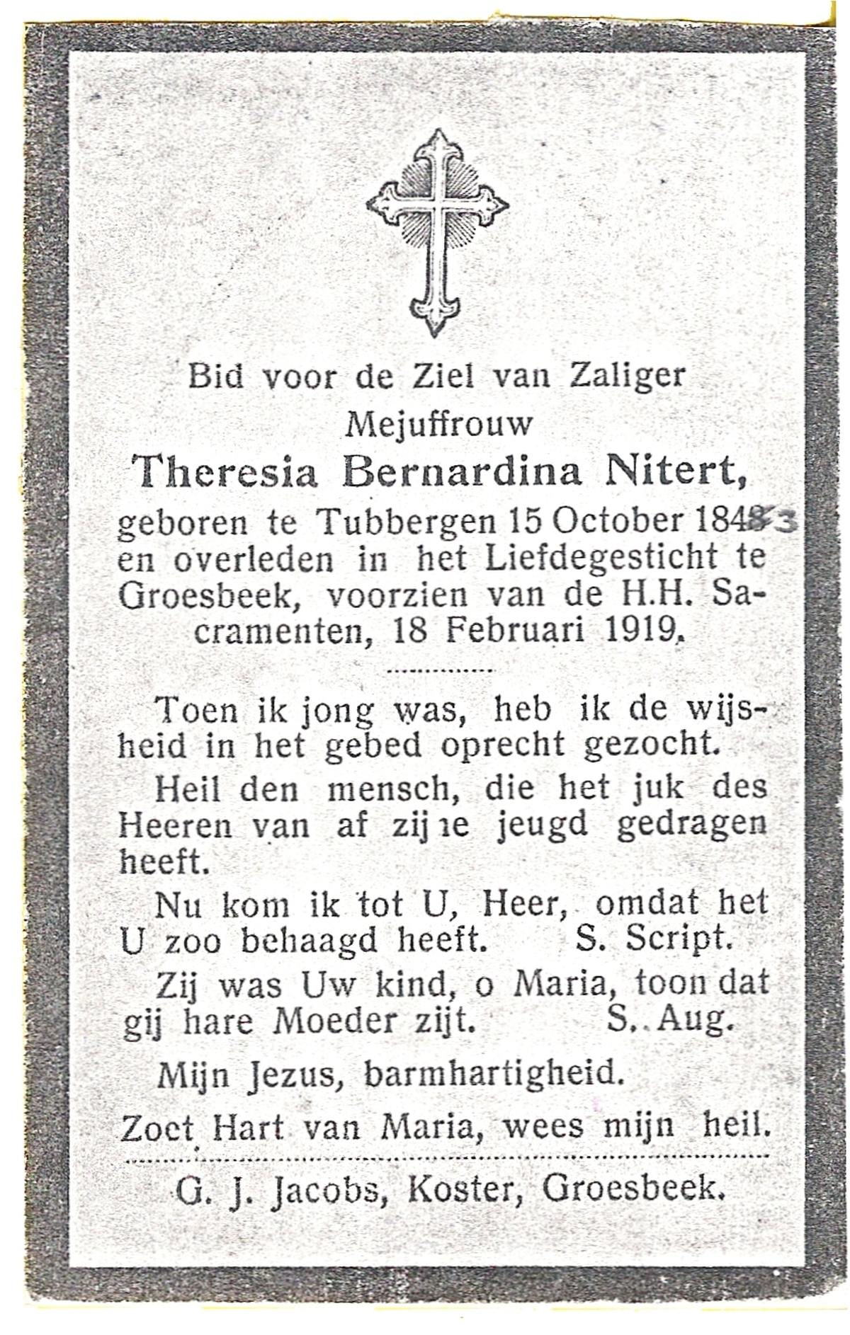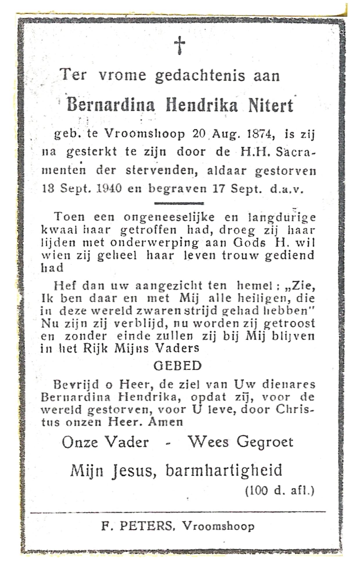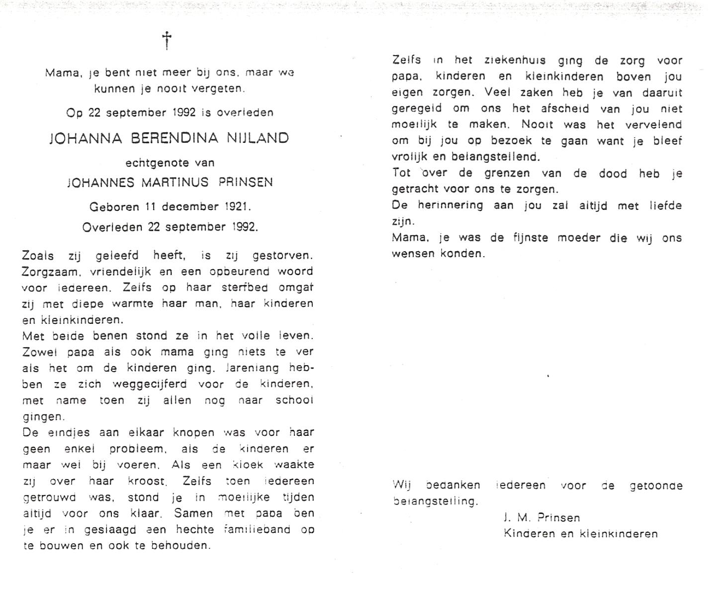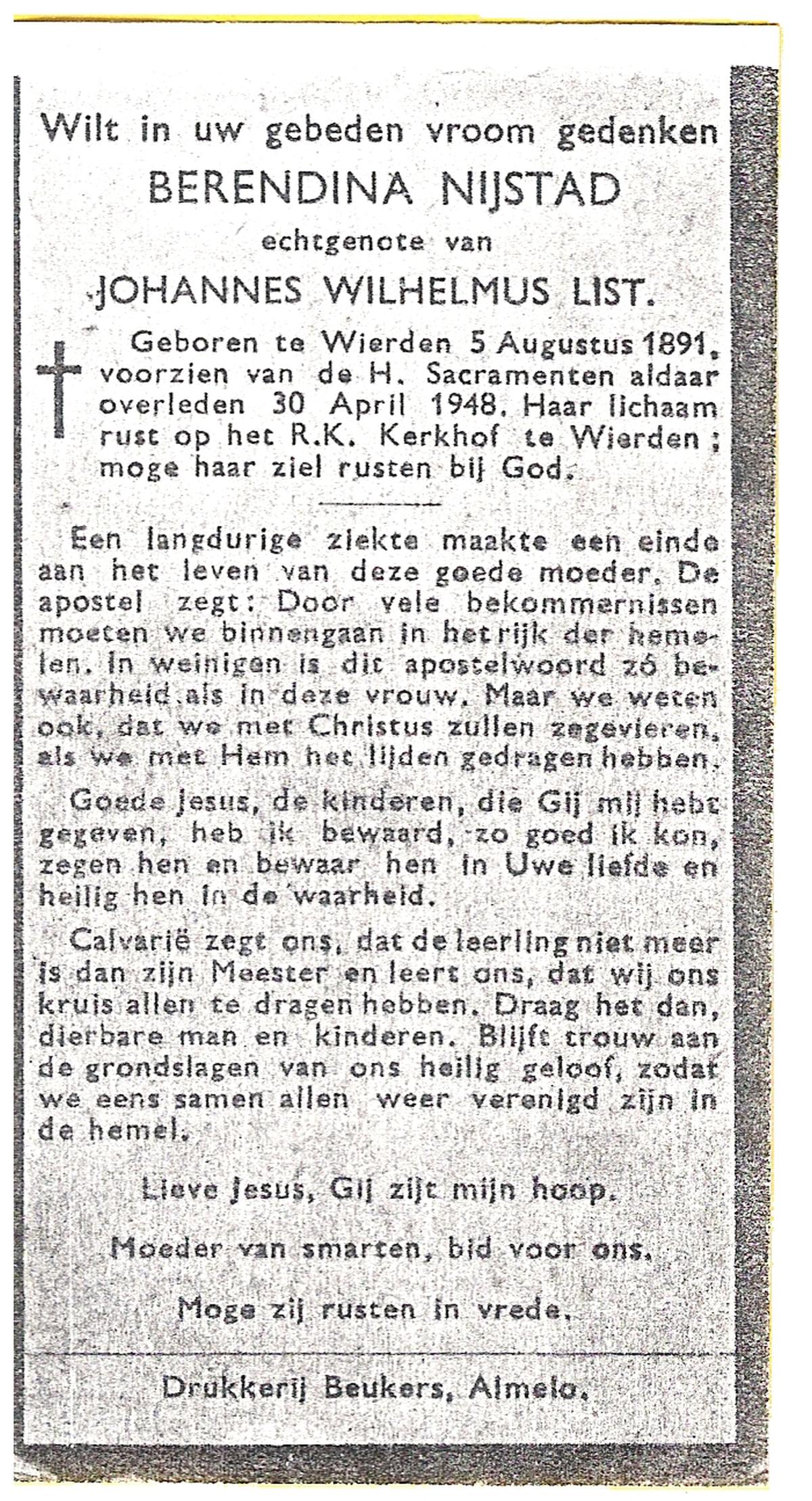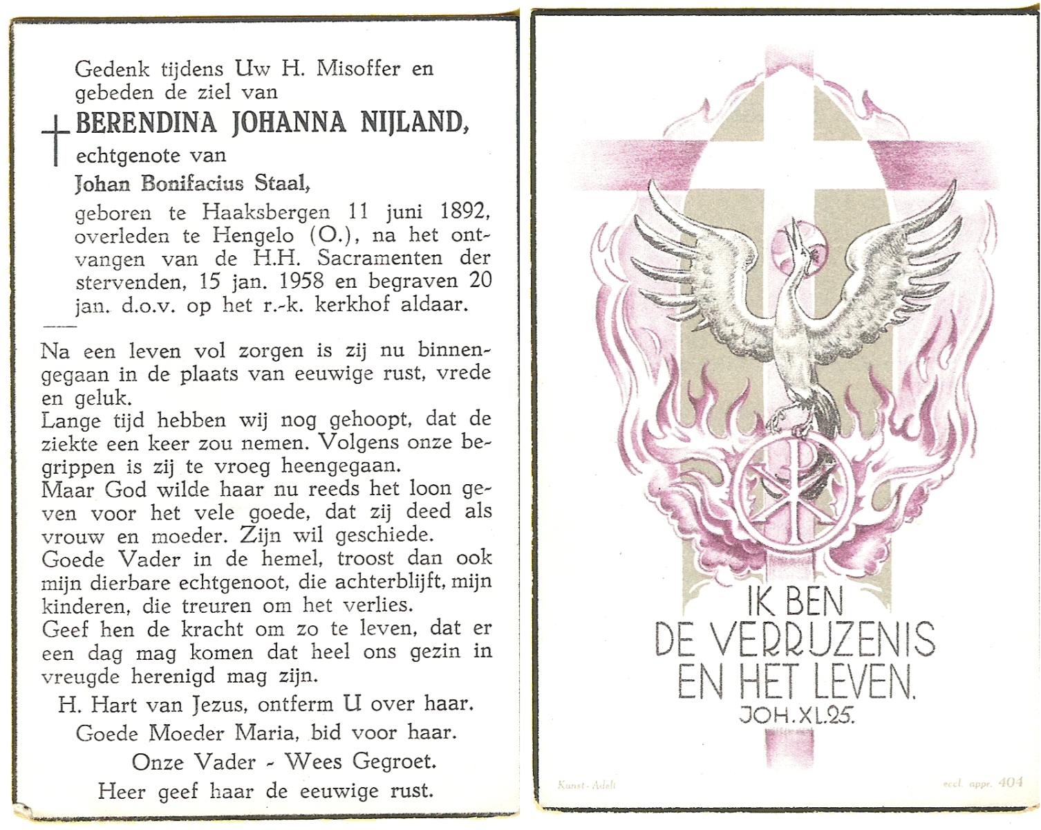 NIJLAND, Berendina Johanna, geboren op 11-06-1892 te Haaksbergen, overleden op 15-1-1958 te Hengelo (Ov.) op 65-jarige leeftijd, begraven op 20-1-1958 te Hengelo (Ov.).