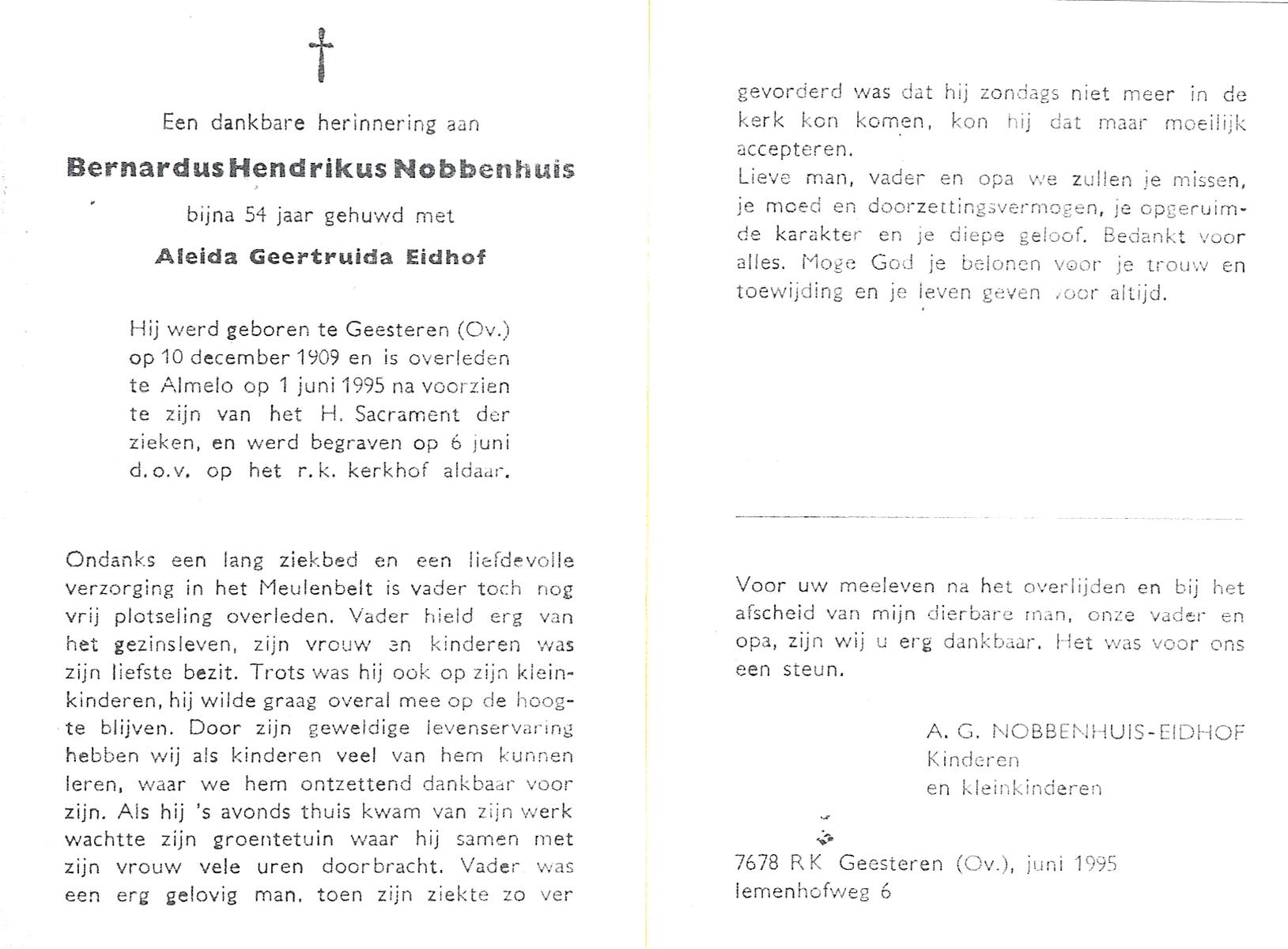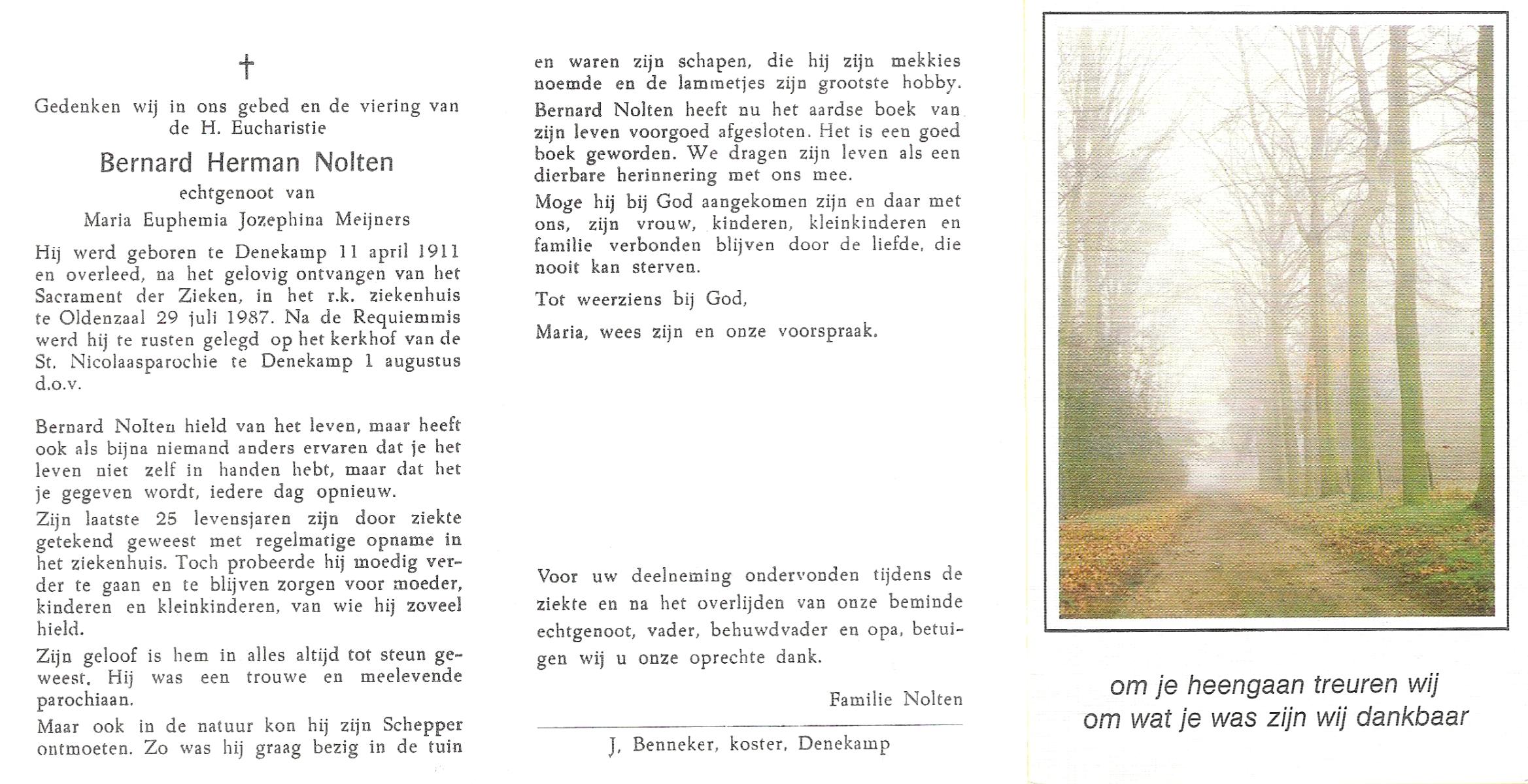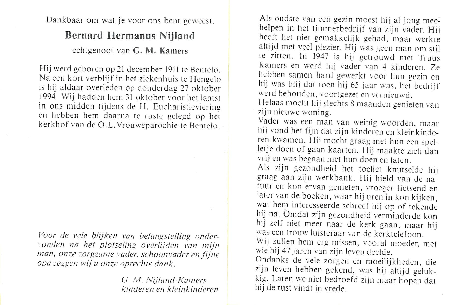 NIJLAND, Bernard Hermanus, geboren op 21-12-1911 te Bentelo, overleden op 27-10-1994 te Hengelo (Ov.) op 82-jarige leeftijd, begraven op 31-10-1994 te Bentelo.