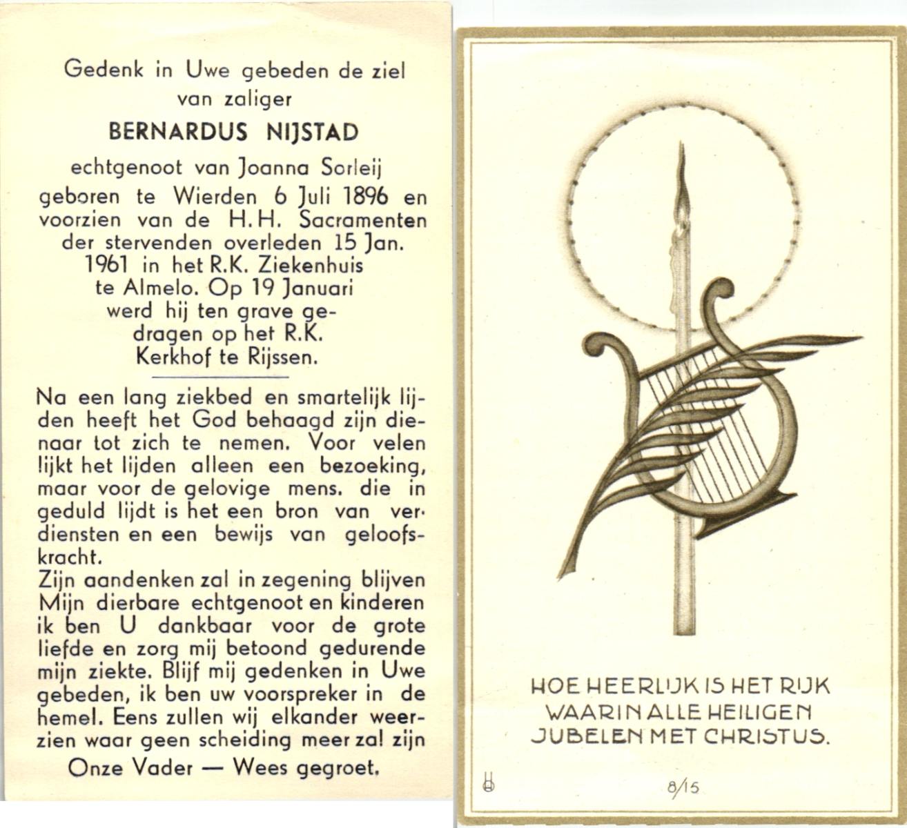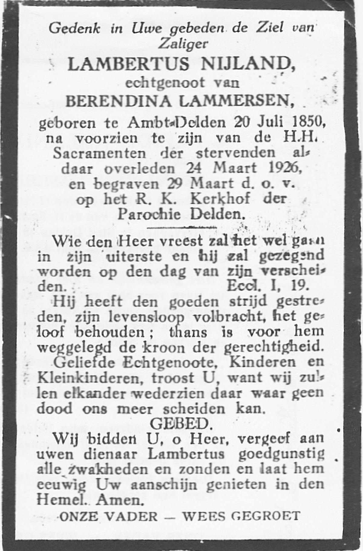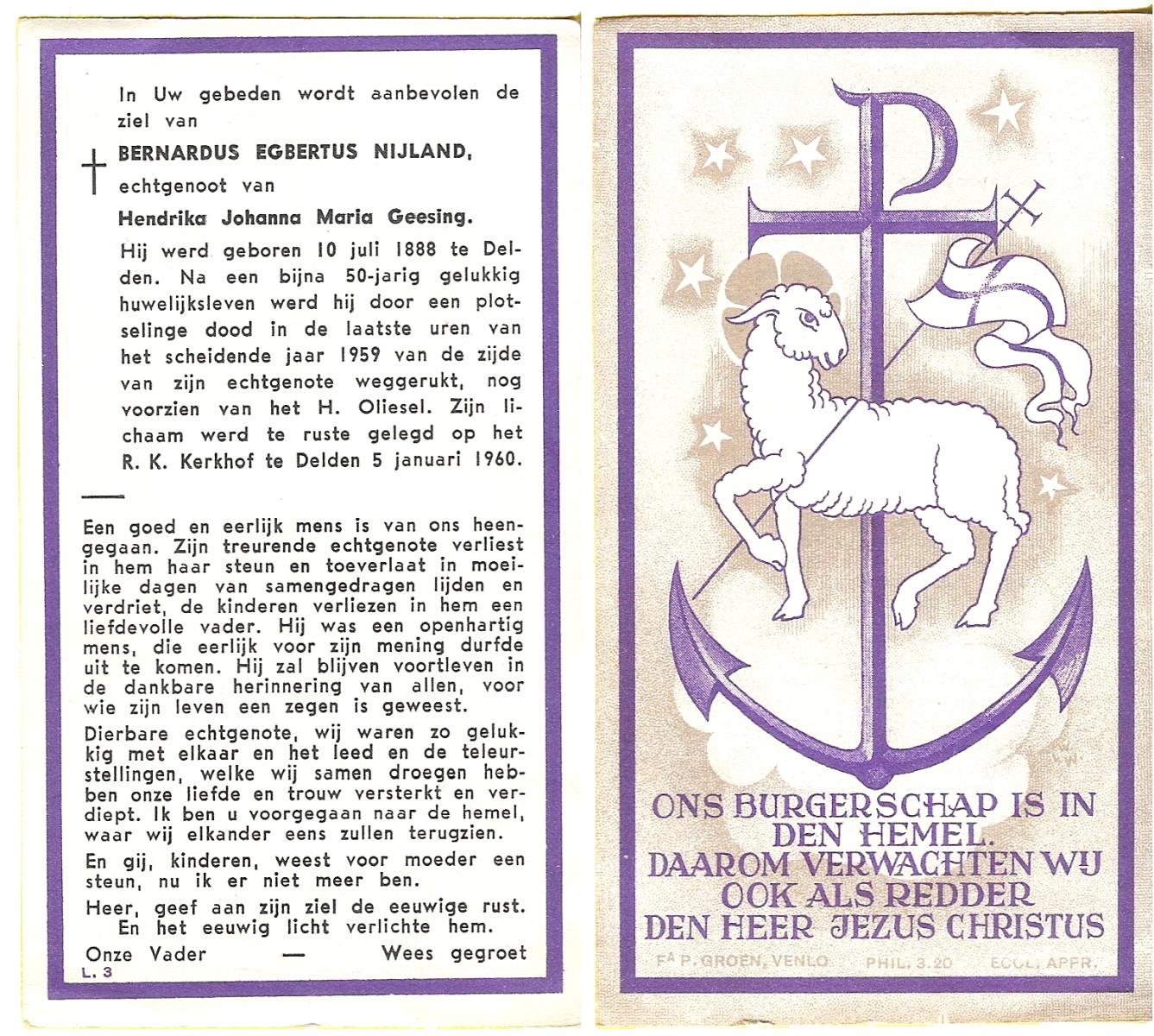 NIJLAND, Bernardus Egbertus, geboren op 10-07-1888 te Delden, overleden op 31-12-1959 op 71-jarige leeftijd, begraven op 5-1-1960 te Delden.