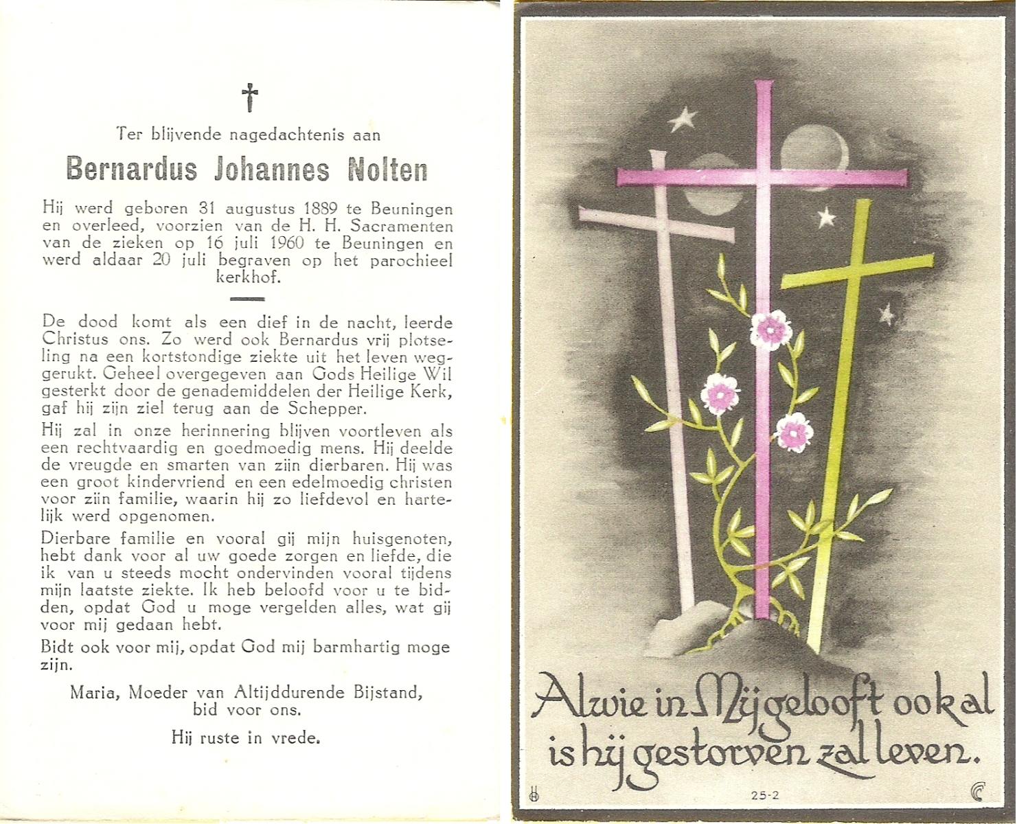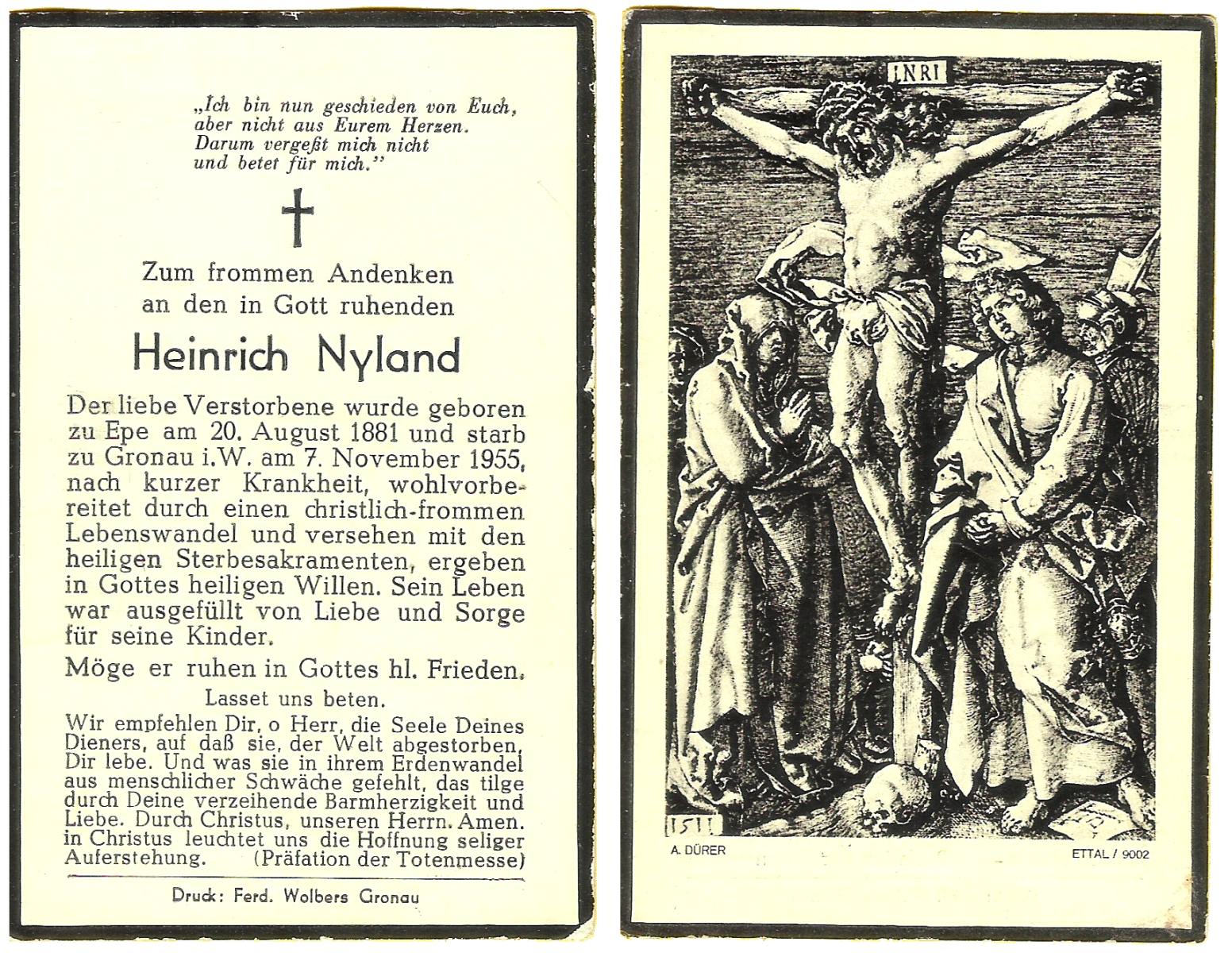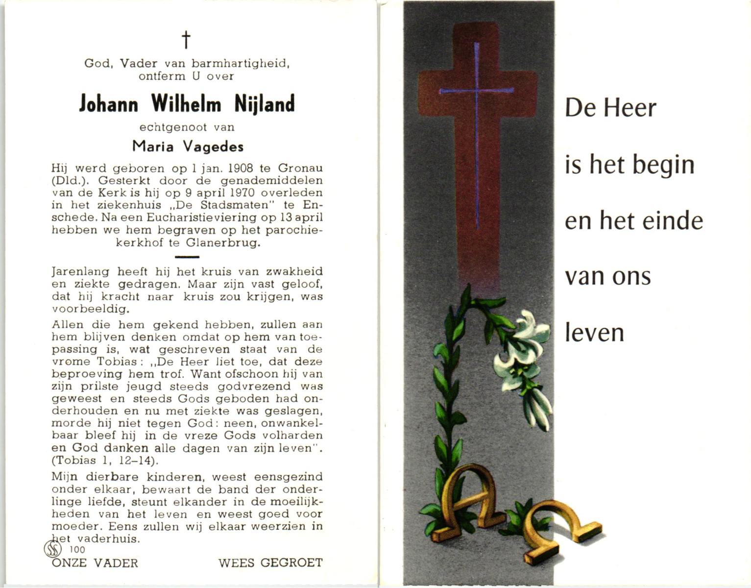 NIJLAND, Bernardus Egbertus, geboren op 10-07-1888 te Delden, overleden op 31-12-1959 op 71-jarige leeftijd, begraven op 5-1-1960 te Delden.