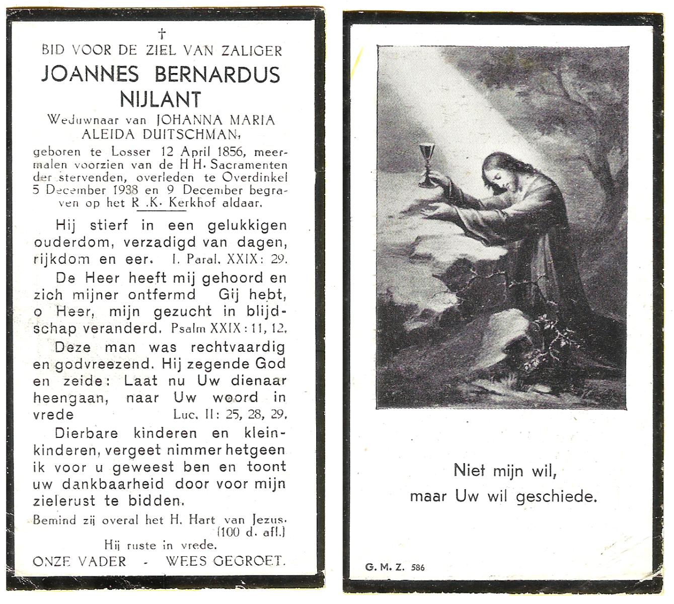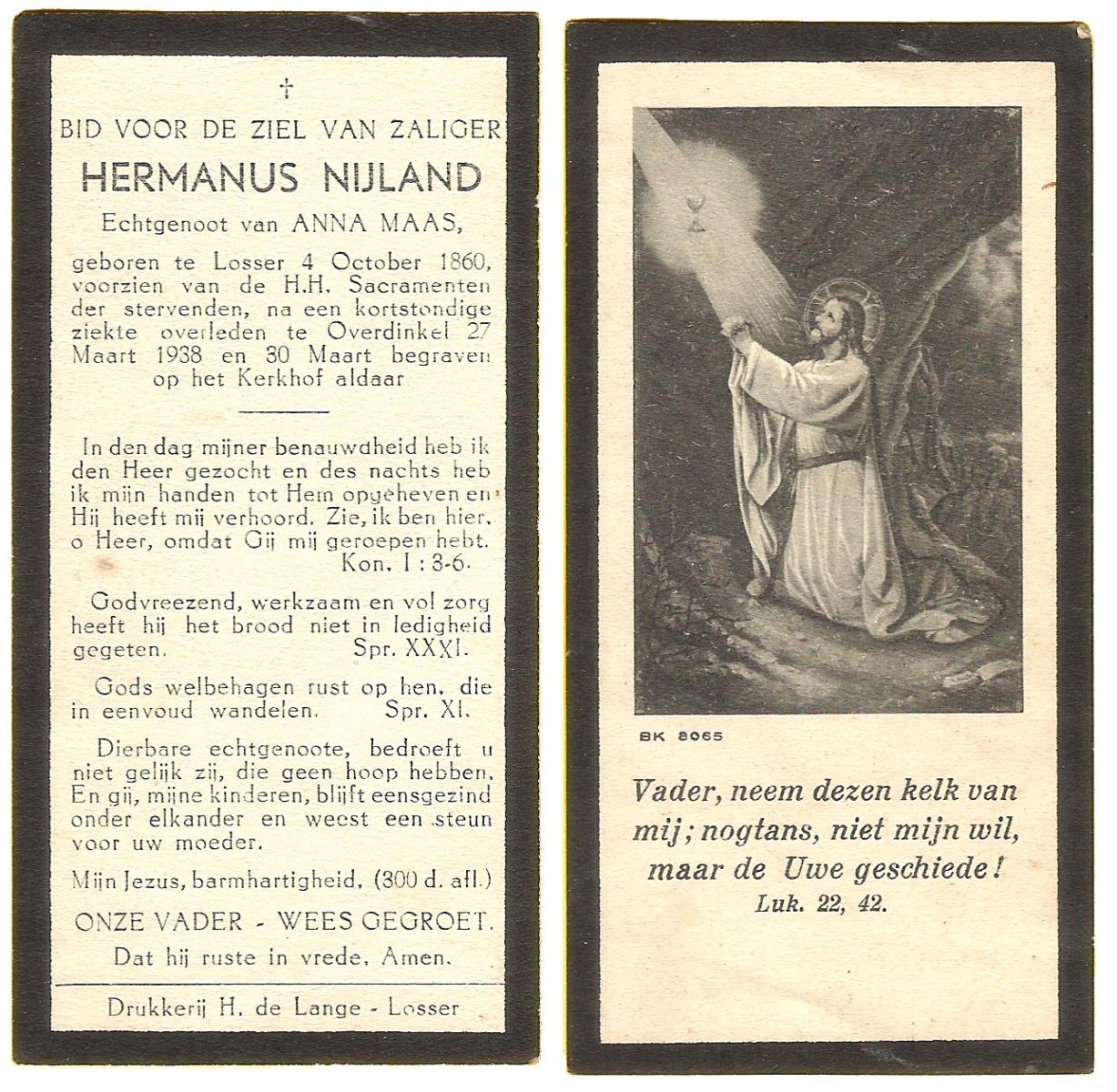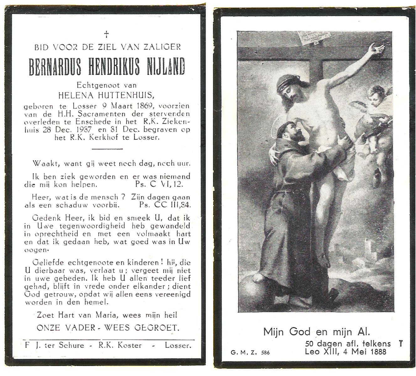 NIJLAND, Bernardus Hendrikus, geboren op 09-03-1869 te Losser, overleden op 28-12-1937 te Enschede op 68-jarige leeftijd, begraven op 31-12-1937 te Losser.