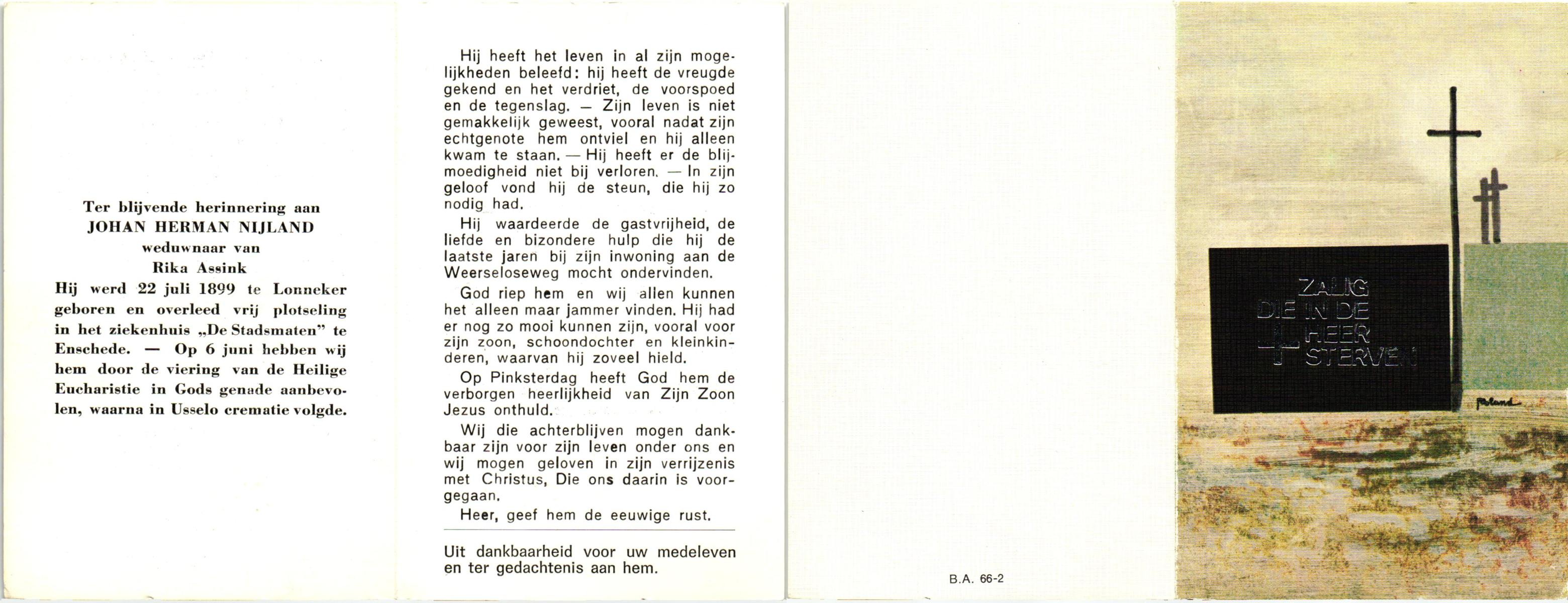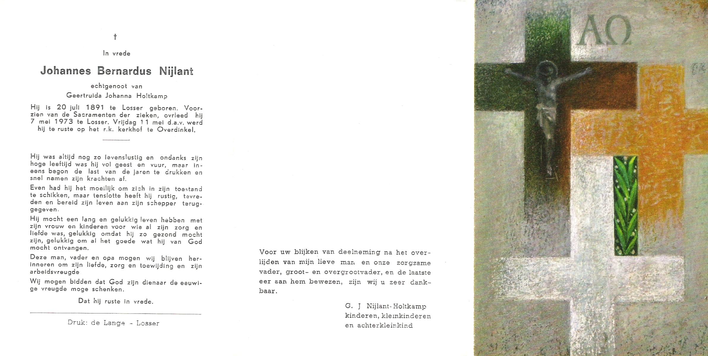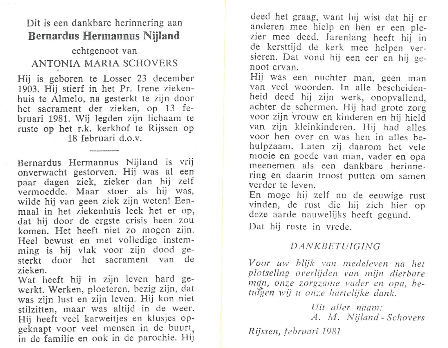 NIJLAND, Bernardus Hermannus, geboren op 23-12-1903 te Losser, overleden op 13-2-1981 te Almelo op 77-jarige leeftijd, begraven op 18-2-1981 te Rijssen.