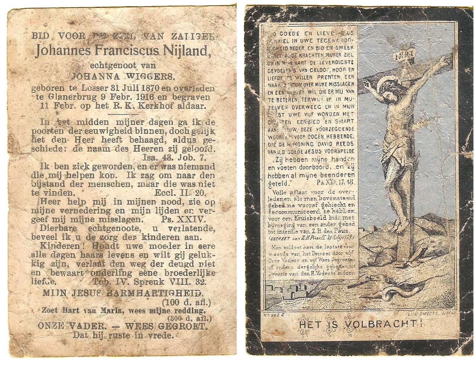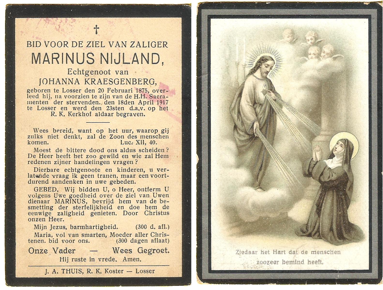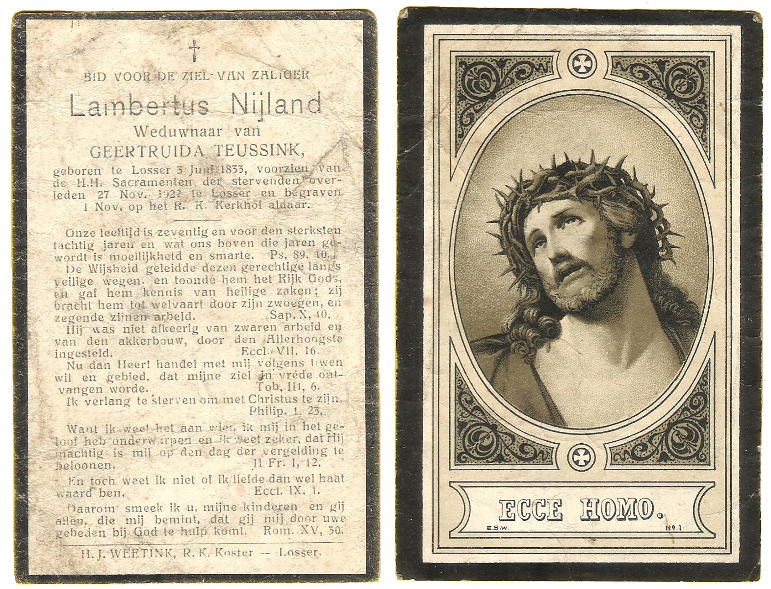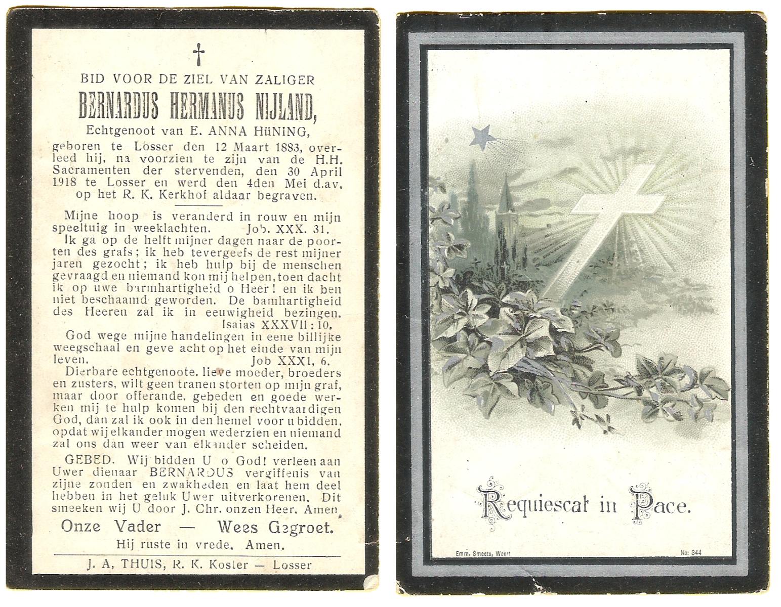 NIJLAND, Bernardus Hermanus, geboren op 12-03-1883 te Losser, overleden op 30-4-1918 te Losser op 35-jarige leeftijd, begraven op 4-5-1918 te Losser.