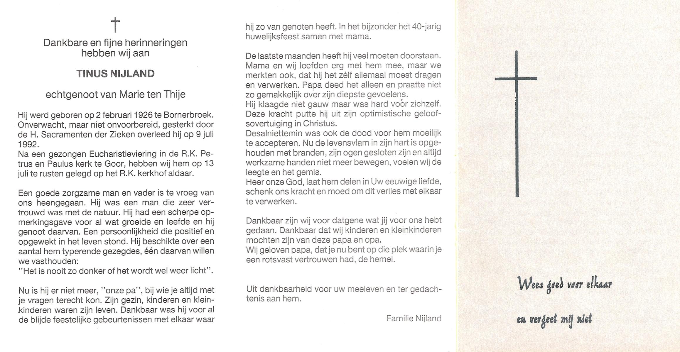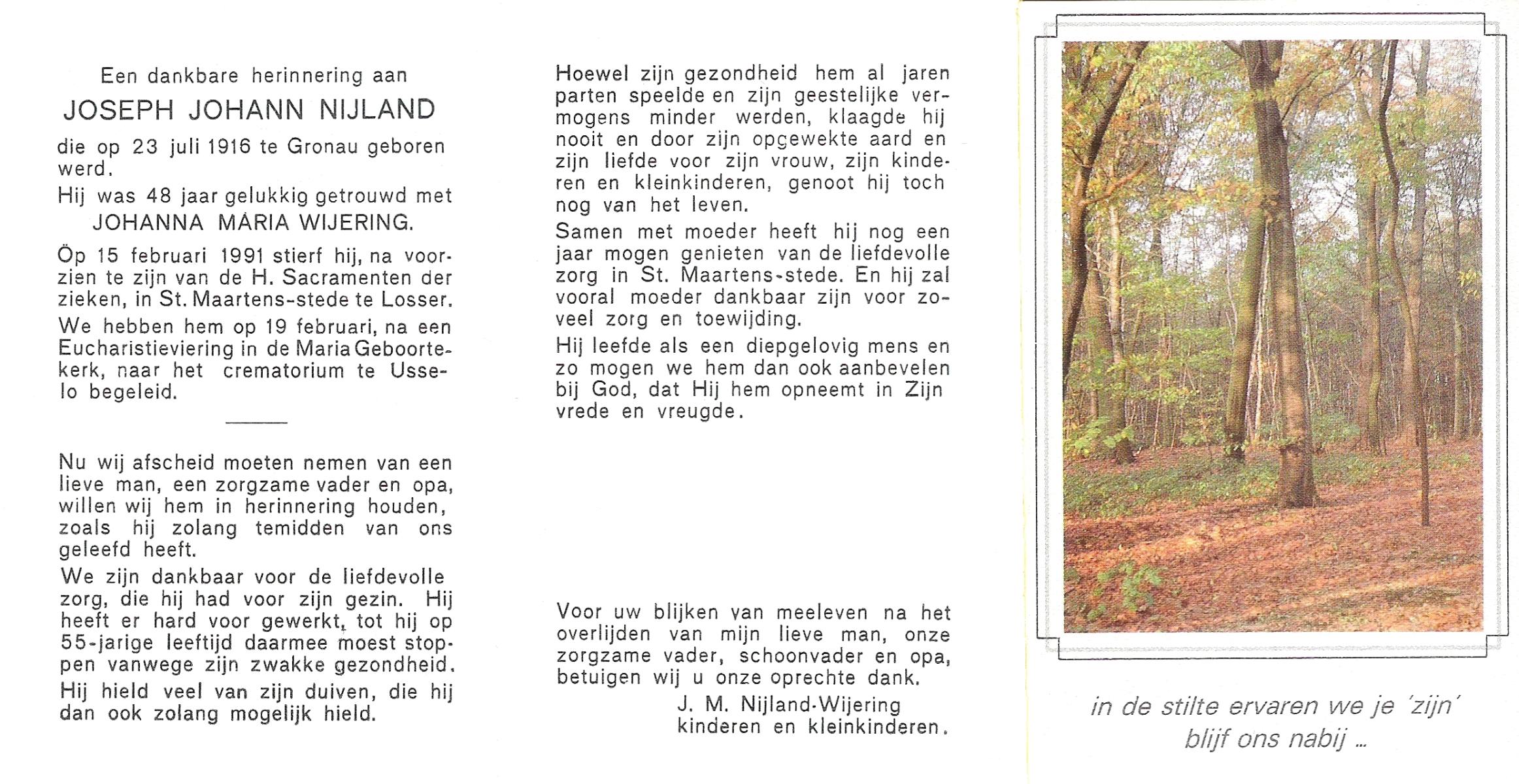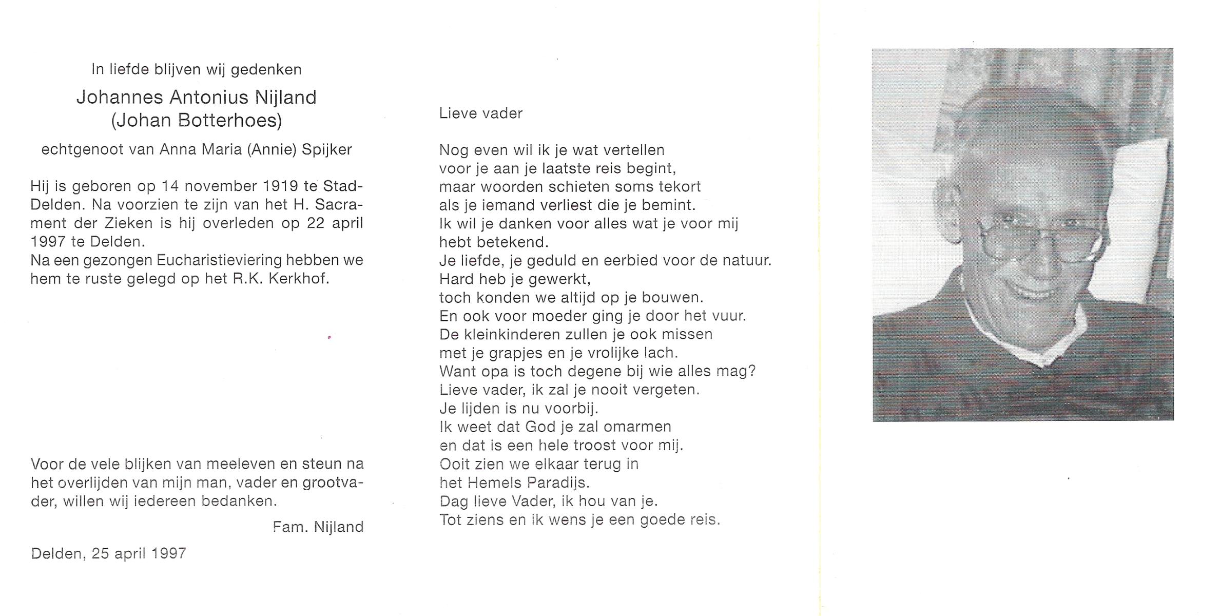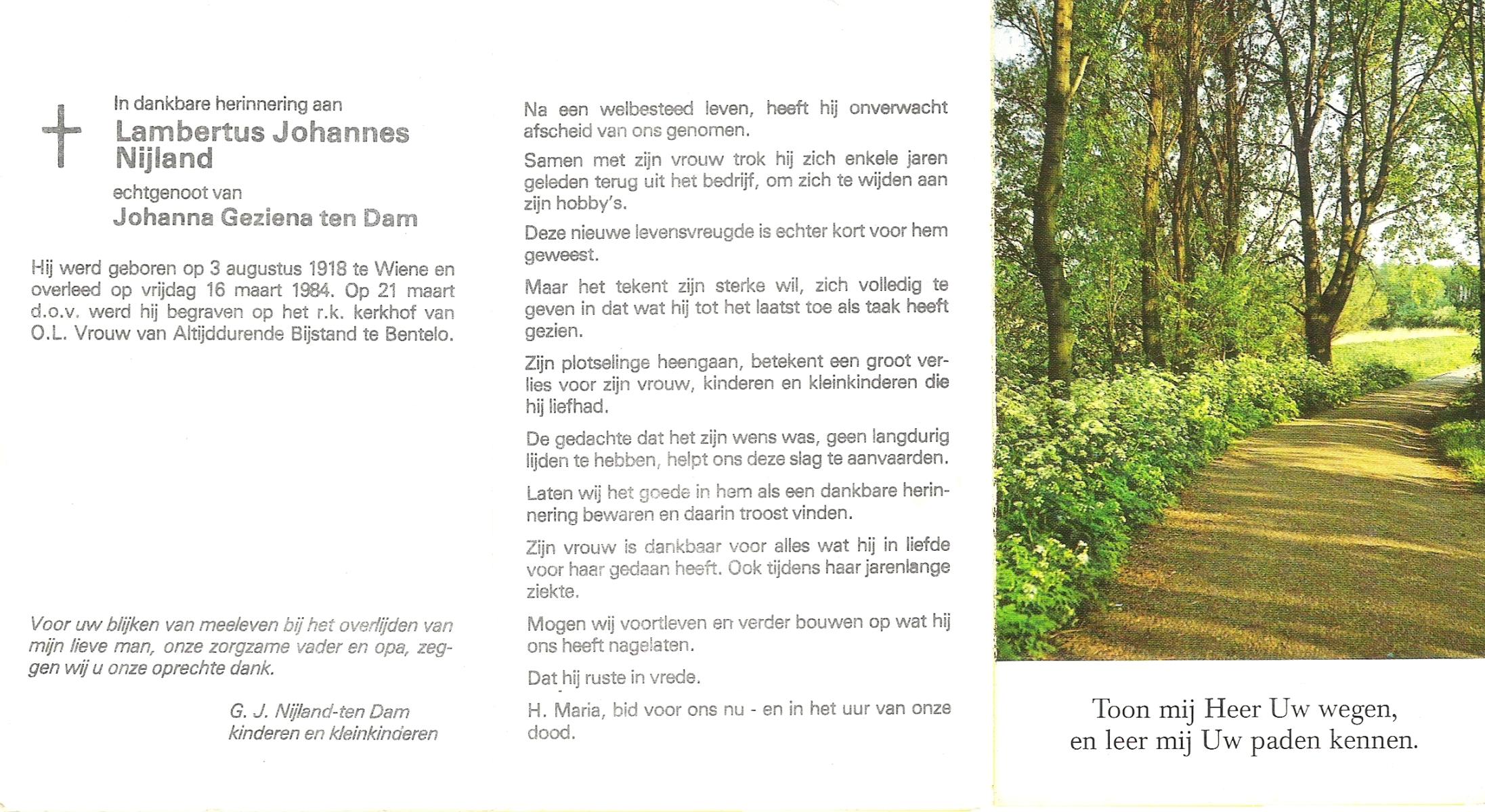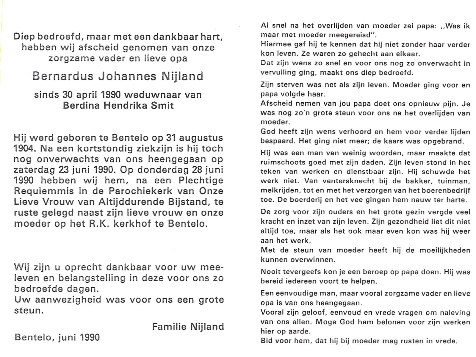 NIJLAND, Bernardus Johannes, geboren op 31-8-1904 te Bentelo, overleden op 23-6-1990 op 85-jarige leeftijd, begraven op 28-6-1990 te Bentelo.