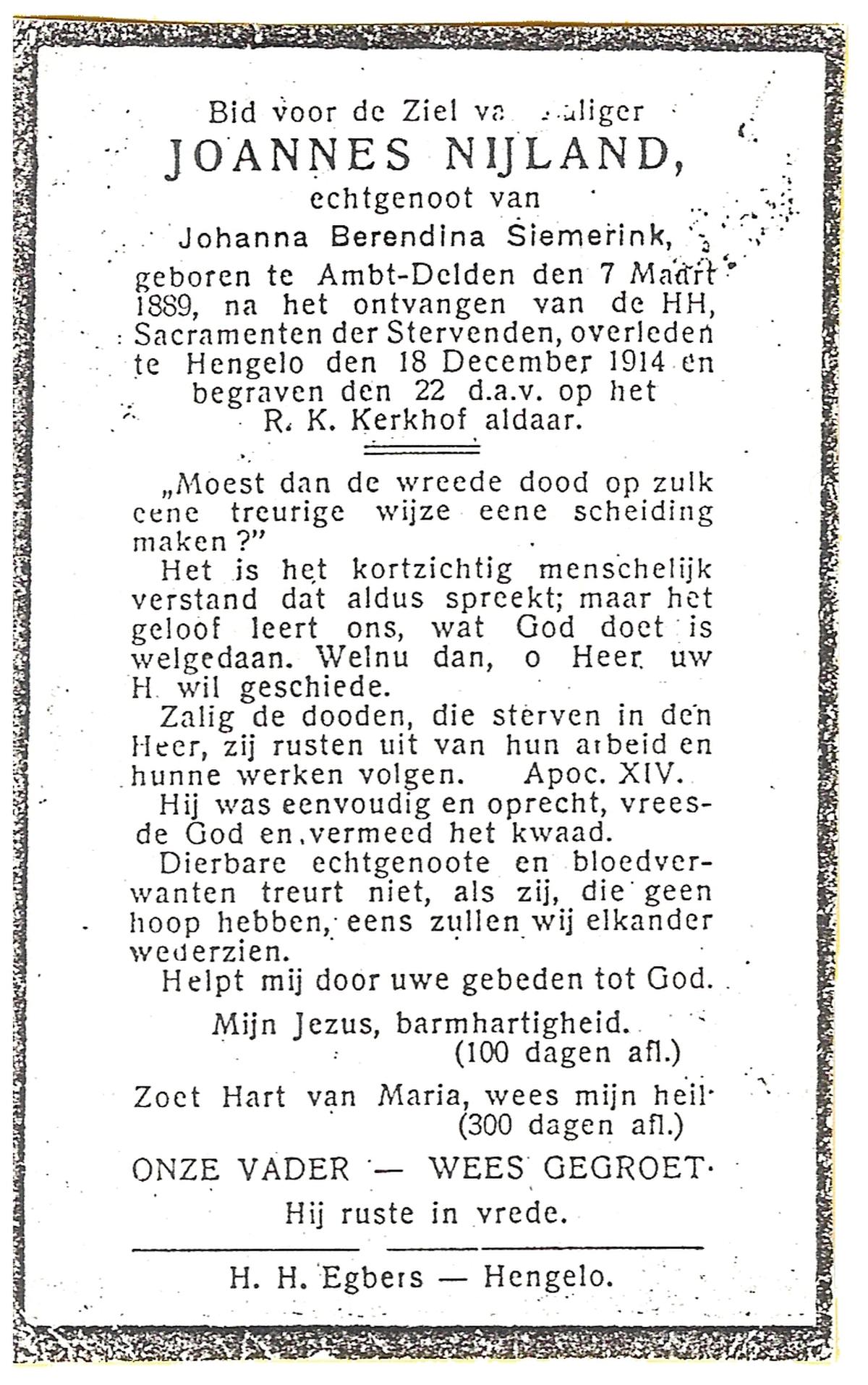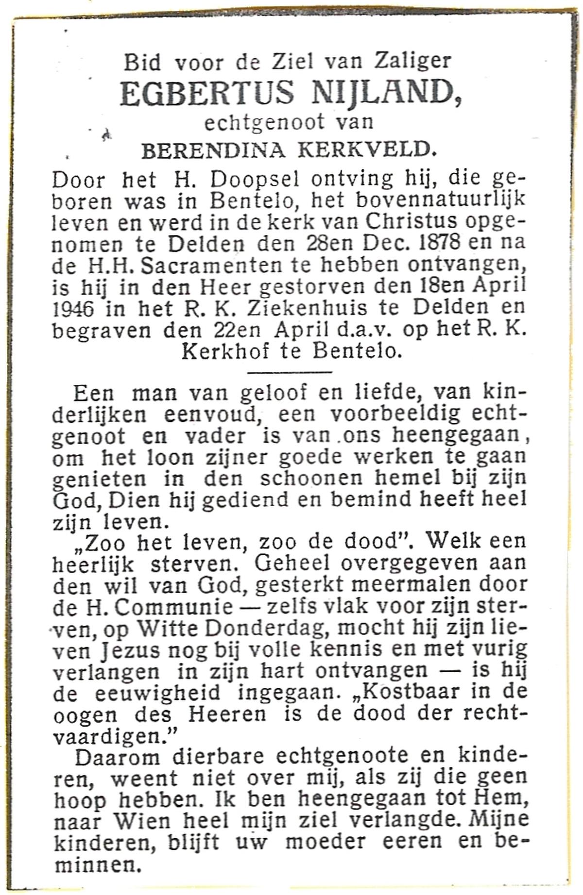 NIJLAND, Egbertus, geboren op 28-12-1878 te Bentelo, overleden op 18-4-1946 te Delden op 67-jarige leeftijd, begraven op 22-4-1946 te Bentelo.