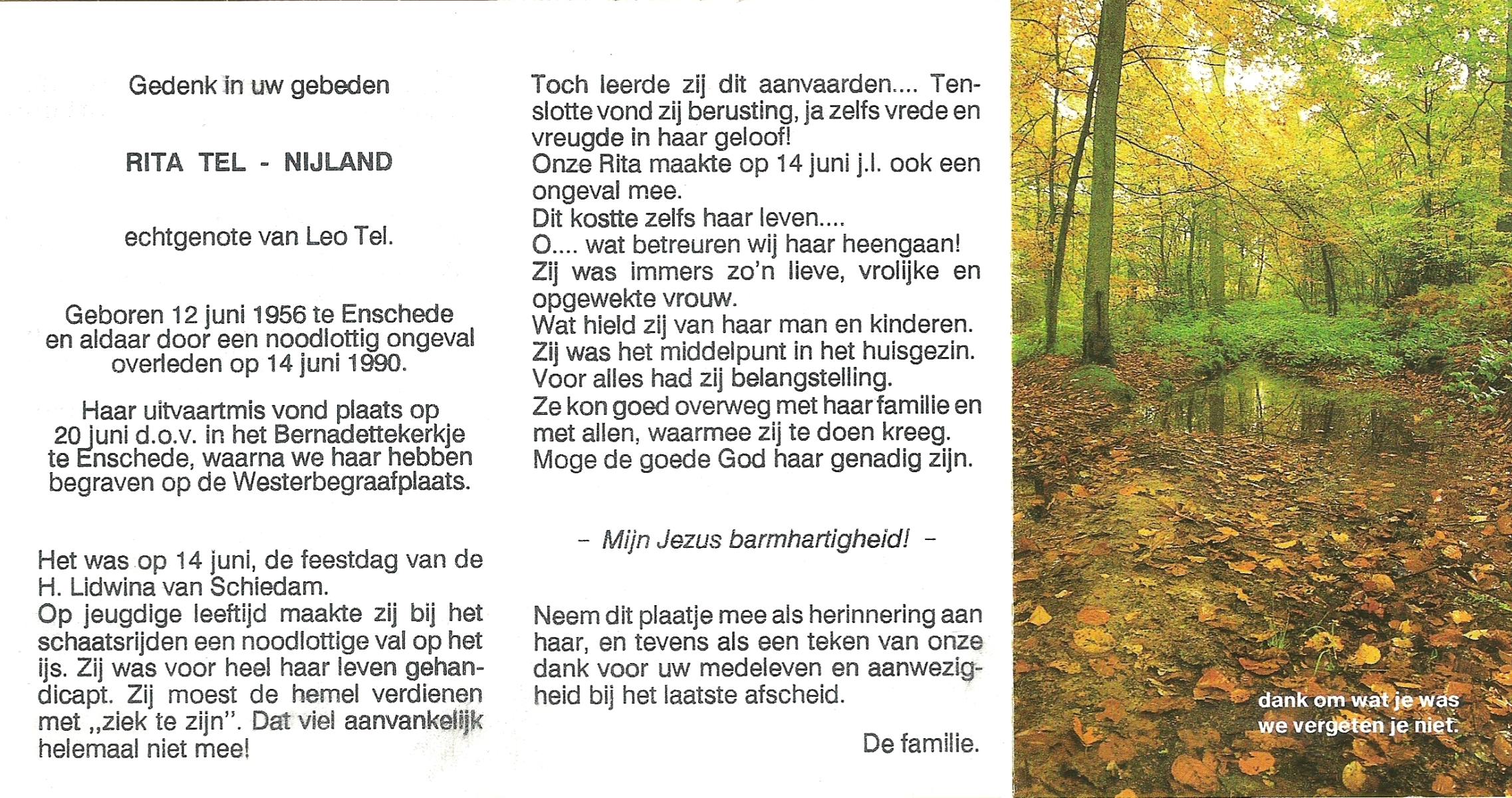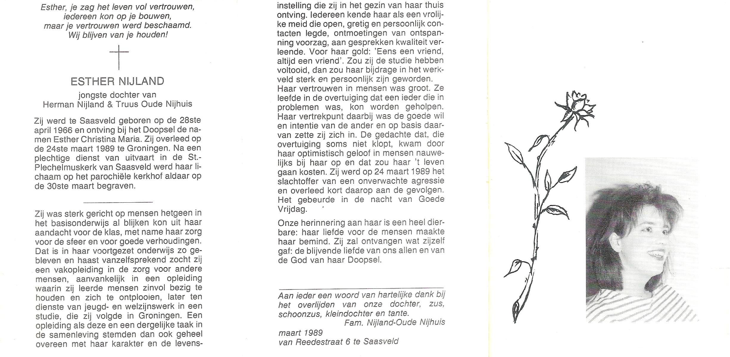 NIJLAND, Esther (Esther Christina Maria), geboren op 28-4-1966 te Saasveld, overleden op 24-3-1989 te Groningen op 22-jarige leeftijd, begraven op 30-3-1989 te Saasveld.