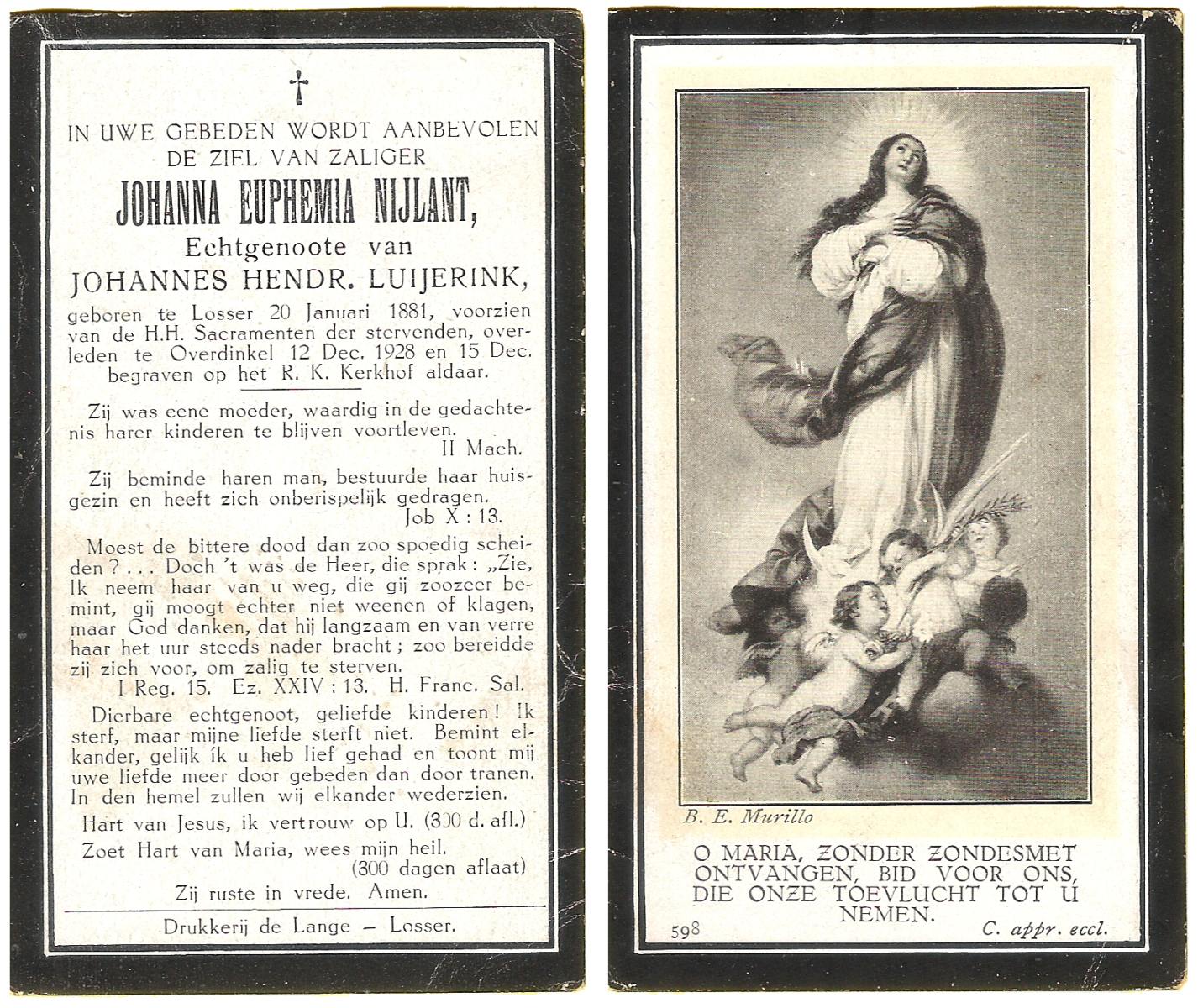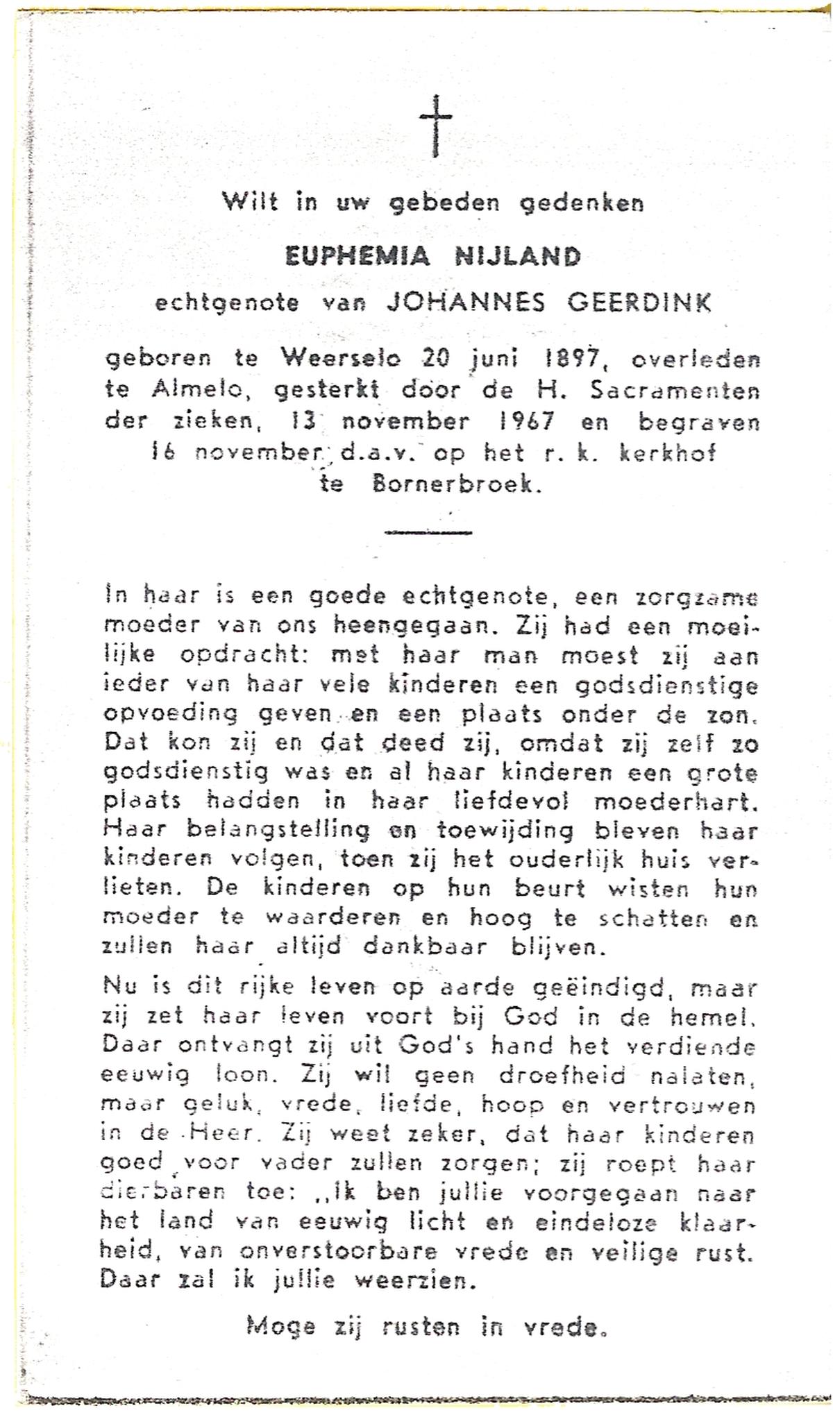 NIJLAND, Euphemia, geboren op 20-06-1897 te Weerselo, overleden op 13-11-1967 te Almelo op 70-jarige leeftijd, begraven op 16-11-1967 te Bornerbroek.