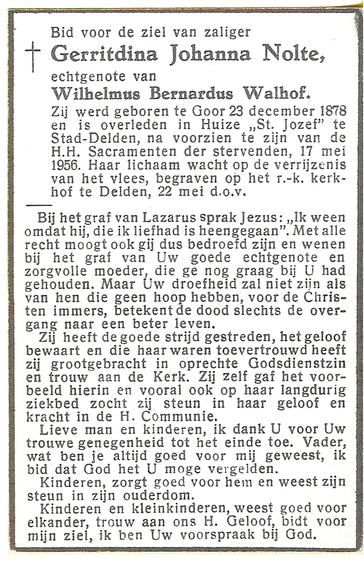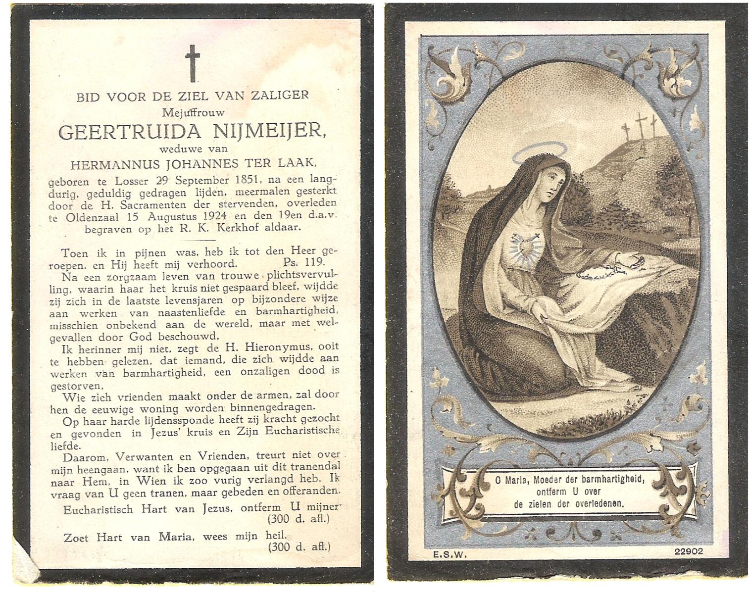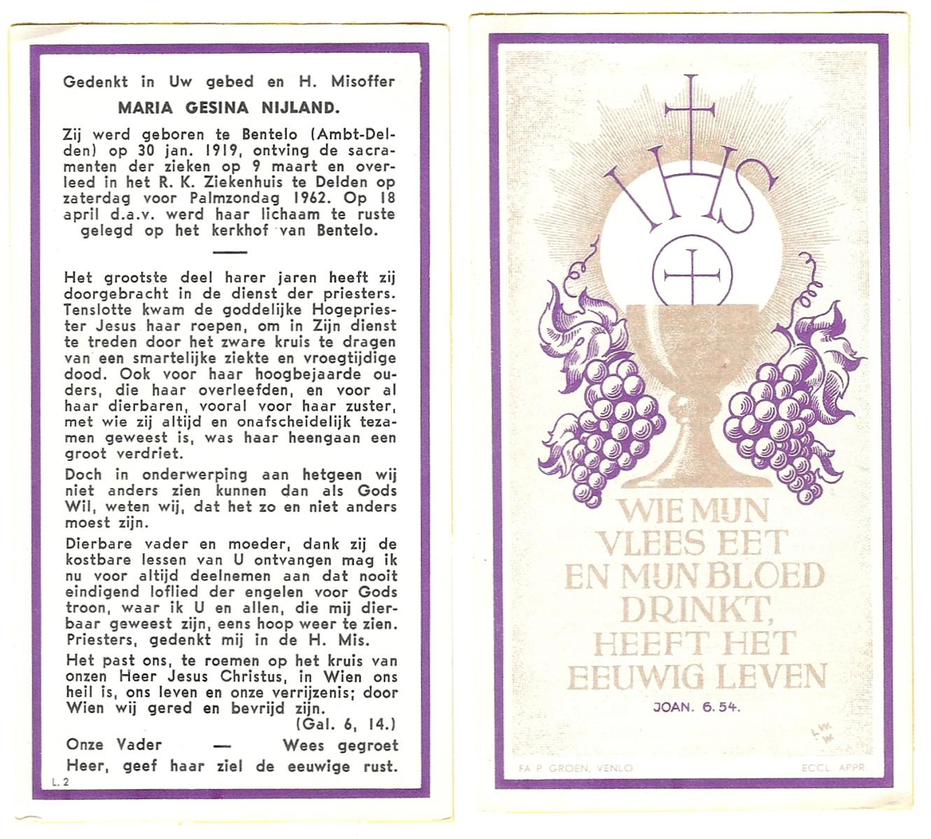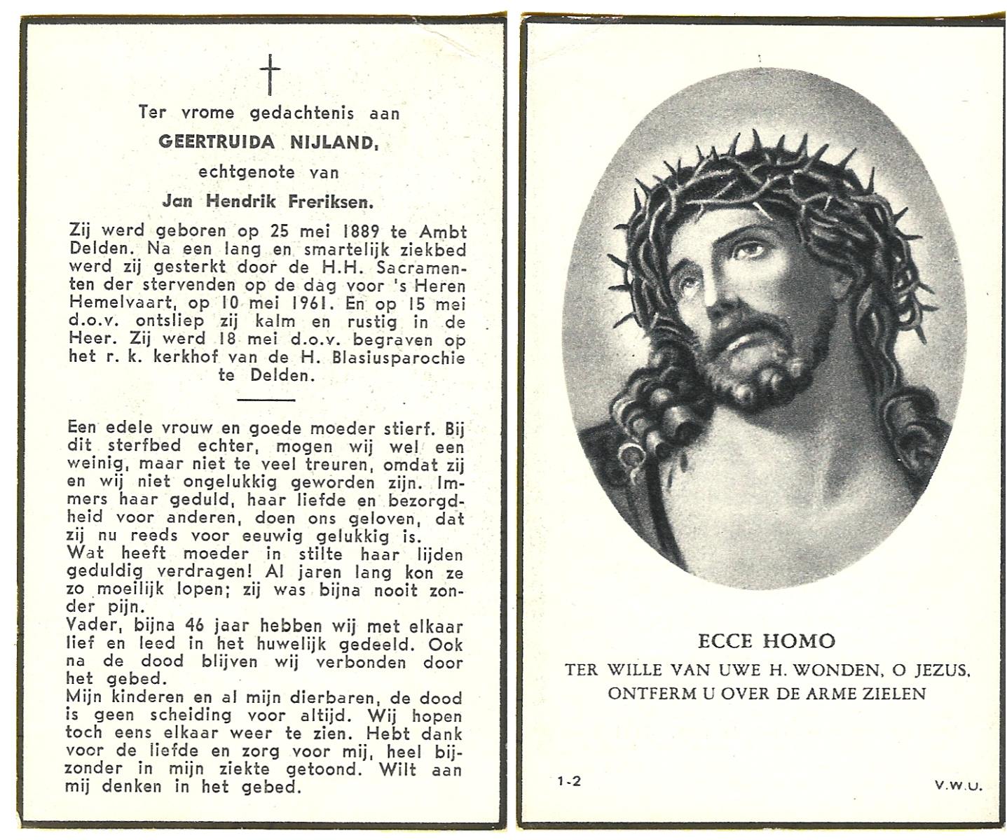 NIJLAND, Geertruida, geboren op 25-05-1889 te Delden, Ambt, overleden op 15-5-1961 op 71-jarige leeftijd, begraven op 18-5-1961 te Delden parochie-kerkhof H.Blasius.
