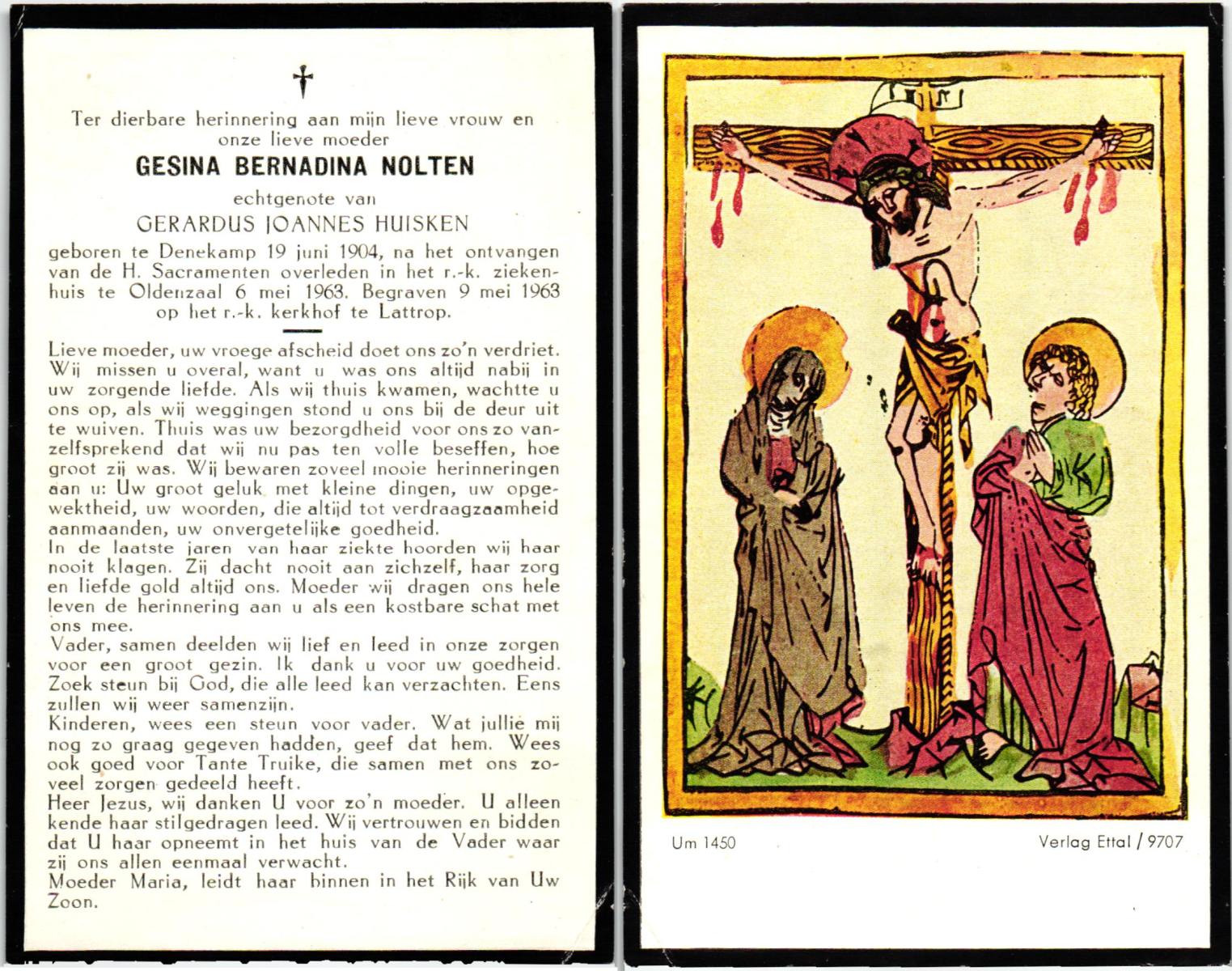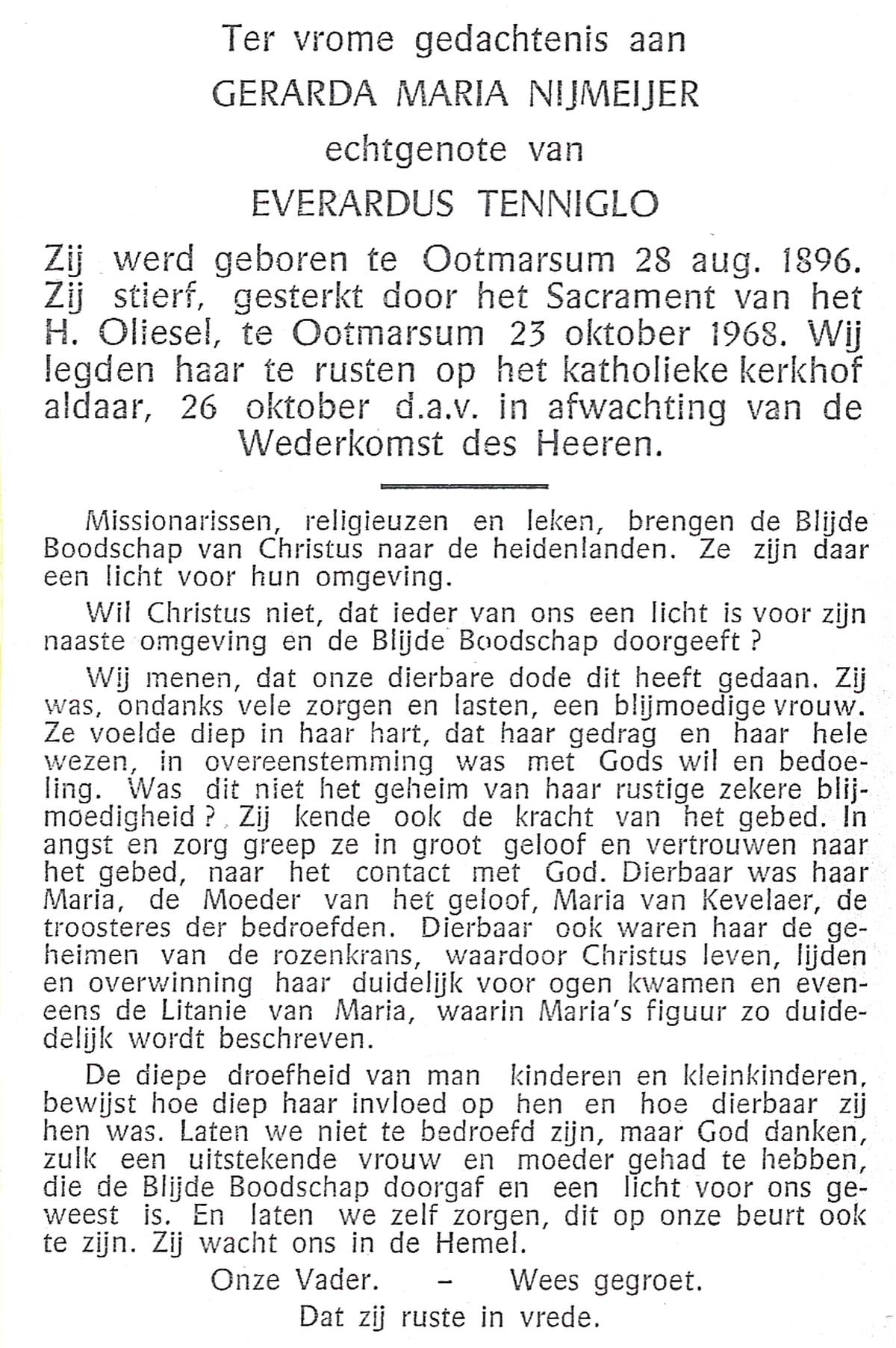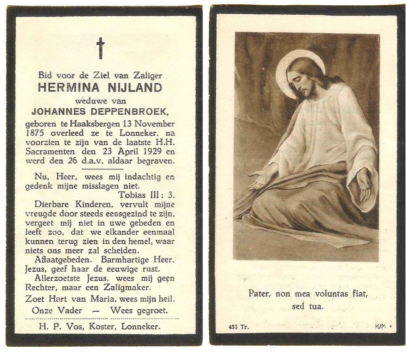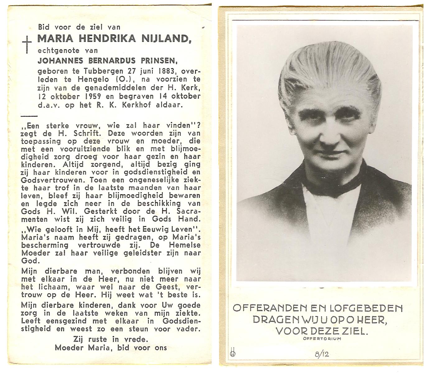 NIJLAND, Geertruida, geboren op 25-05-1889 te Delden, Ambt, overleden op 15-5-1961 op 71-jarige leeftijd, begraven op 18-5-1961 te Delden parochie-kerkhof H.Blasius.