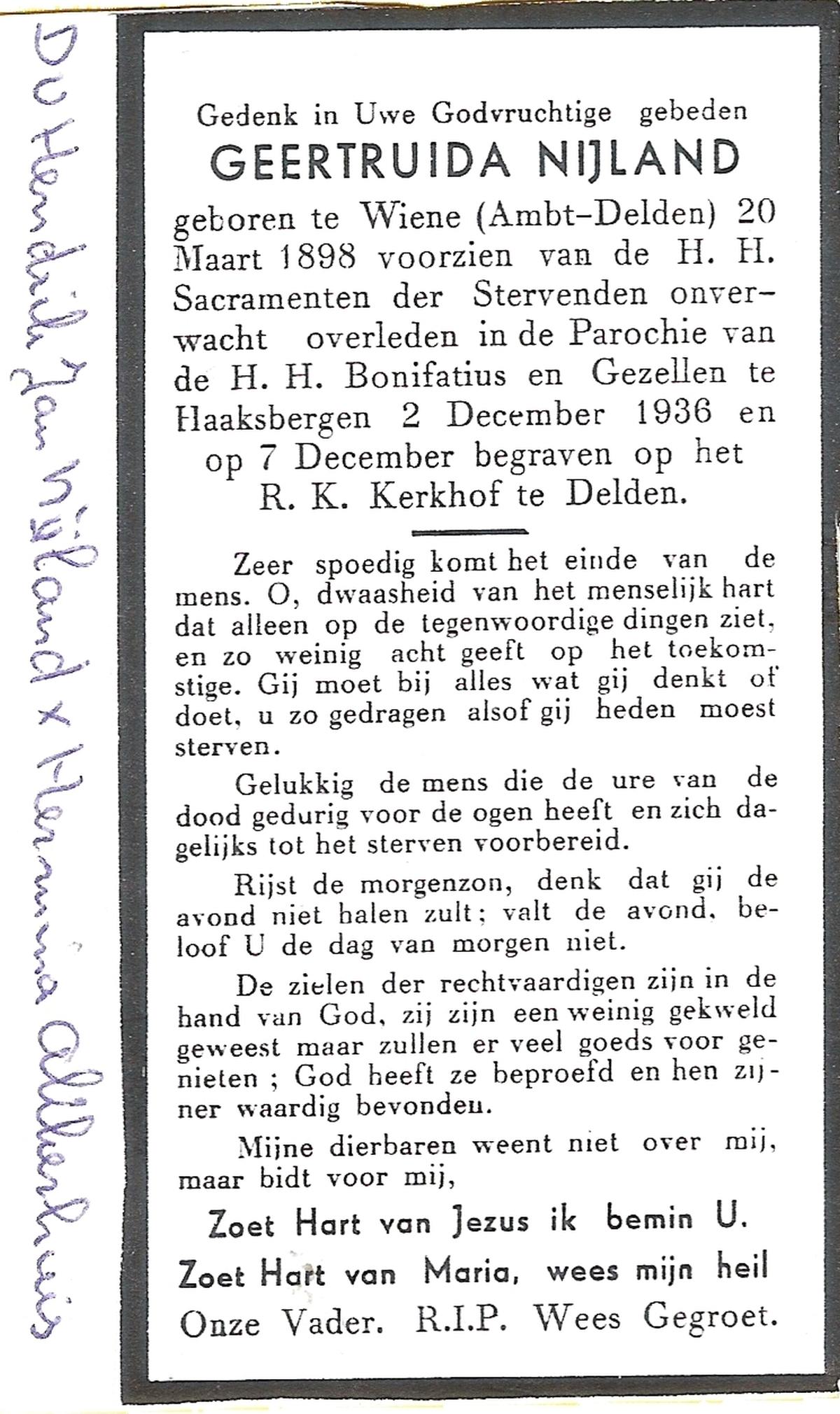 NIJLAND, Geertruida, geboren op 20-03-1898 te Wiene, overleden op 2-12-1936 te Haaksbergen op 38-jarige leeftijd, begraven op 7-12-1936 te Delden.