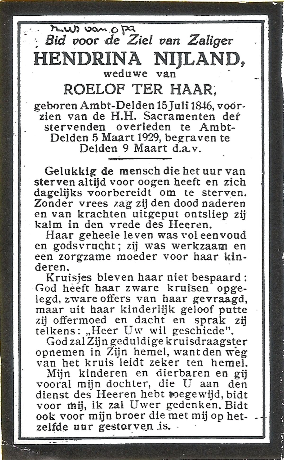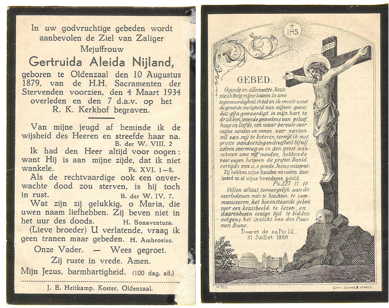 NIJLAND, Geertruida Aleida, geboren op 10-08-1879 te Oldenzaal, overleden op 4-3-1934 te Oldenzaal op 54-jarige leeftijd, begraven op 7-3-1934 te Oldenzaal.