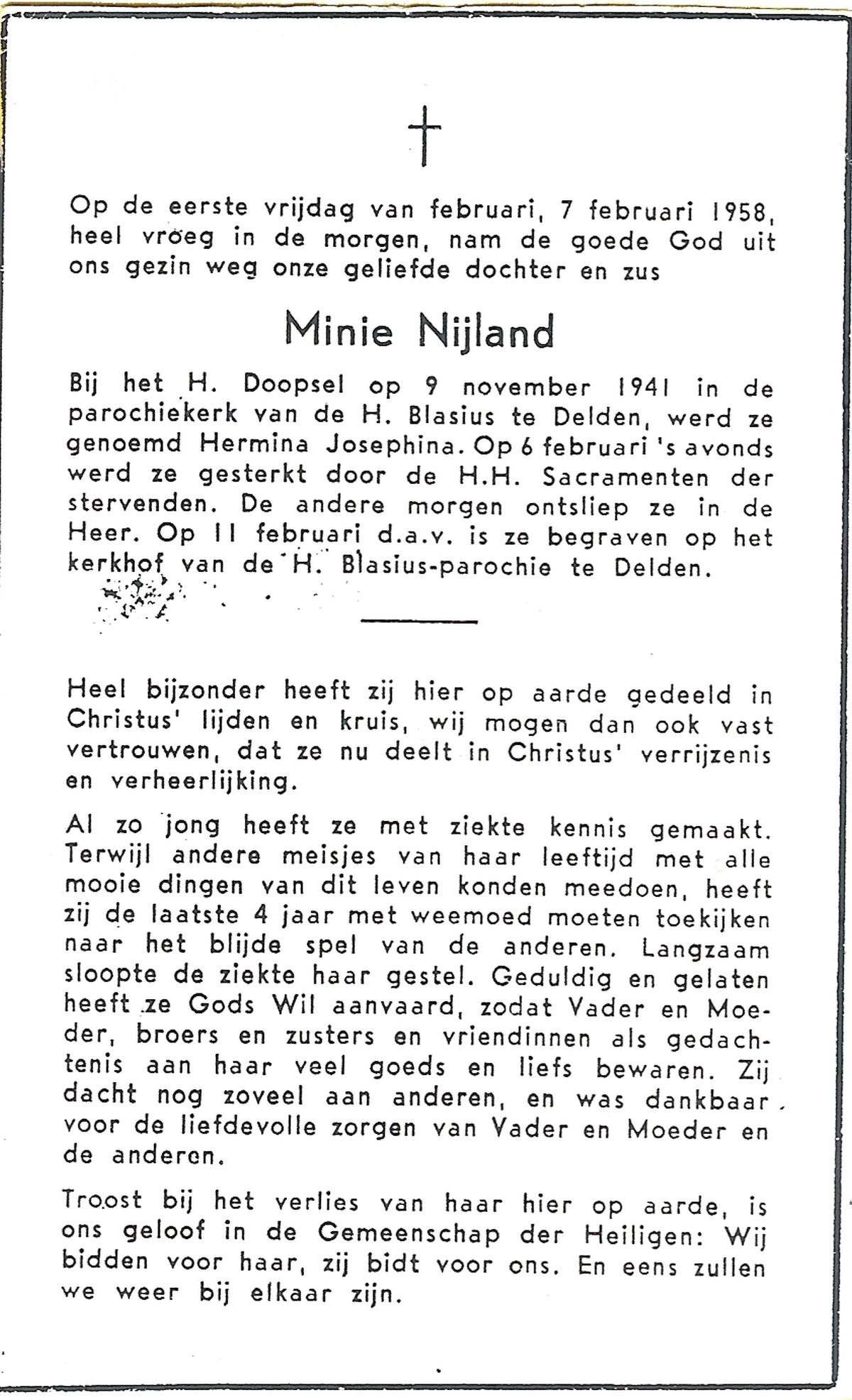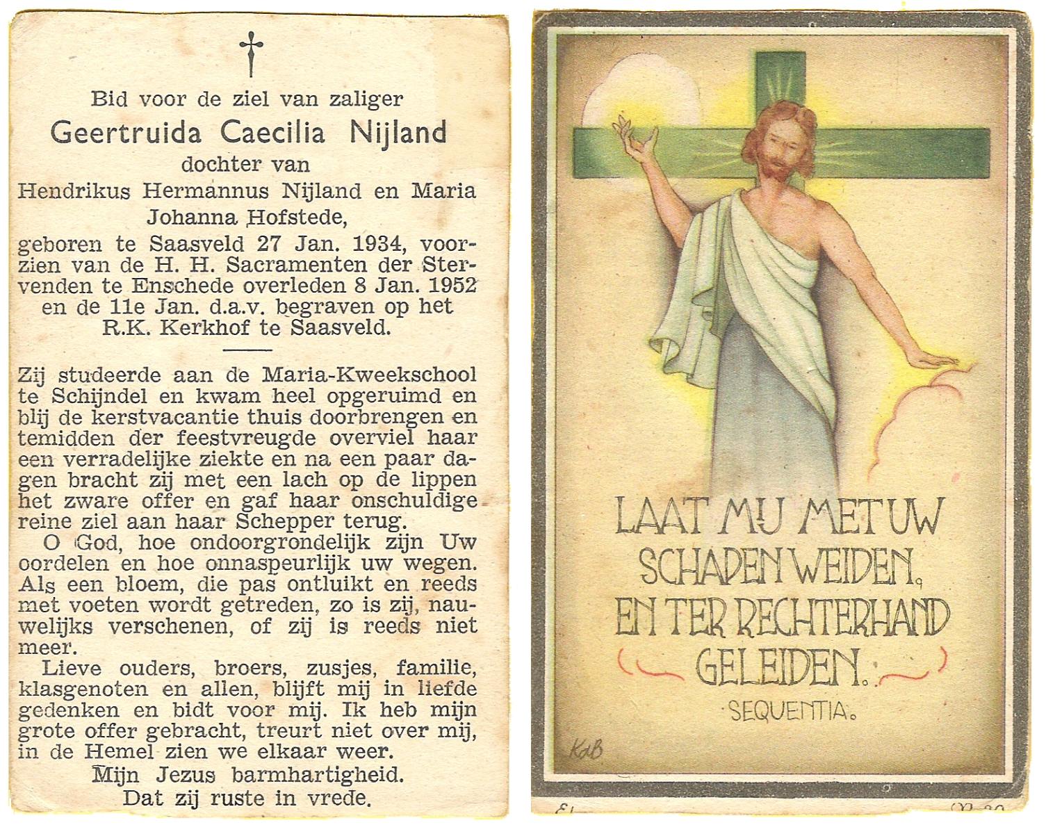 NIJLAND, Geertruida Caecilia, geboren op 27-1-1934 te Saasveld, overleden op 8-1-1952 te Enschede op 17-jarige leeftijd, begraven op 11-1-1952 te Saasveld.