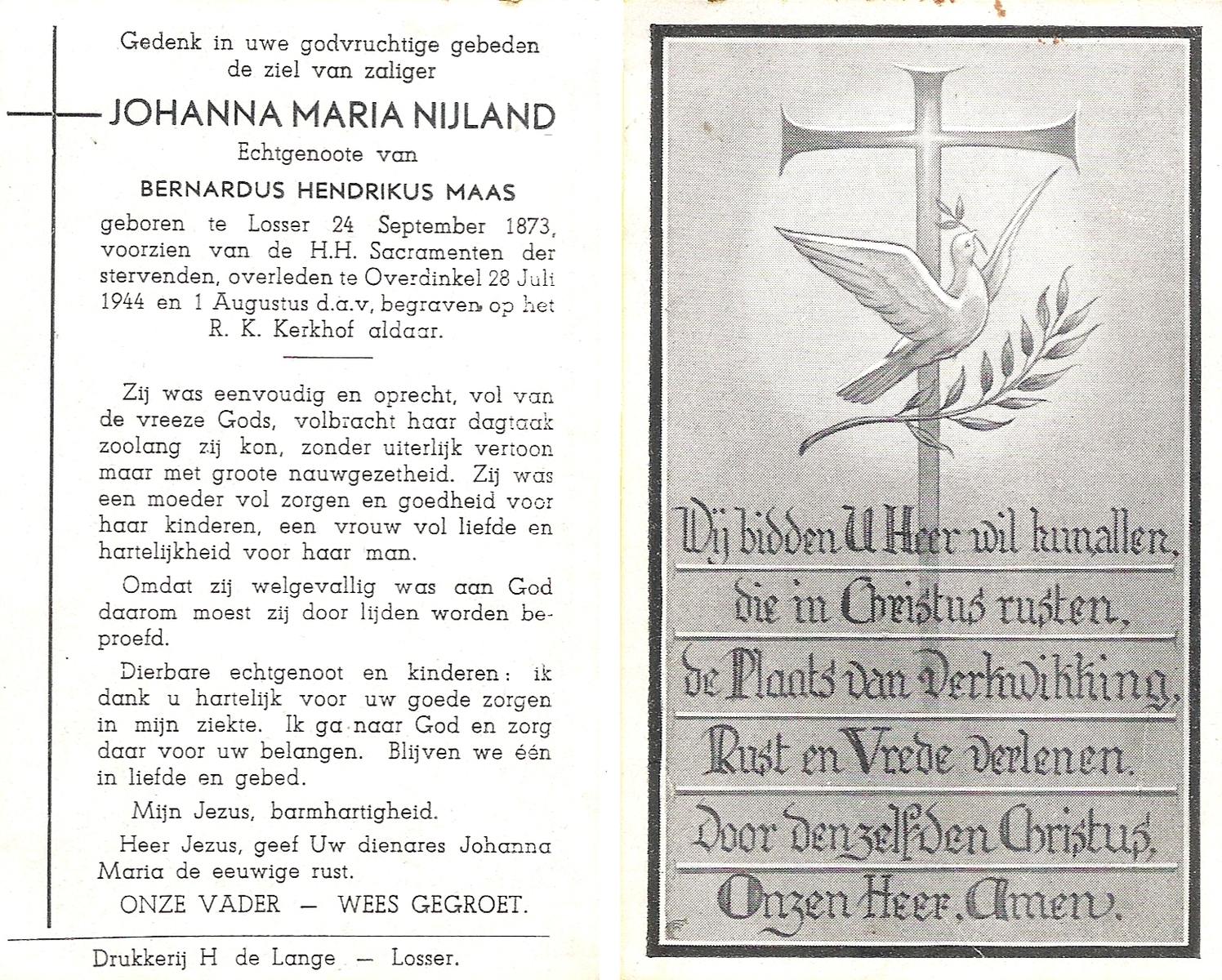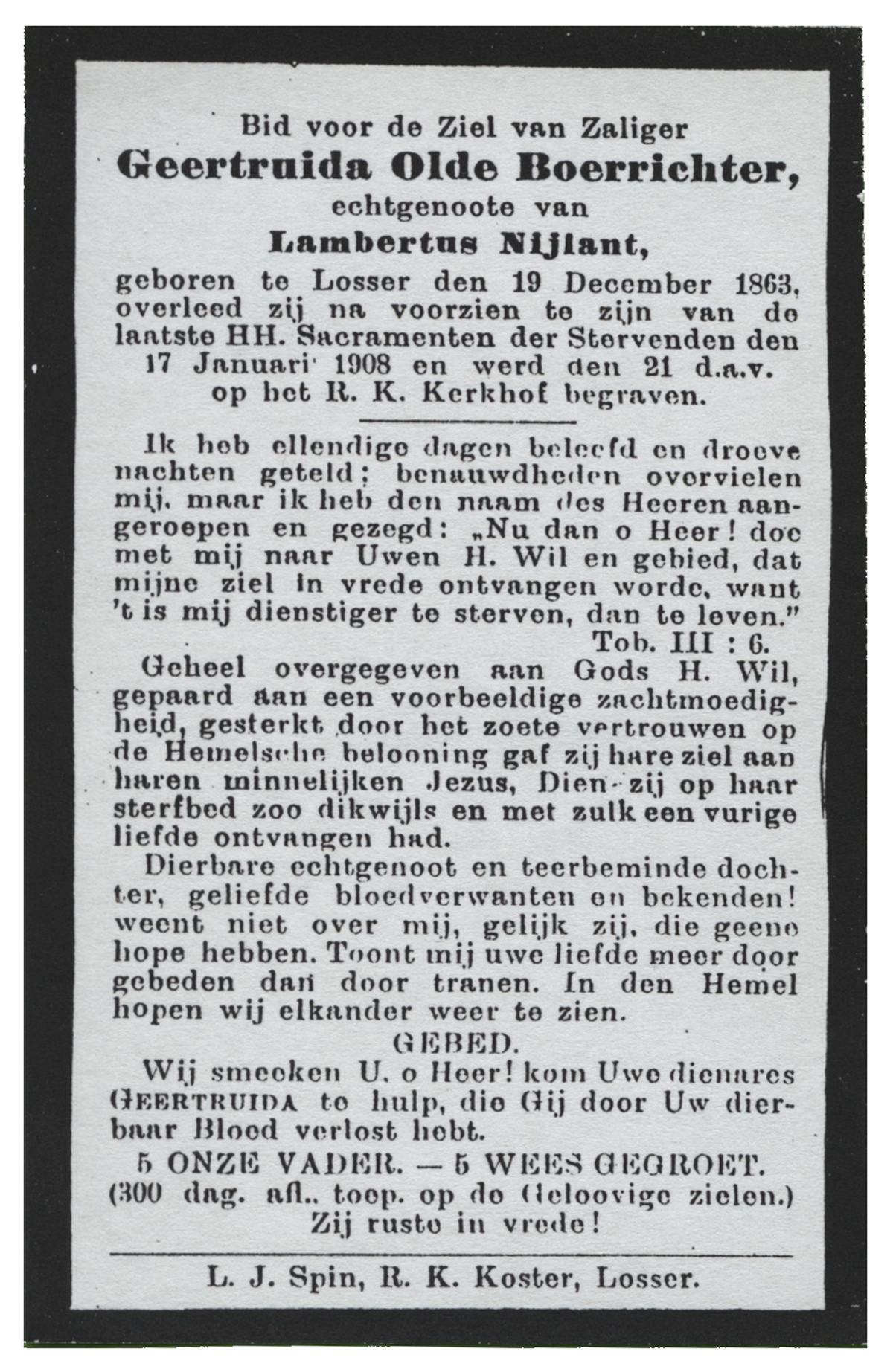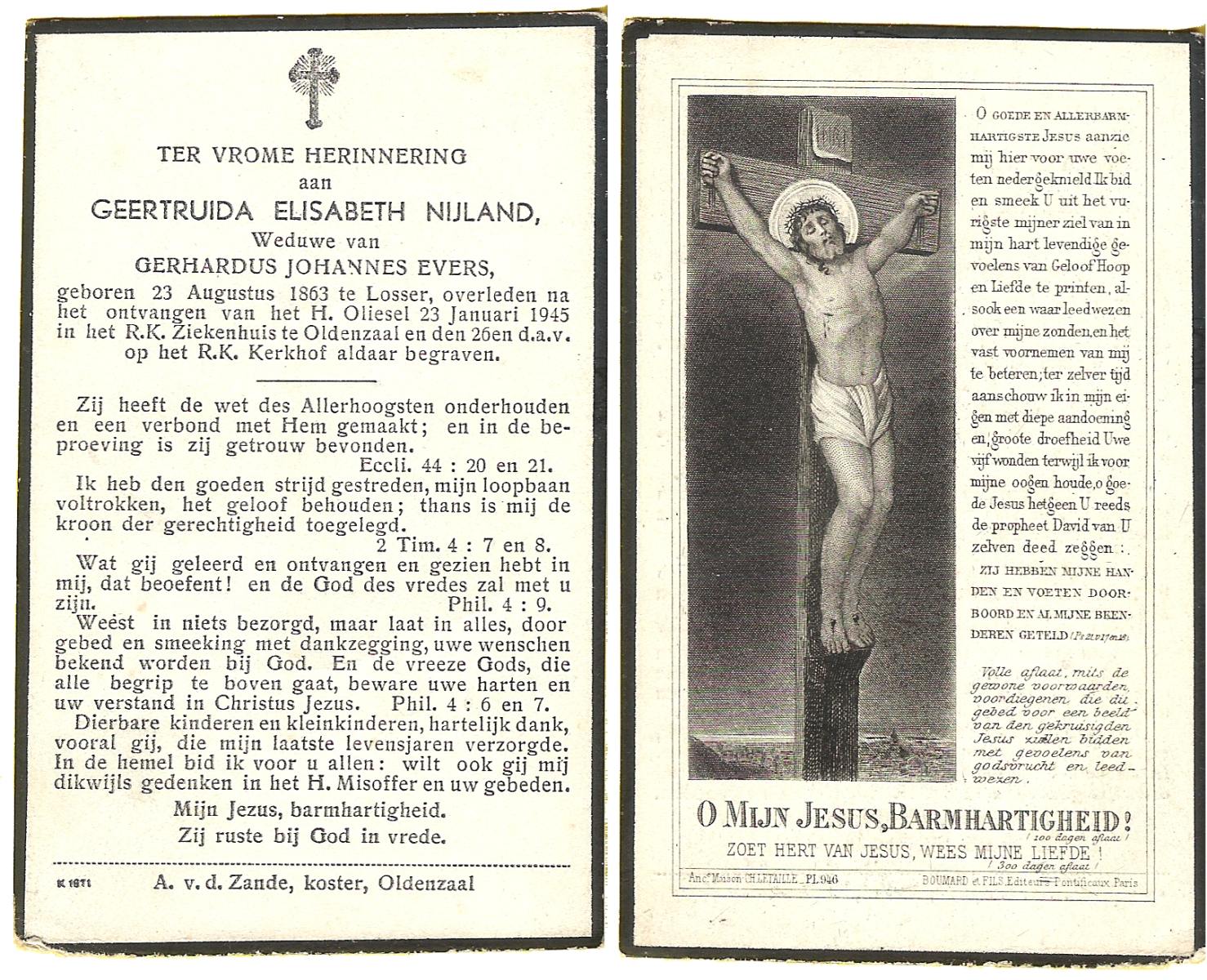 NIJLAND, Geertruida Elisabeth, geboren op 23-08-1863 te Losser, overleden op 23-1-1945 te Oldenzaal op 81-jarige leeftijd, begraven op 26-1-1945 te Oldenzaal.