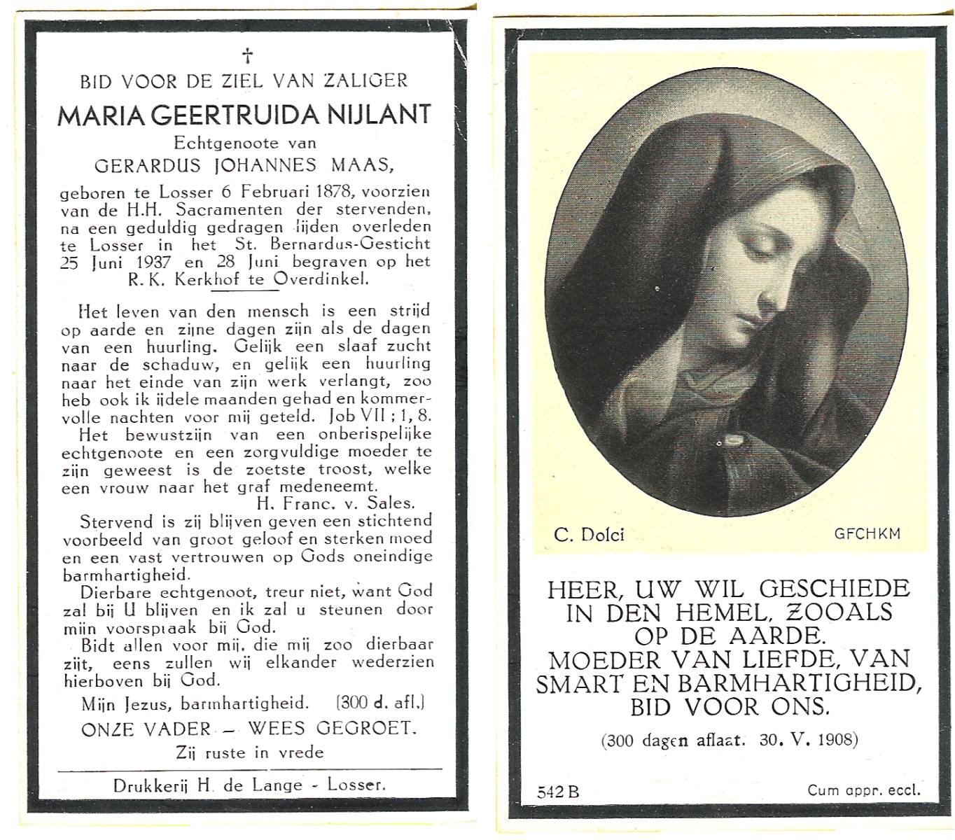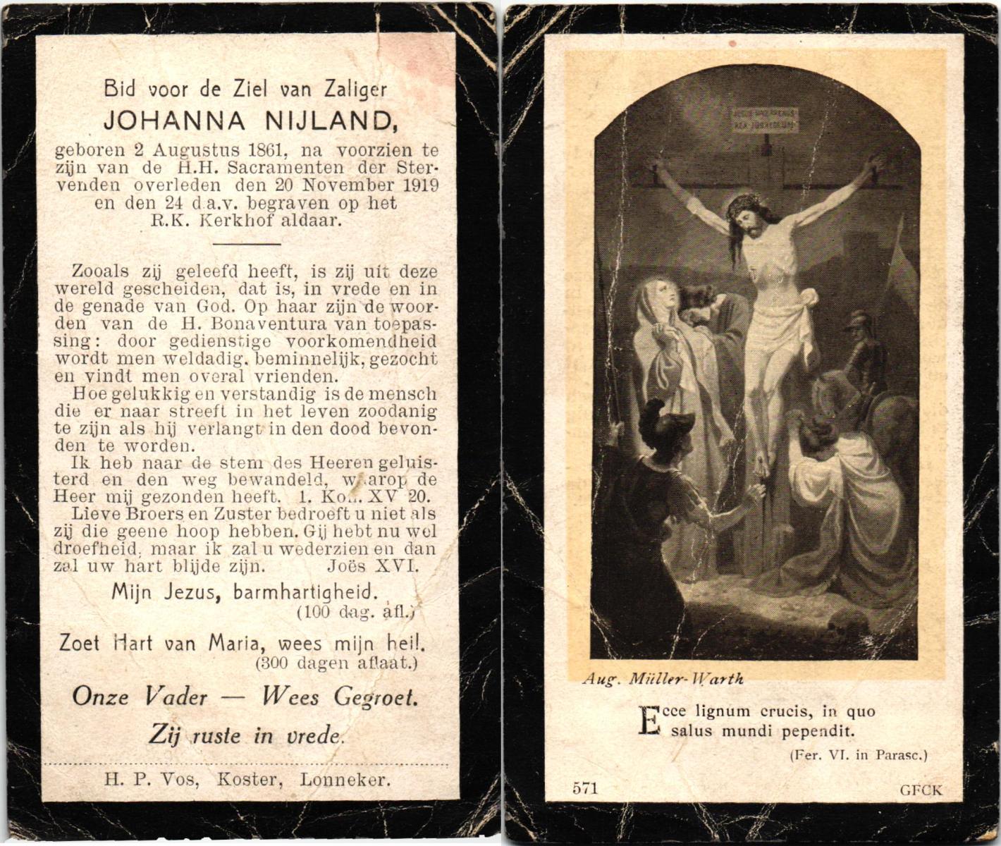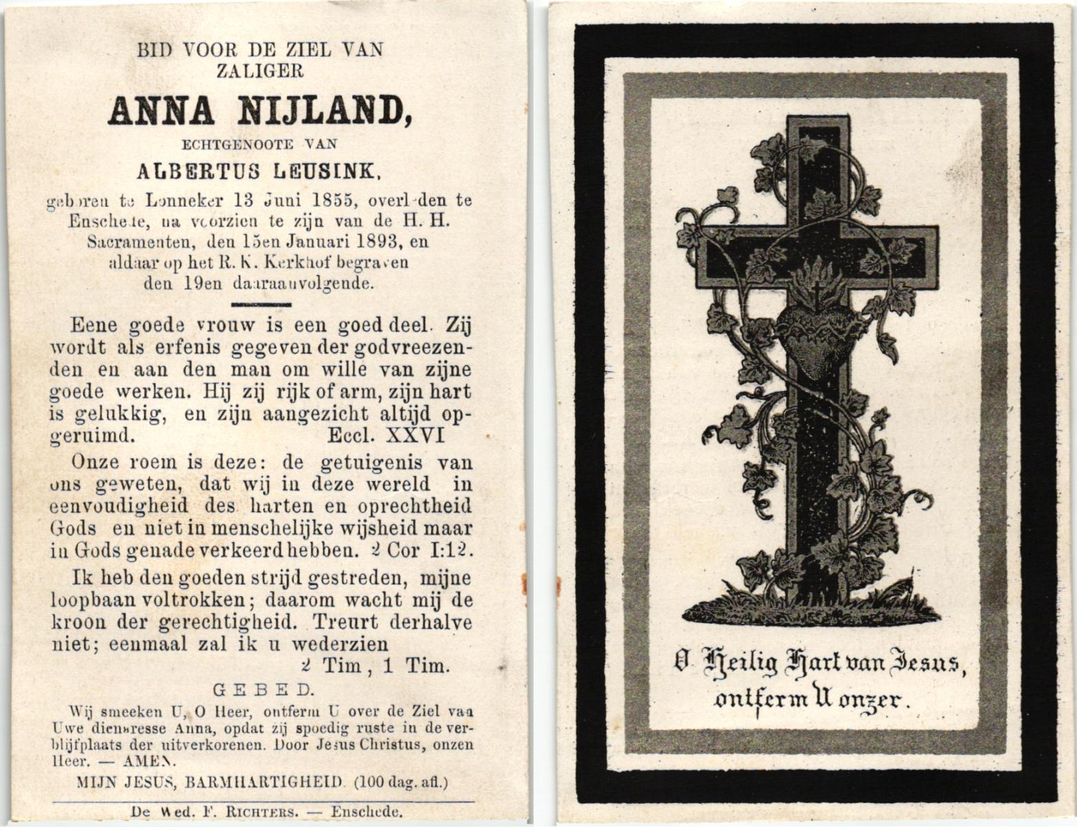 NIJLAND, Geertruida Elisabeth, geboren op 23-08-1863 te Losser, overleden op 23-1-1945 te Oldenzaal op 81-jarige leeftijd, begraven op 26-1-1945 te Oldenzaal.