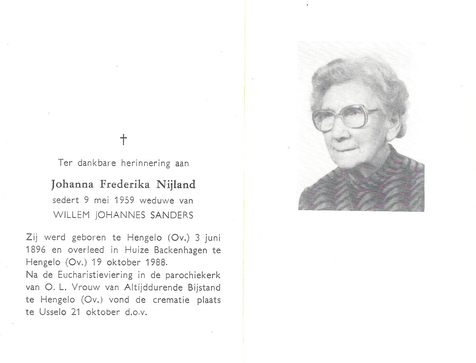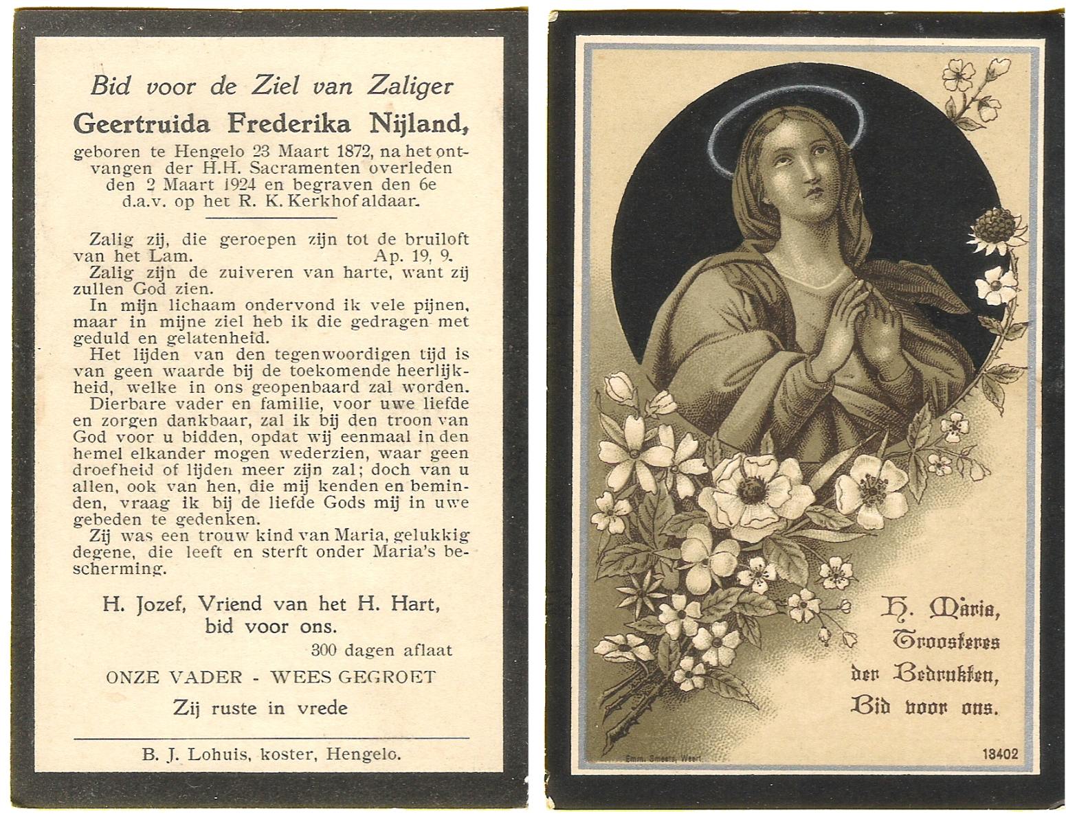 NIJLAND, Geertruida Frederika, geboren op 23-03-1872 te Hengelo (O), overleden op 2-3-1924 te Hengelo (Ov.) op 51-jarige leeftijd, begraven op 6-3-1924 te Hengelo (Ov.).