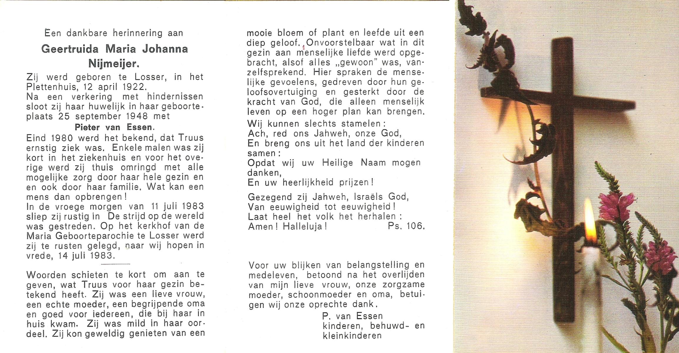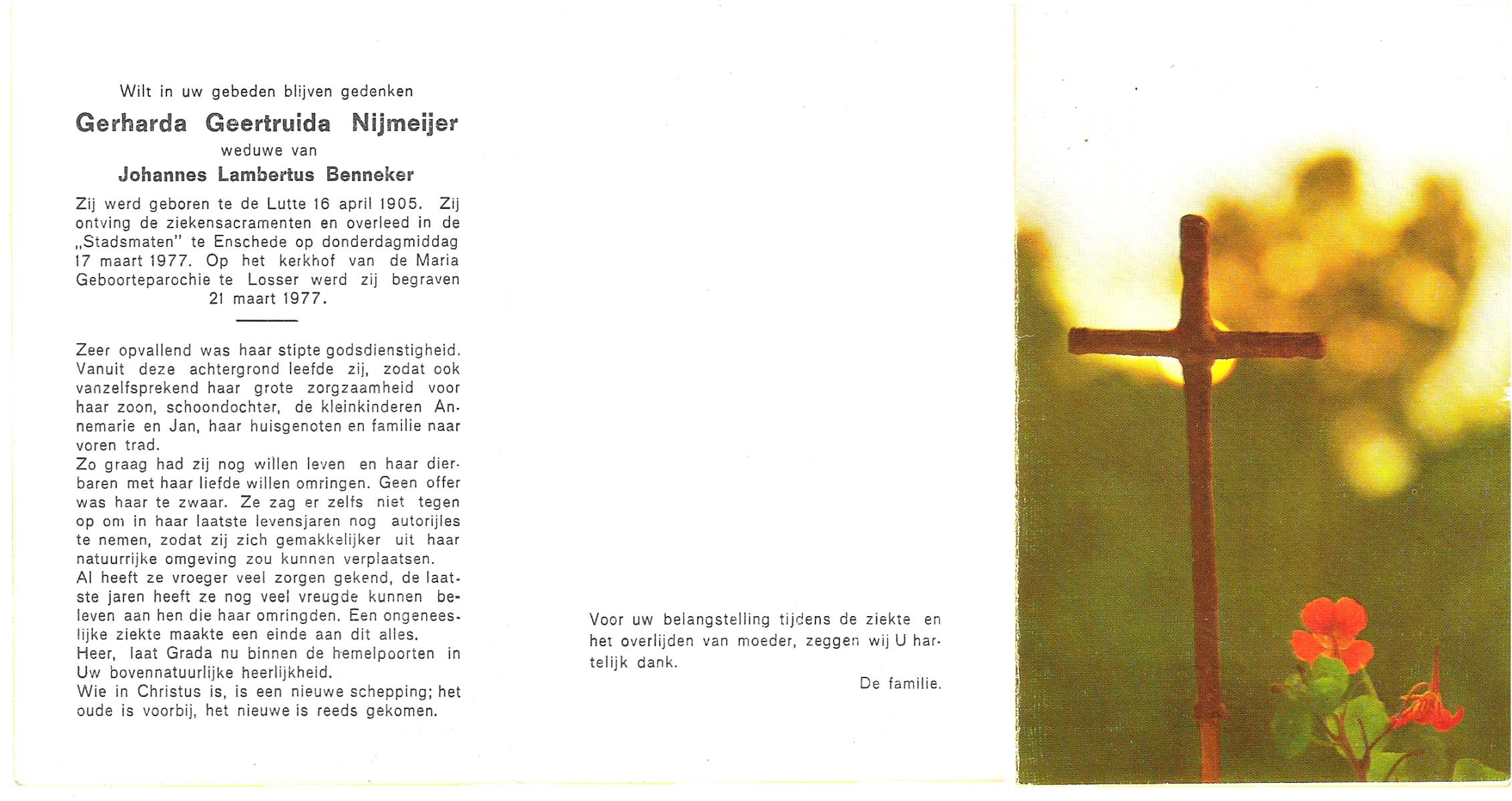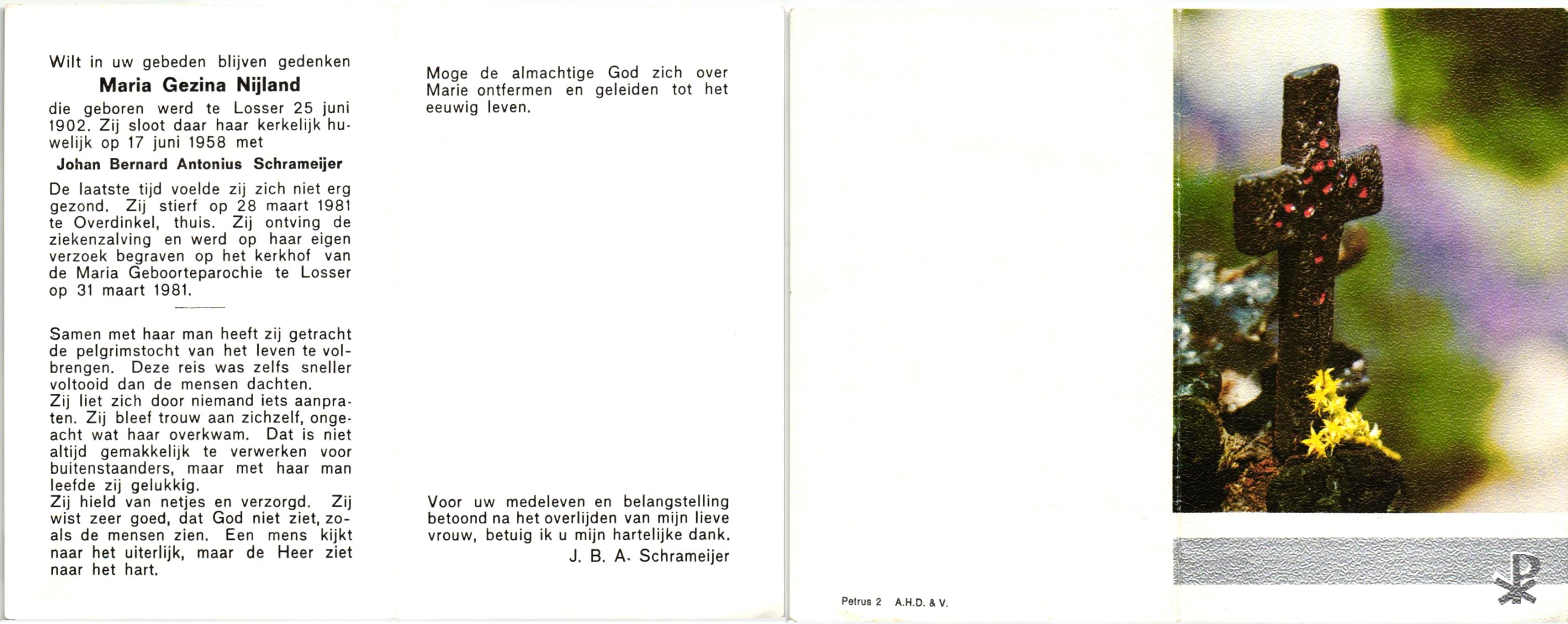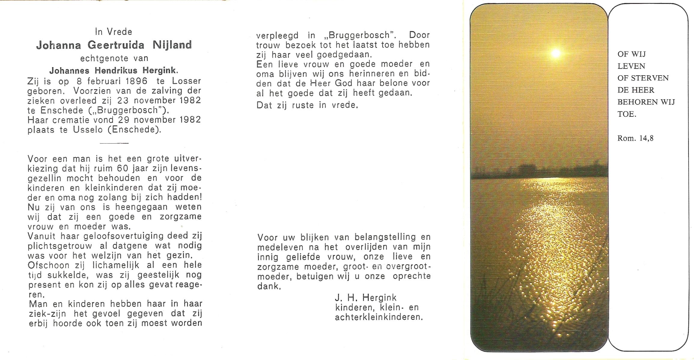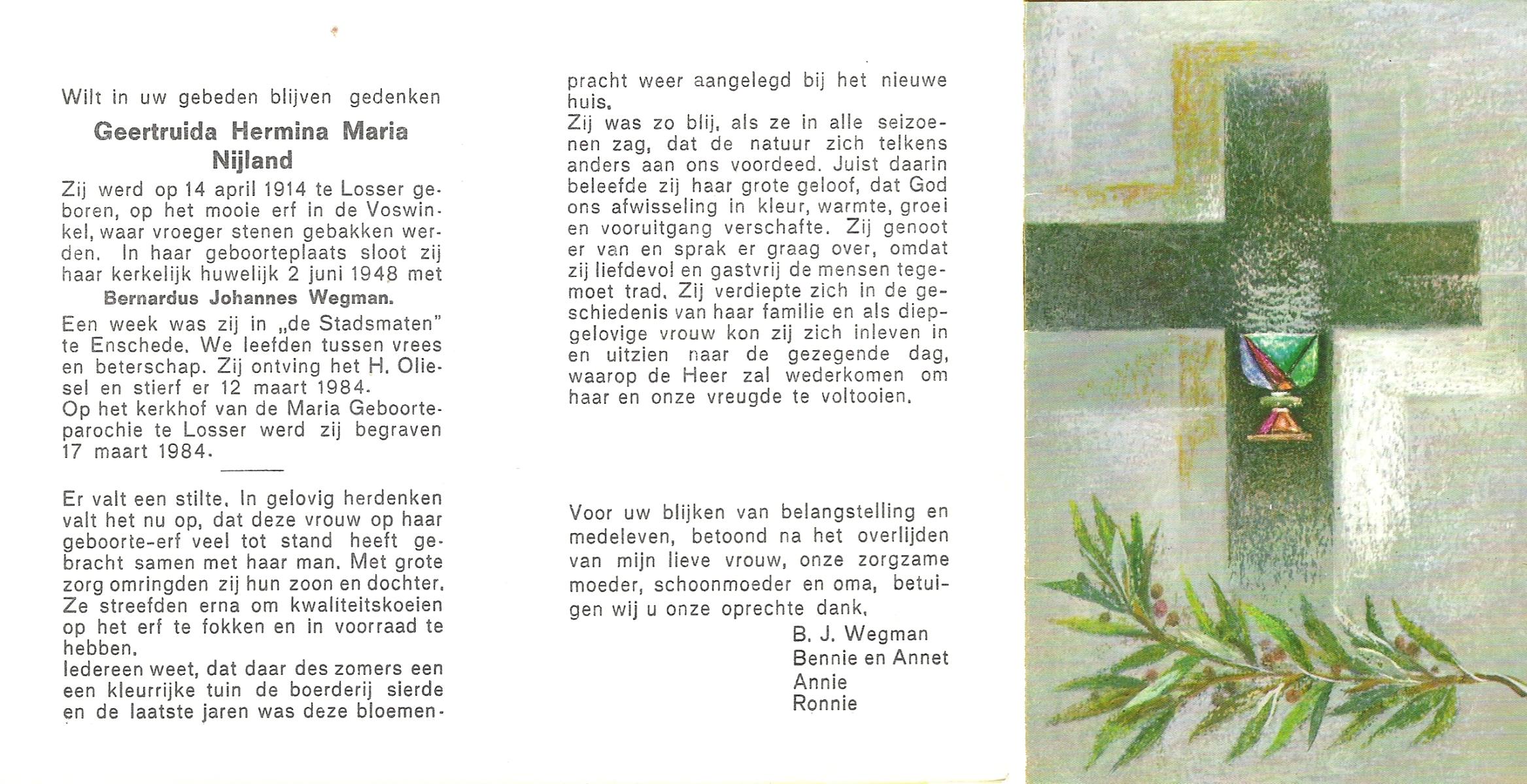 NIJLAND, Geertruida Hermina Maria, geboren op 14-4-1914 te Losser, overleden op 12-3-1984 te Enschede op 69-jarige leeftijd, begraven op 17-3-1984 te Losser.