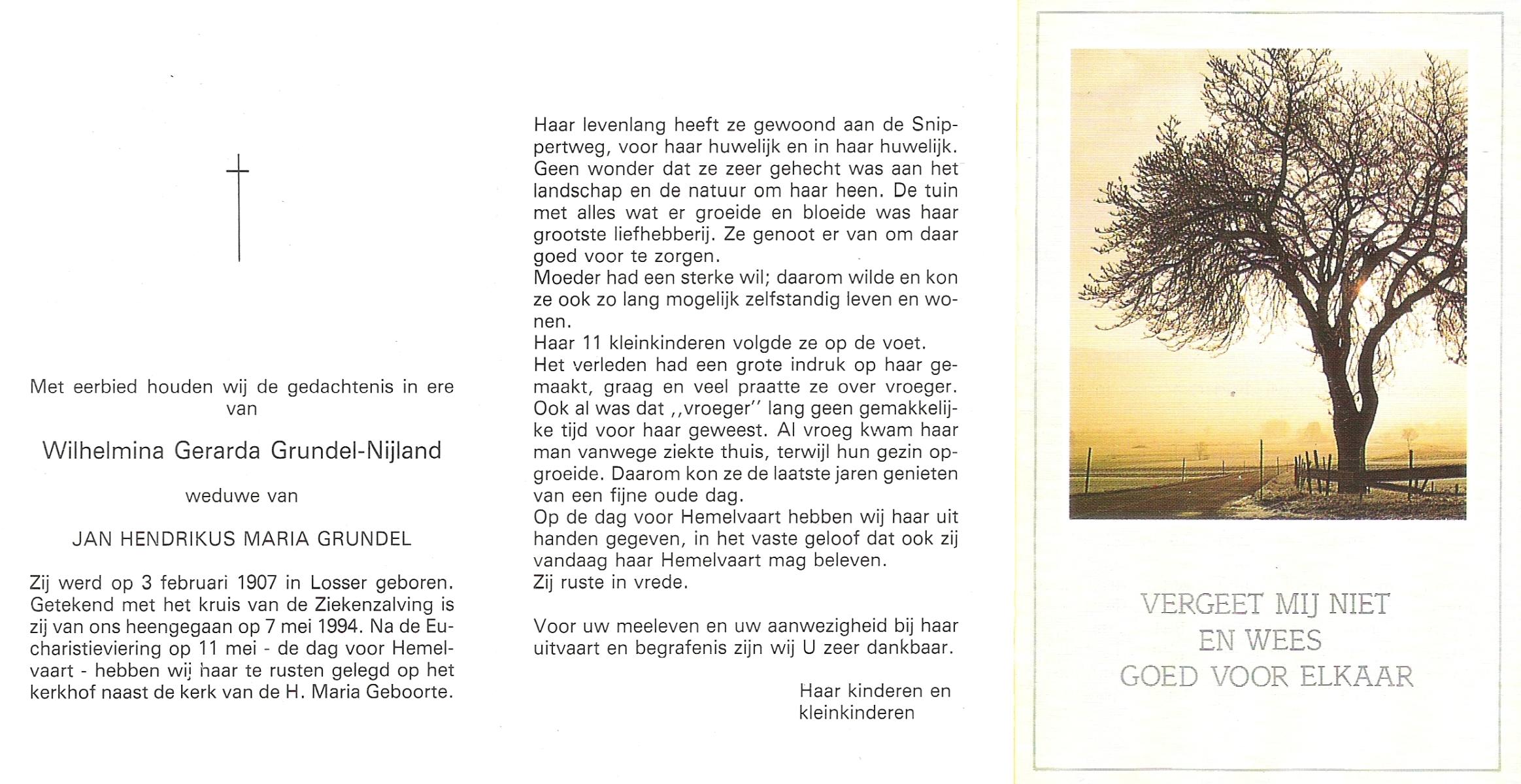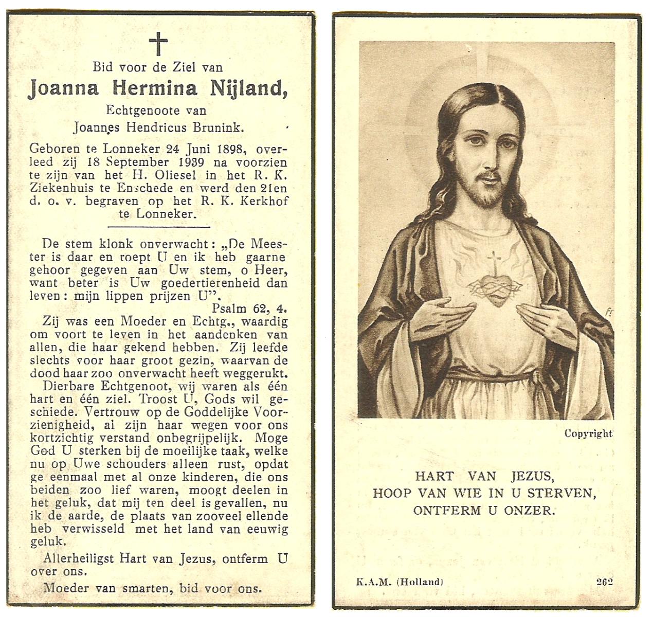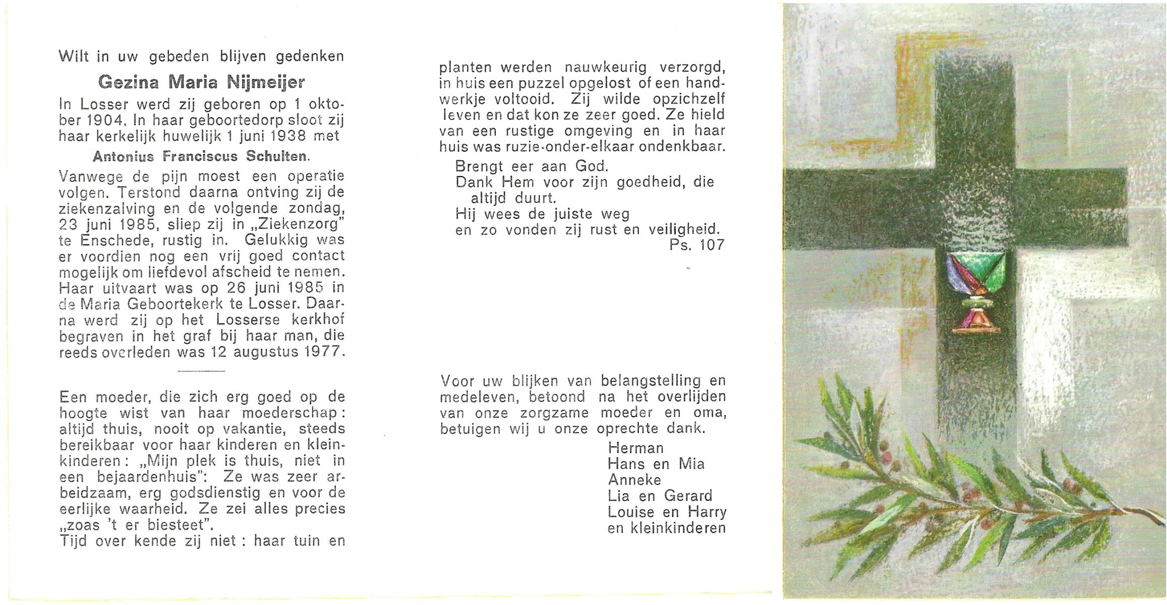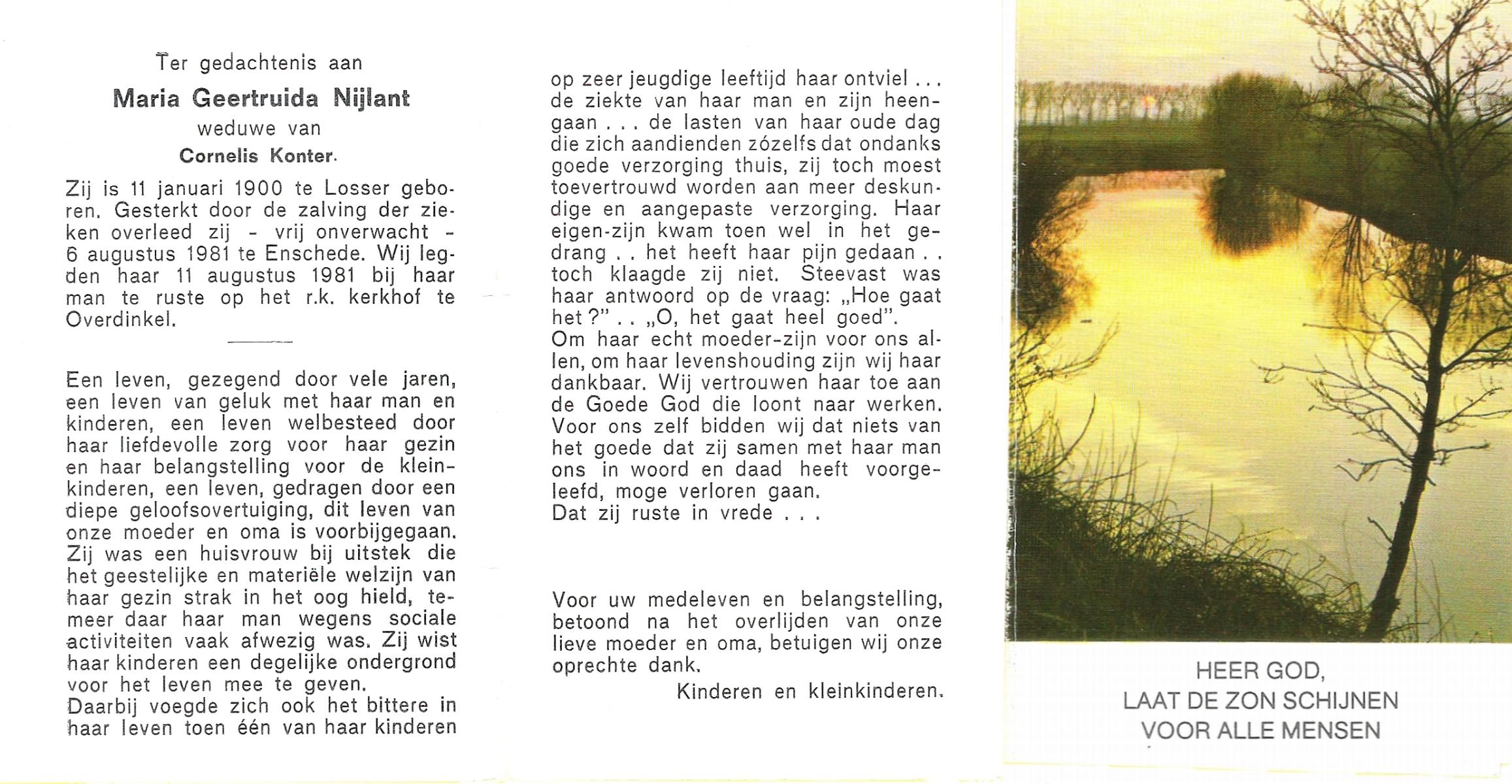 NIJLAND, Geertruida Hermina Maria, geboren op 14-4-1914 te Losser, overleden op 12-3-1984 te Enschede op 69-jarige leeftijd, begraven op 17-3-1984 te Losser.