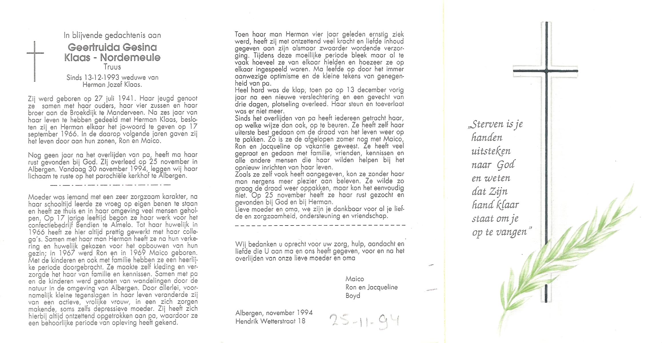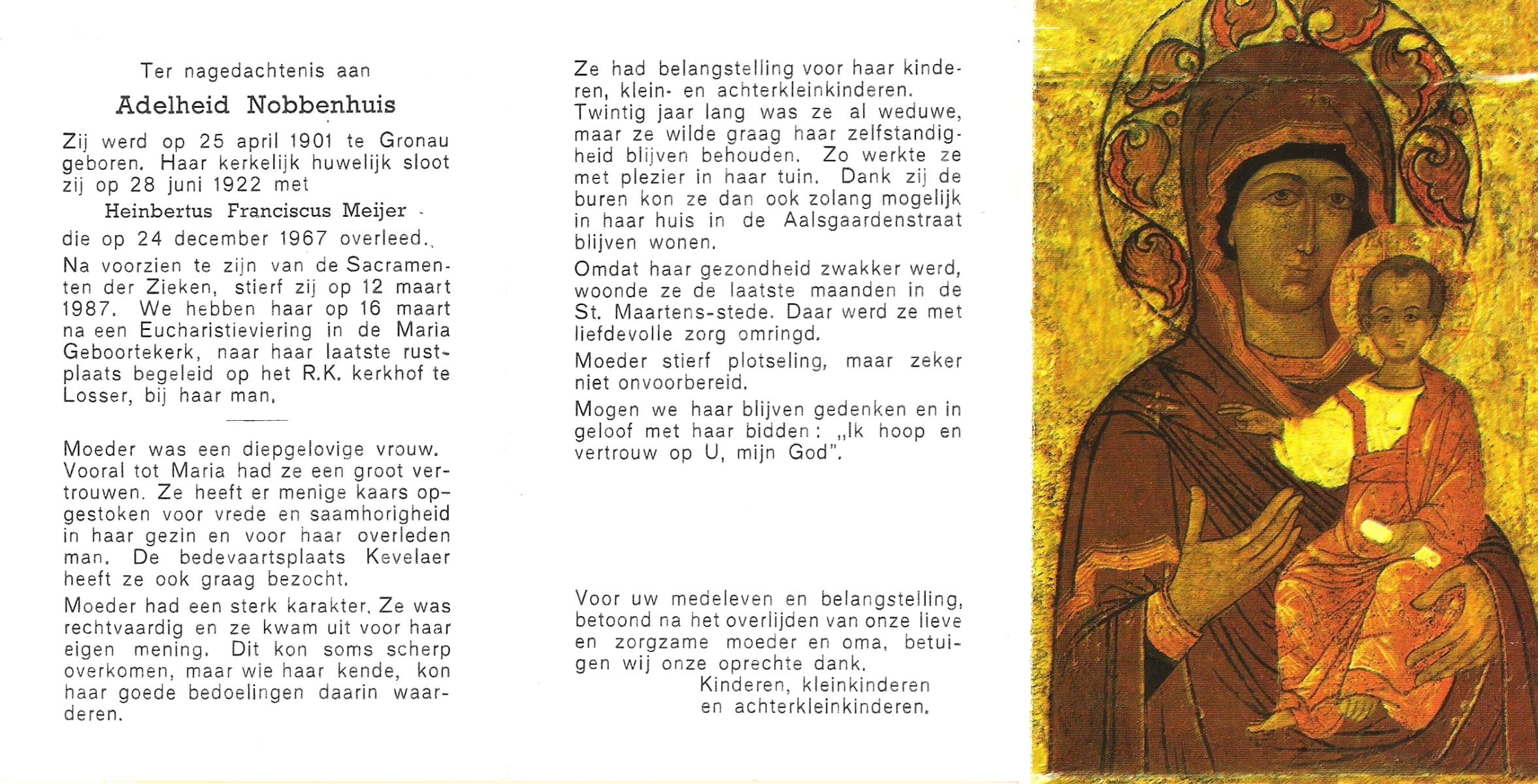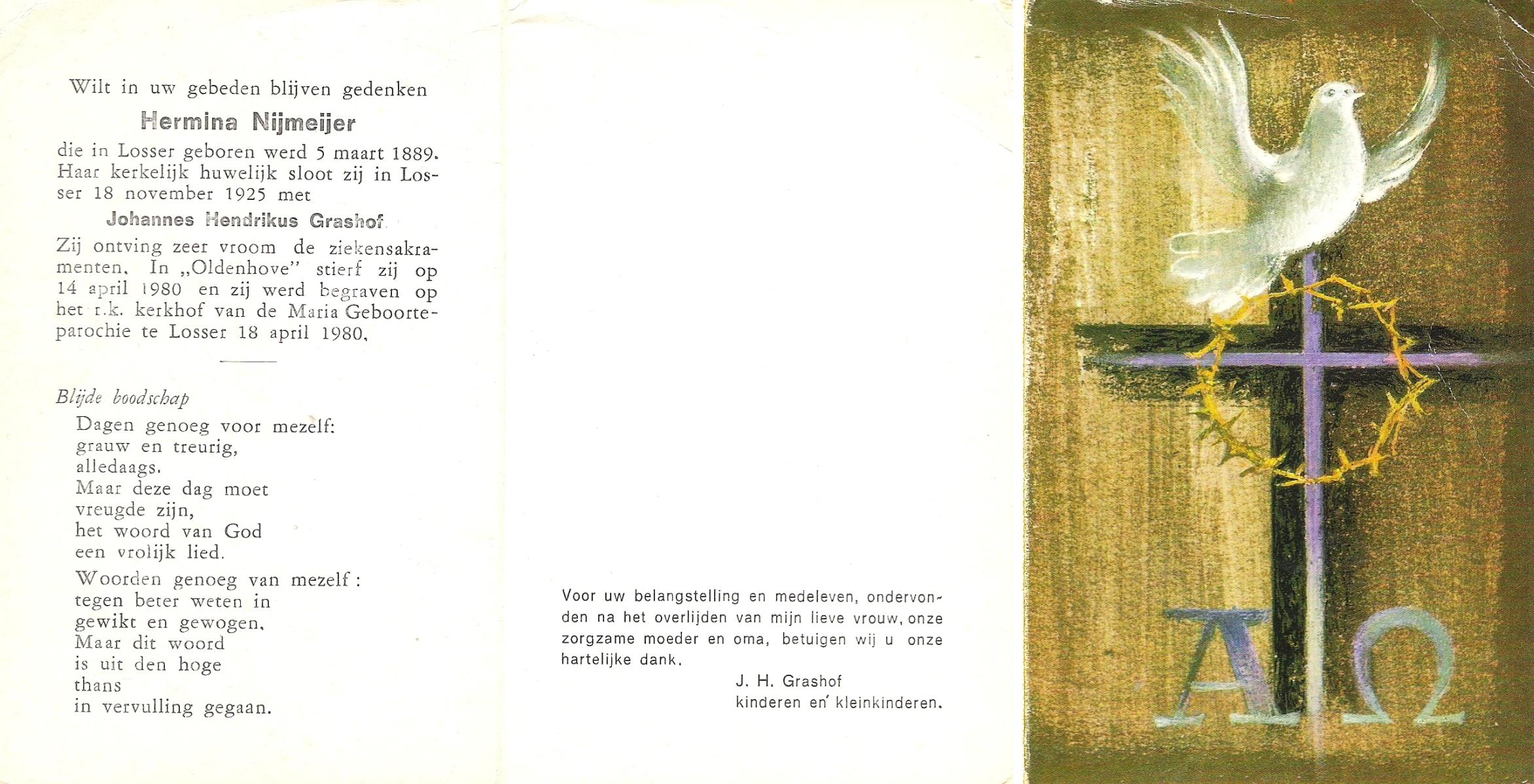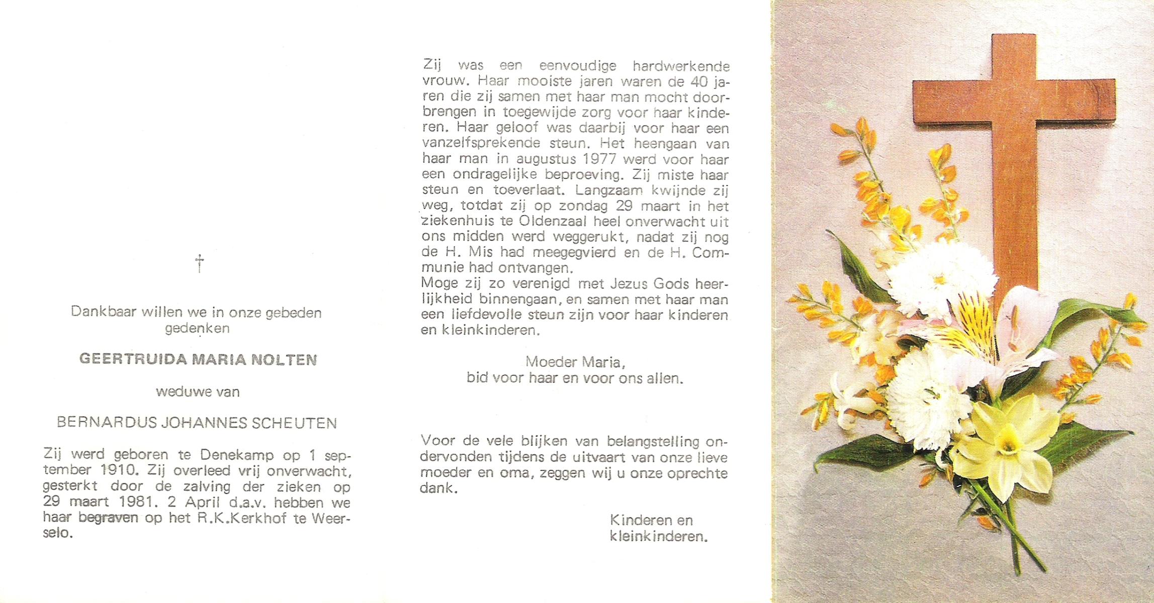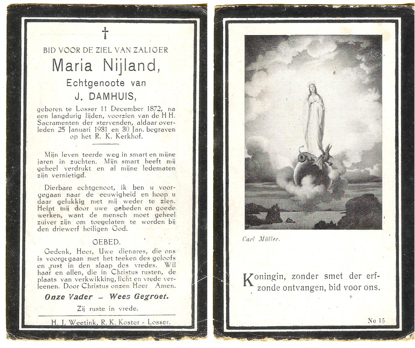 NIJLAND, Geertruida Hermina Maria, geboren op 14-4-1914 te Losser, overleden op 12-3-1984 te Enschede op 69-jarige leeftijd, begraven op 17-3-1984 te Losser.