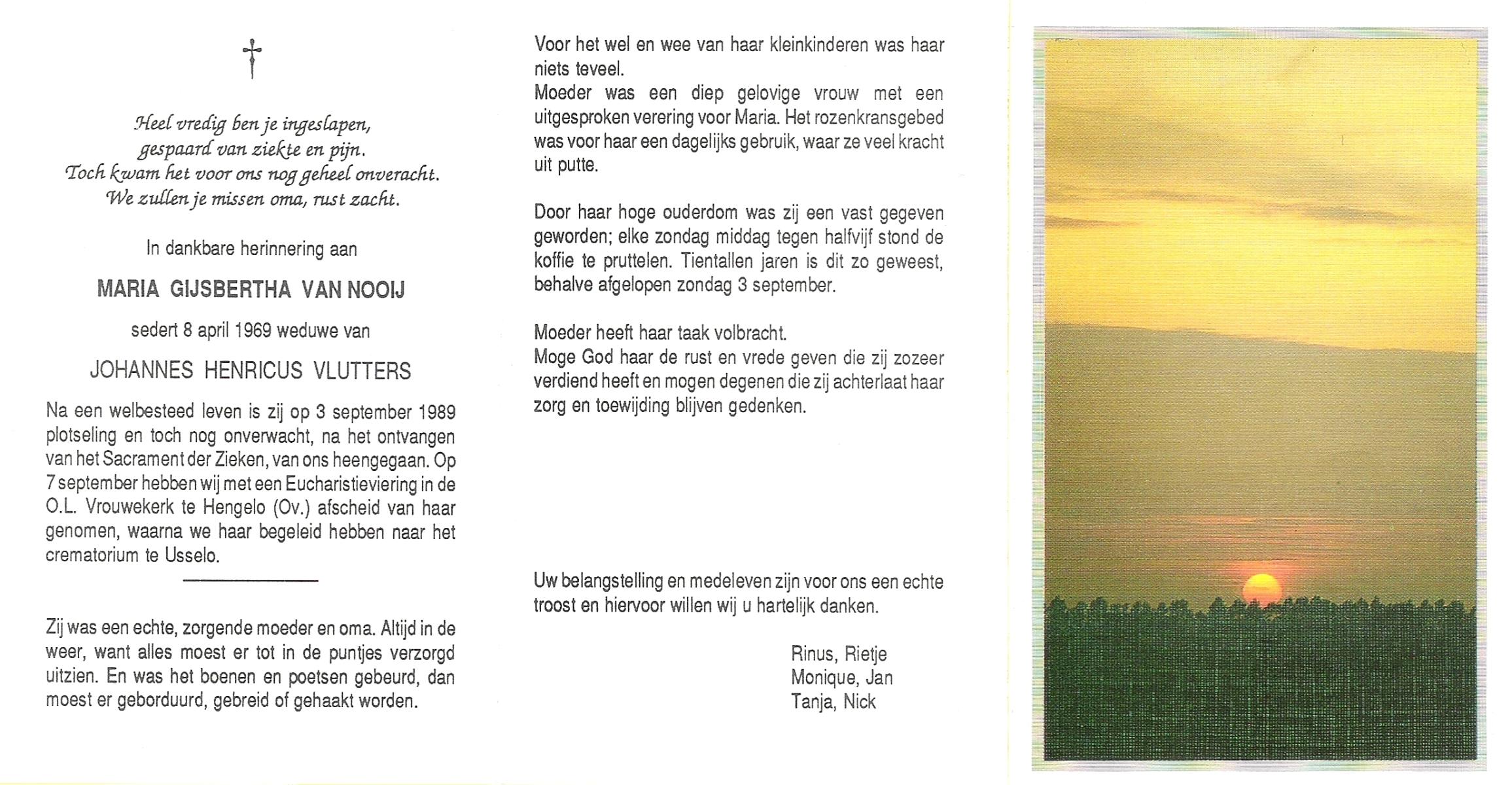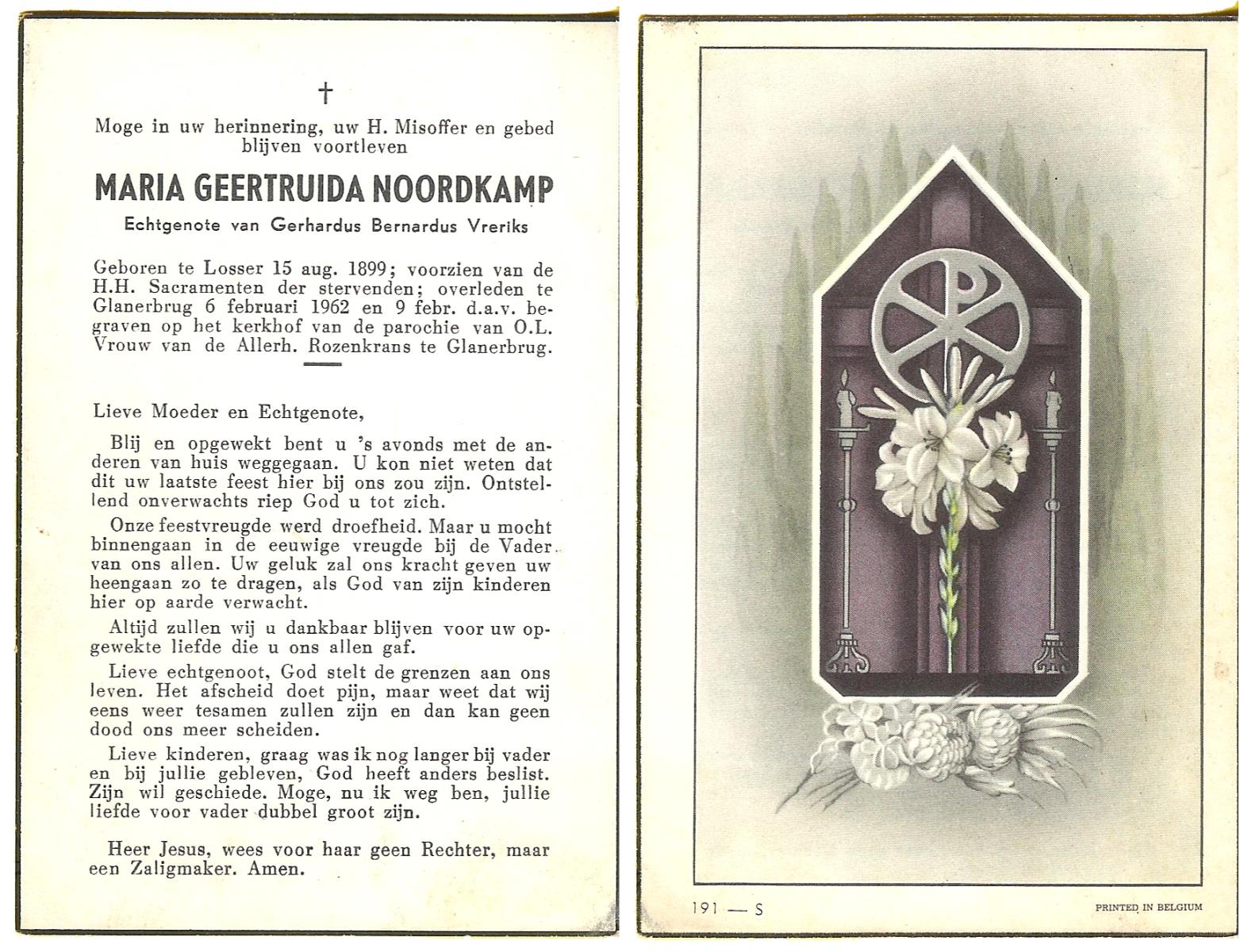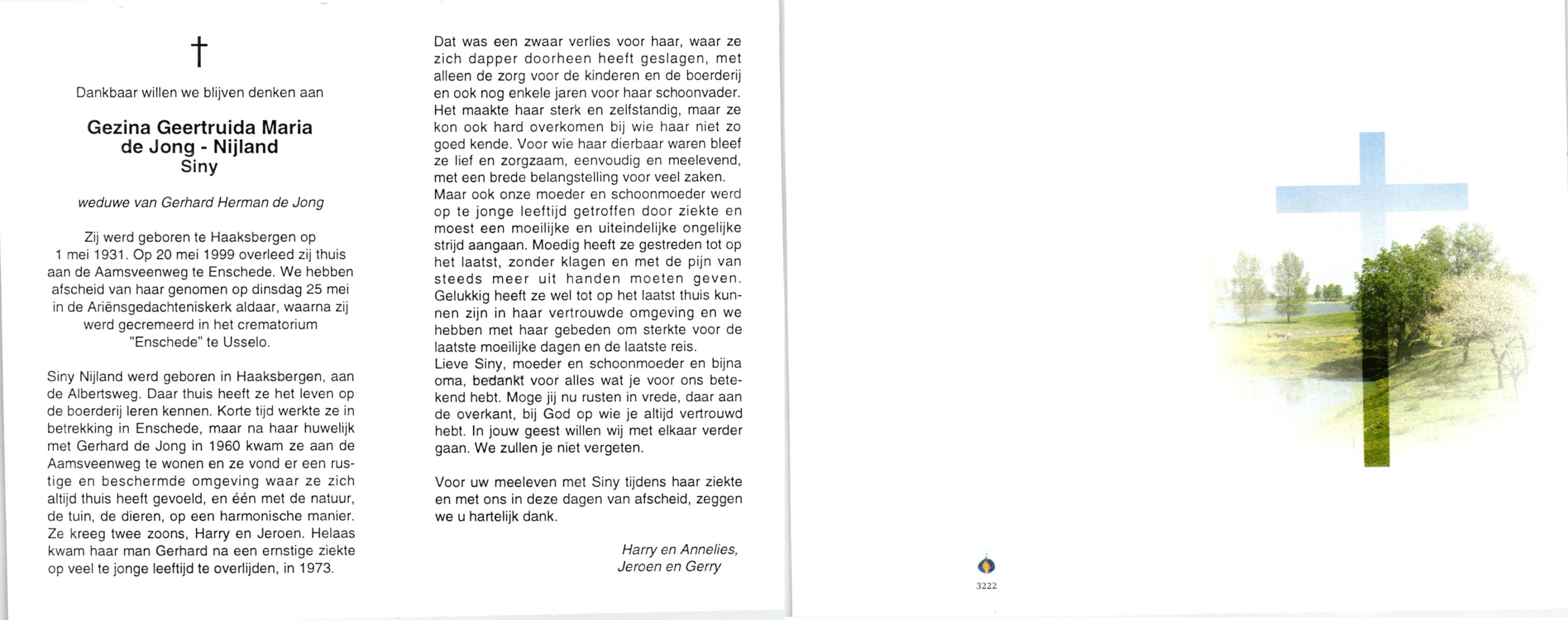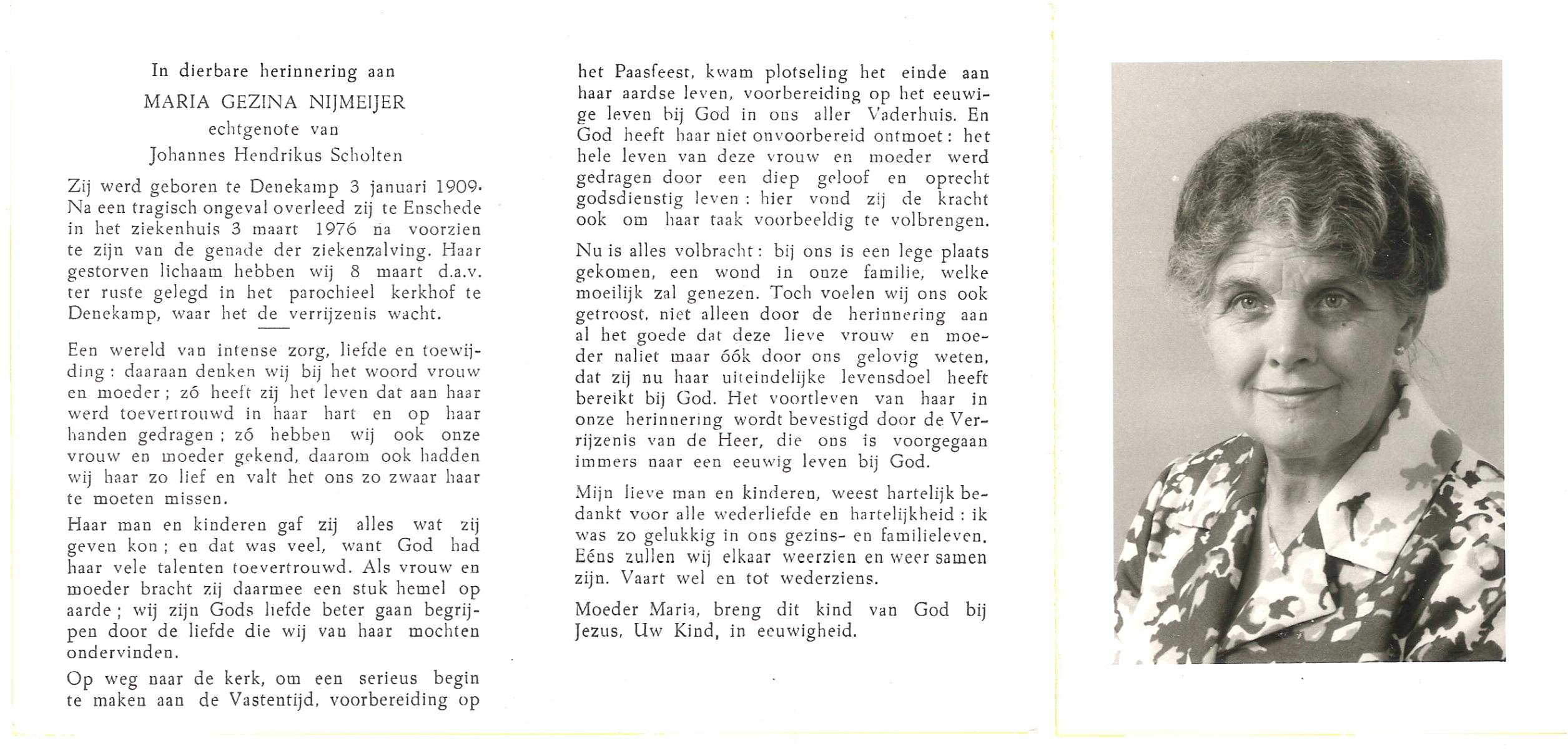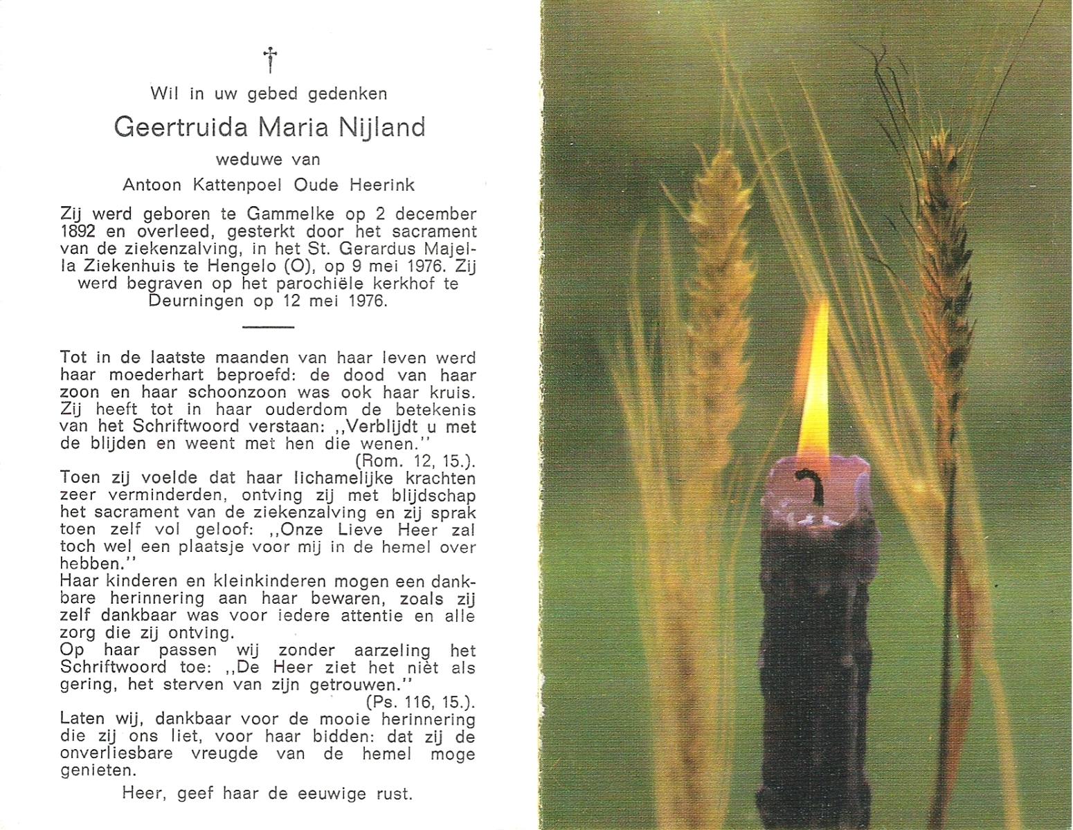 NIJLAND, Geertruida Maria, geboren op 02-12-1892 te Gammelke, overleden op 9-5-1976 te Hengelo (Ov.) op 83-jarige leeftijd, begraven op 12-5-1976 te Deurningen.