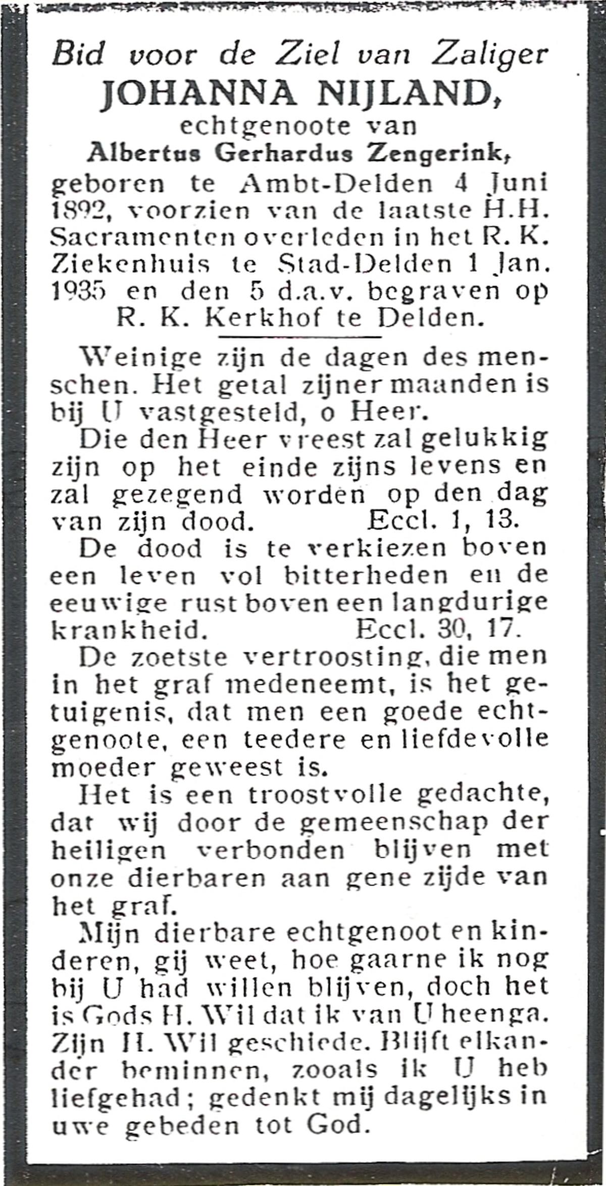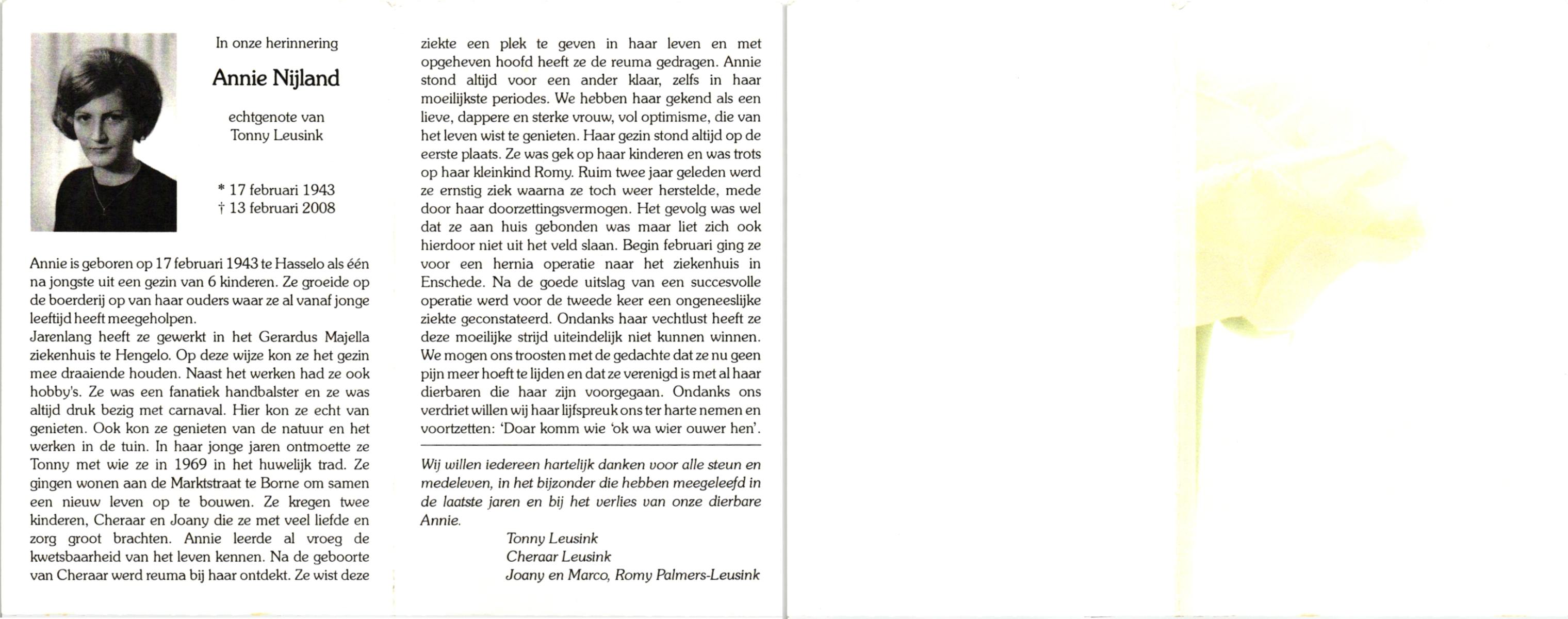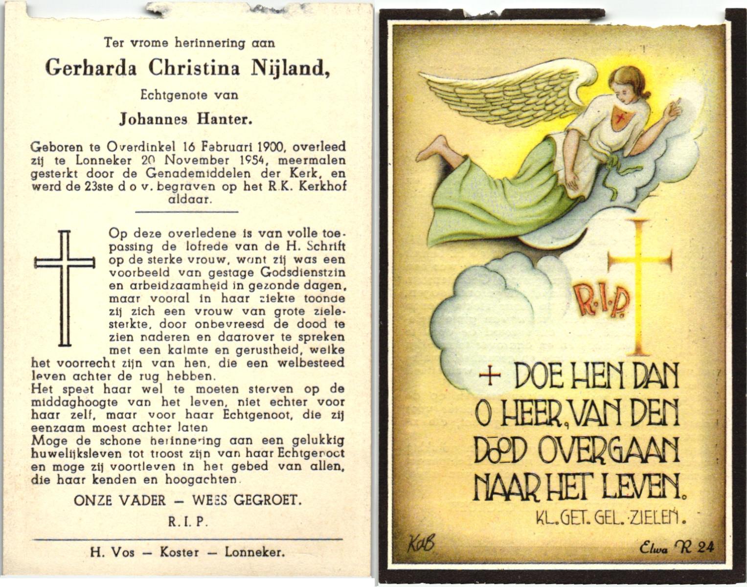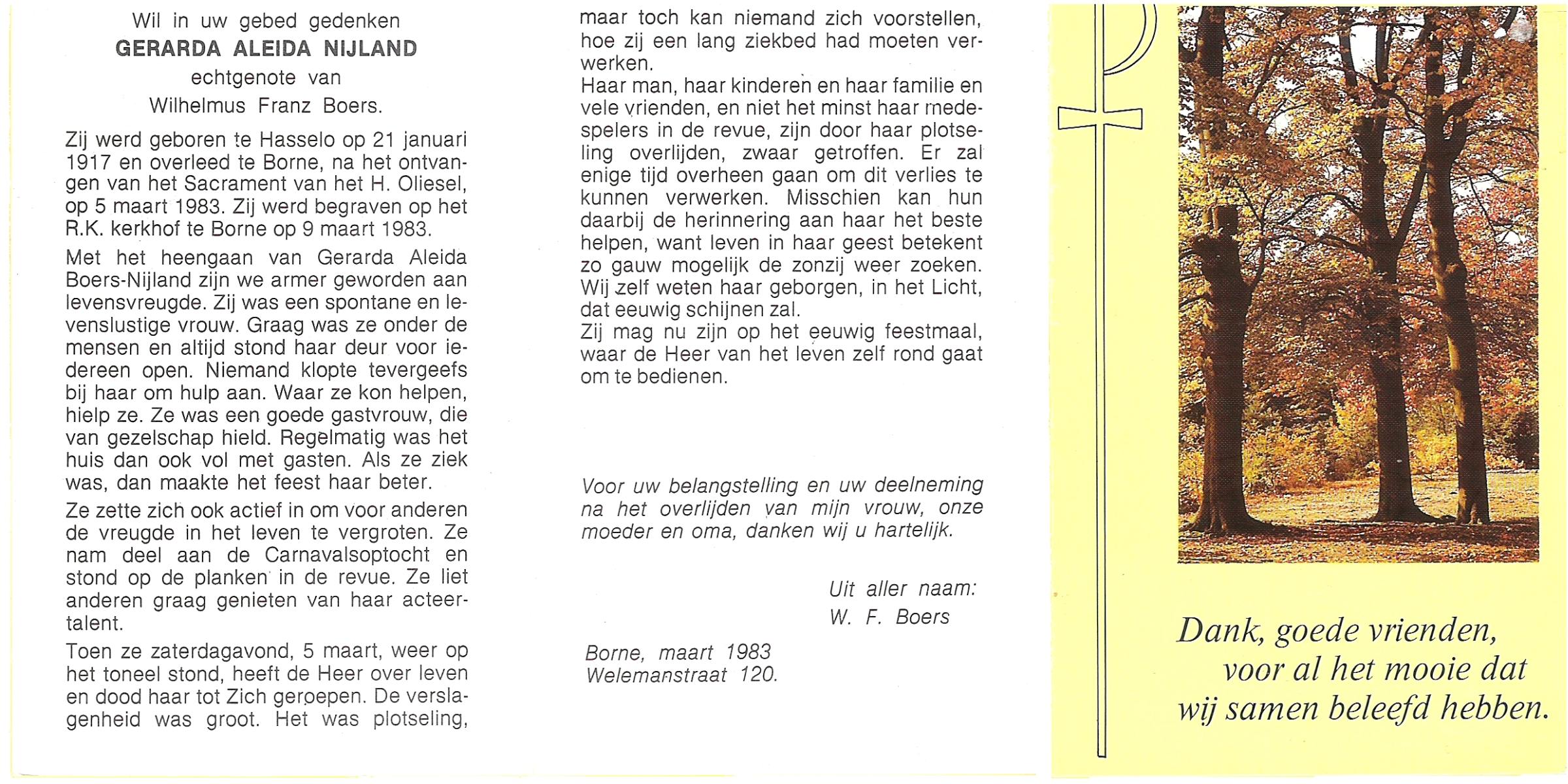 NIJLAND, Gerarda Aleida, geboren op 21-1-1917 te Hasselo, overleden op 5-3-1983 te Borne op 66-jarige leeftijd, begraven op 9-3-1983 te Borne.