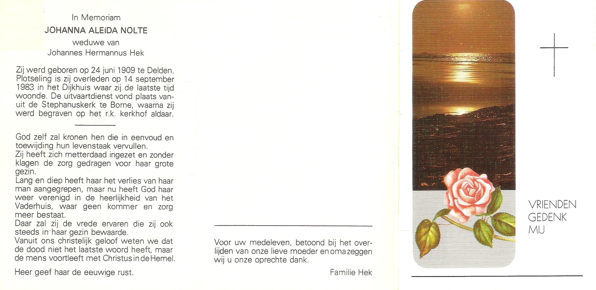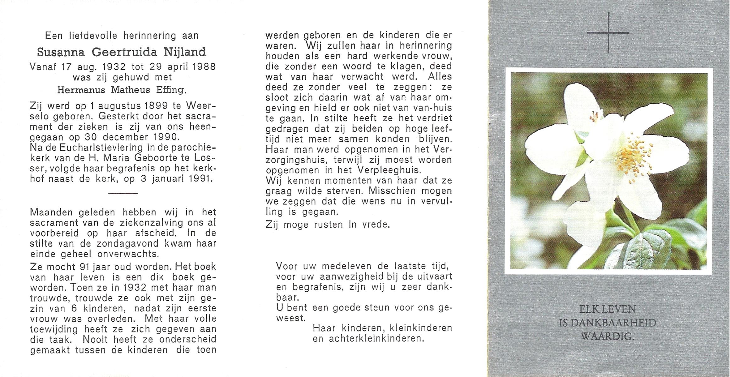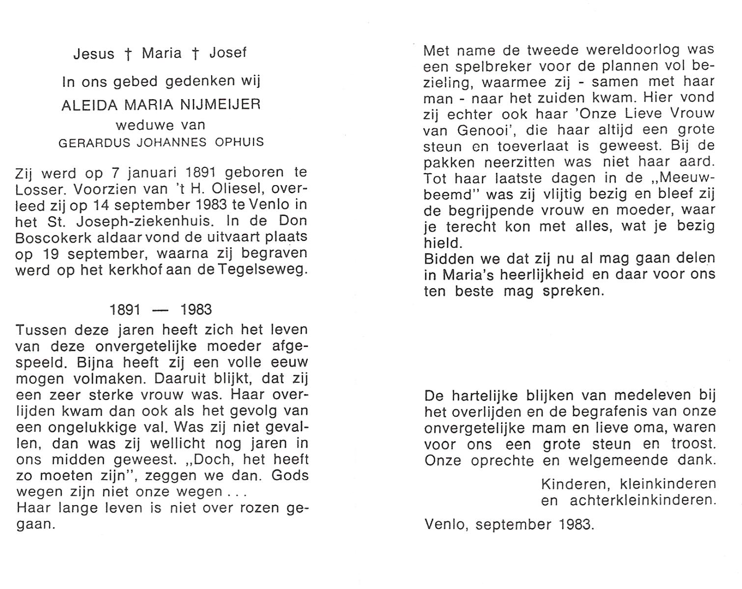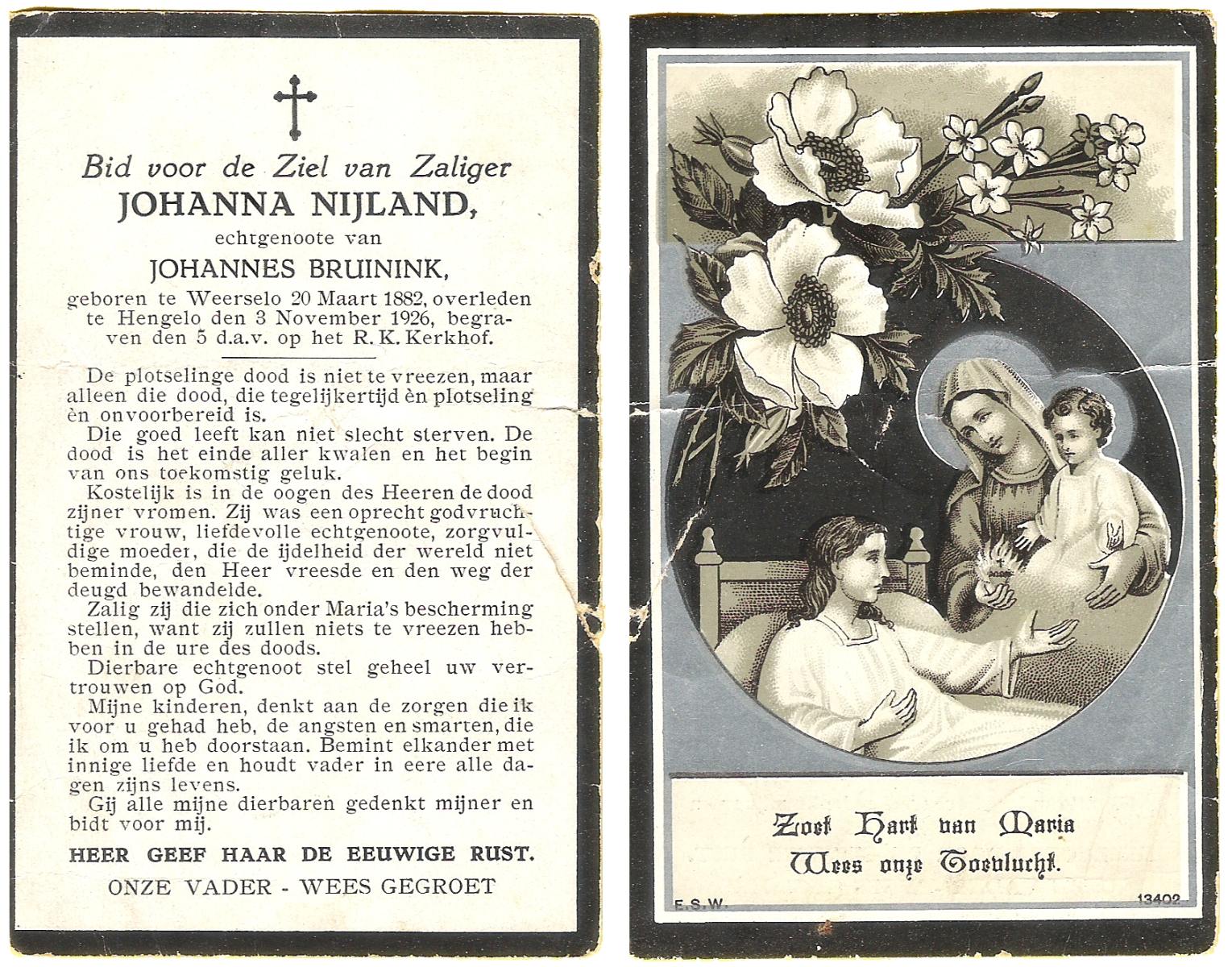 NIJLAND, Gerarda Aleida, geboren op 21-1-1917 te Hasselo, overleden op 5-3-1983 te Borne op 66-jarige leeftijd, begraven op 9-3-1983 te Borne.