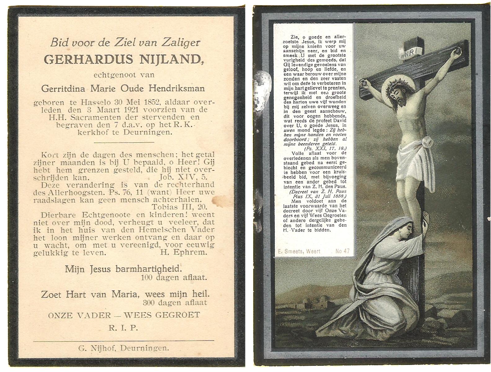 NIJLAND, Gerhardus, geboren op 30-05-1852 te Hasselo, overleden op 3-3-1921 te Hasselo op 68-jarige leeftijd, begraven op 7-3-1921 te Deurningen.