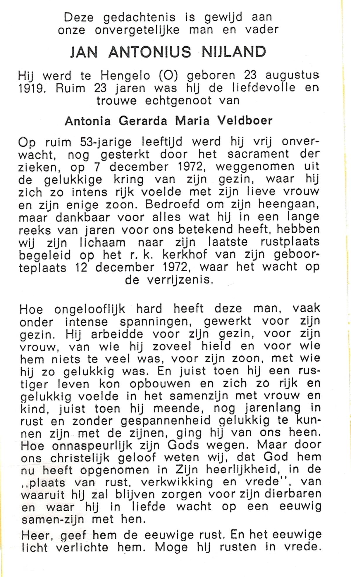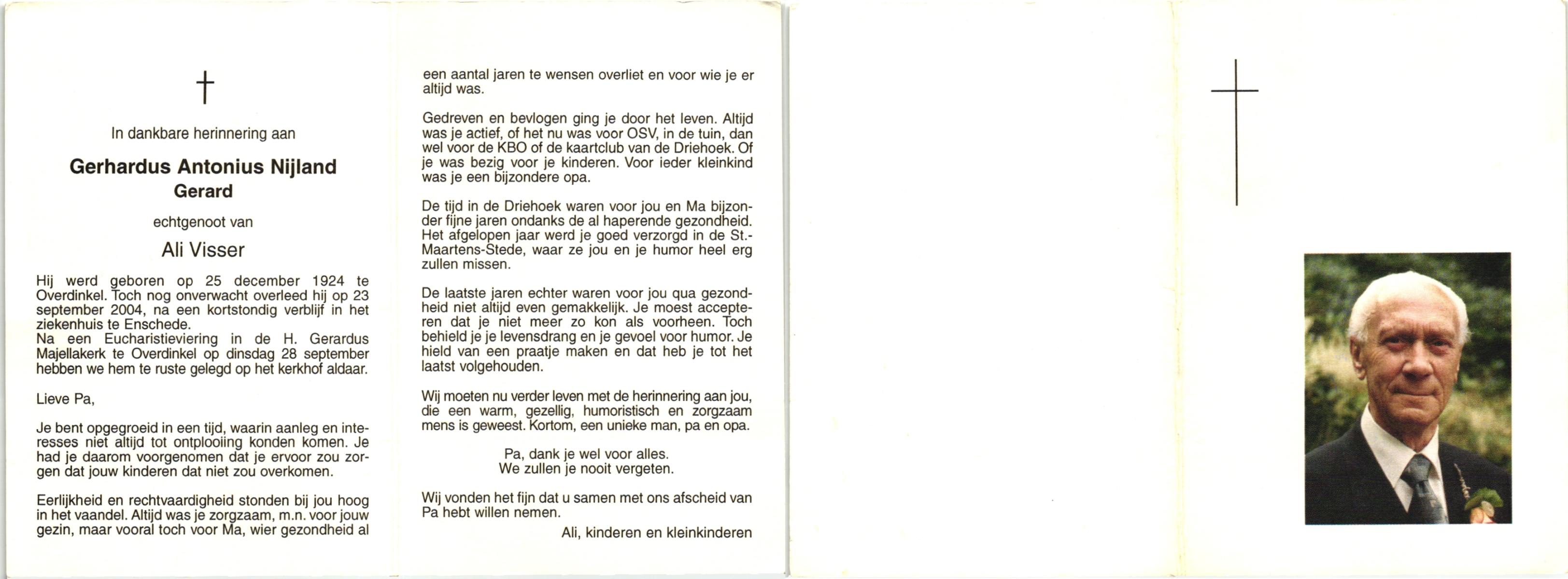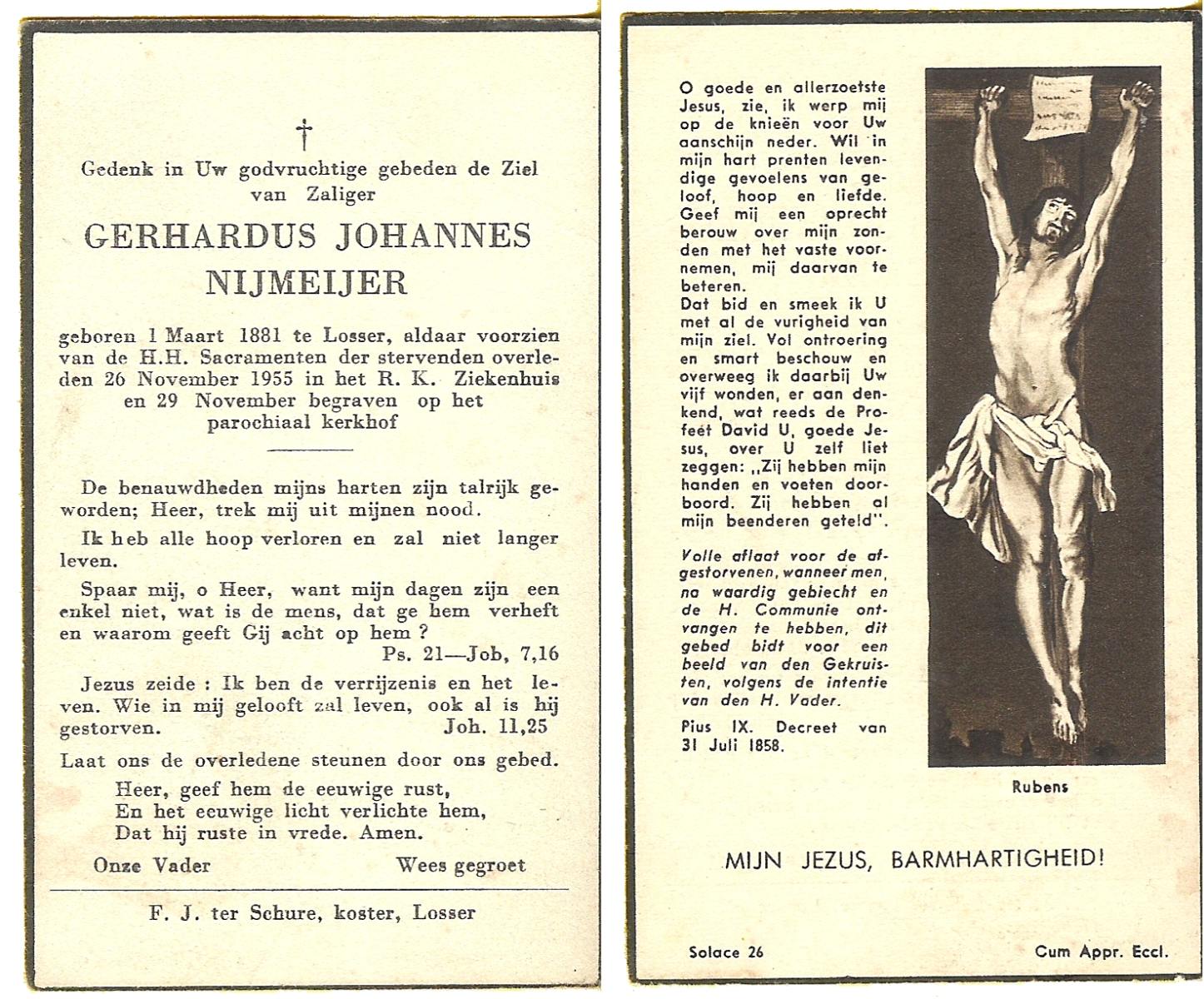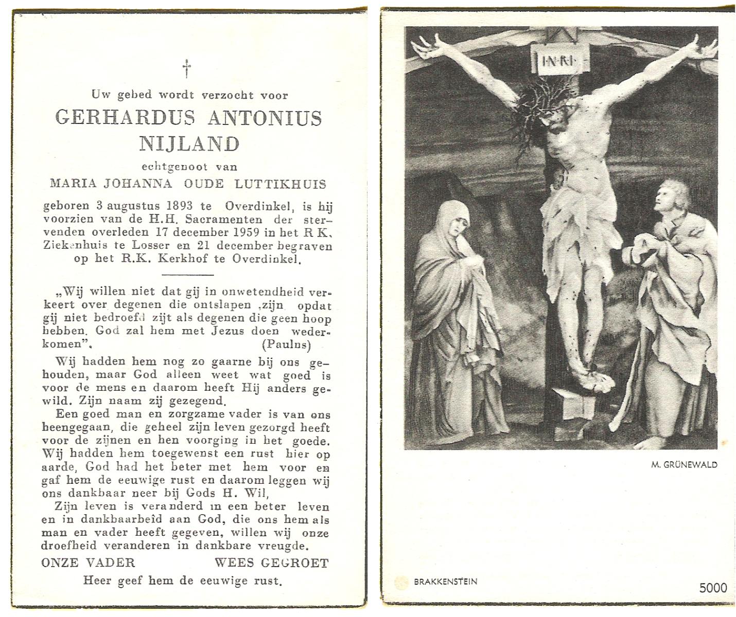 NIJLAND, Gerhardus Antonius, geboren op 03-08-1893 te Overdinkel, overleden op 17-12-1959 te Losser op 66-jarige leeftijd, begraven op 21-12-1959 te Overdinkel.