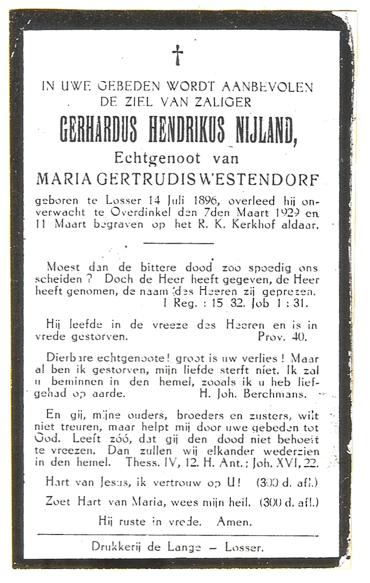 NIJLAND, Gerhardus Hendrikus, geboren op 14-07-1896 te Losser, overleden op 7-3-1929 te Overdinkel op 32-jarige leeftijd, begraven op 11-3-1929 te Overdinkel.