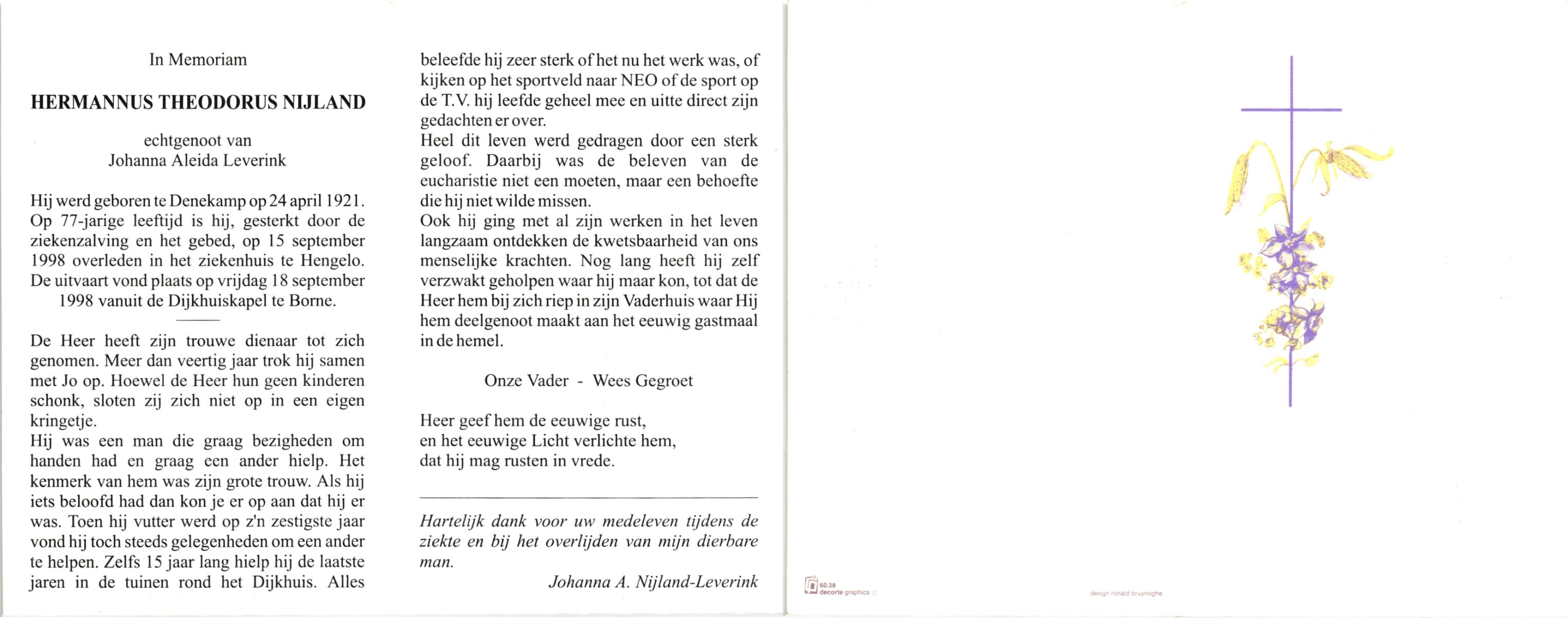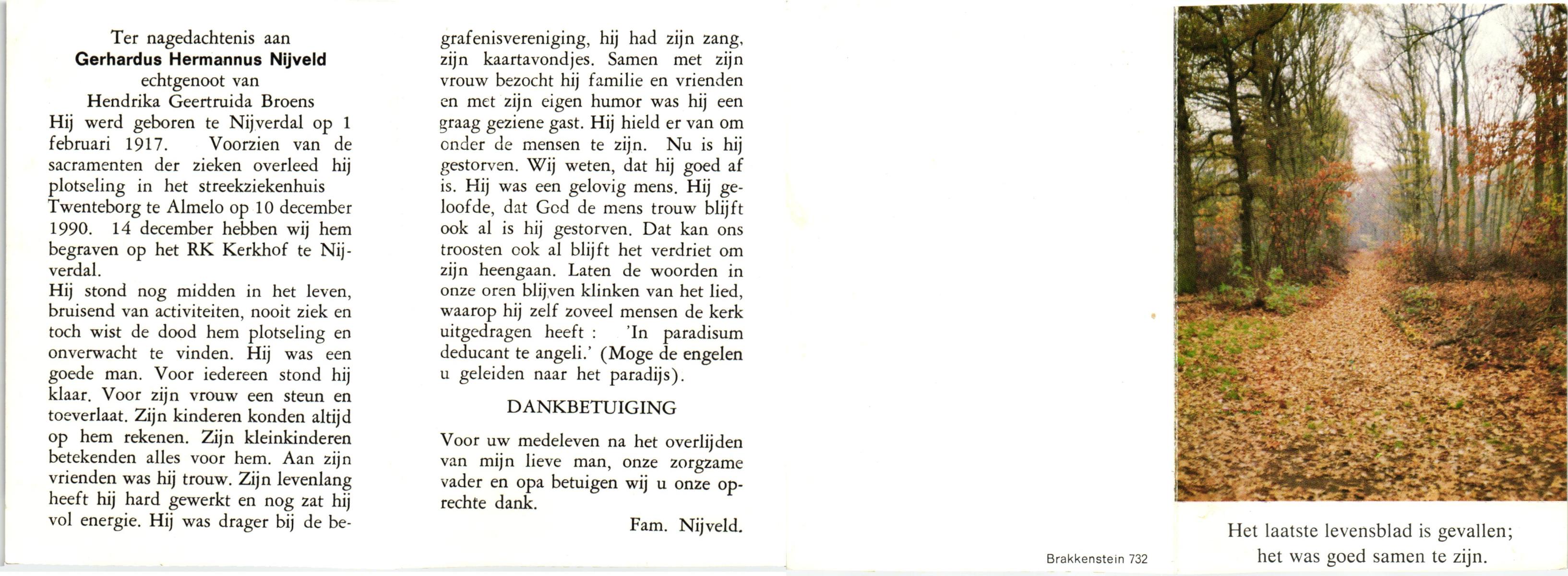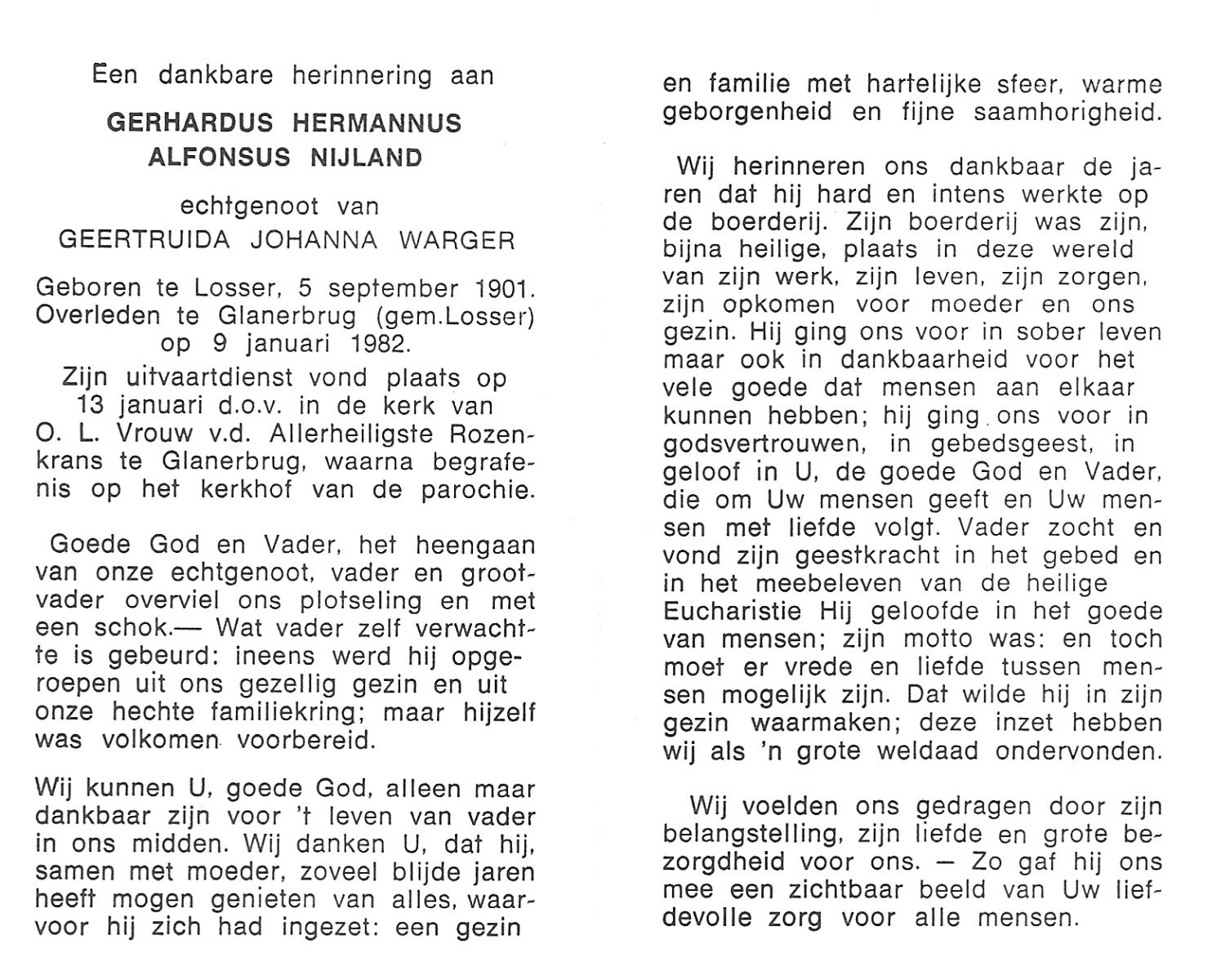 NIJLAND, Gerhardus Hermannus Alfonsus, geboren op 5-9-1901 te Losser, overleden op 9-1-1982 te Glanerbrug op 80-jarige leeftijd, begraven op 13-1-1982 te Glanerbrug.