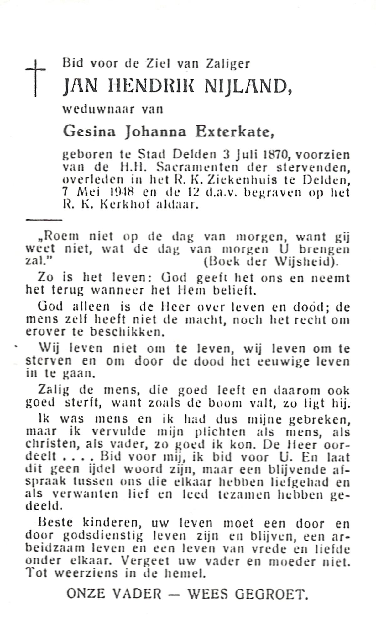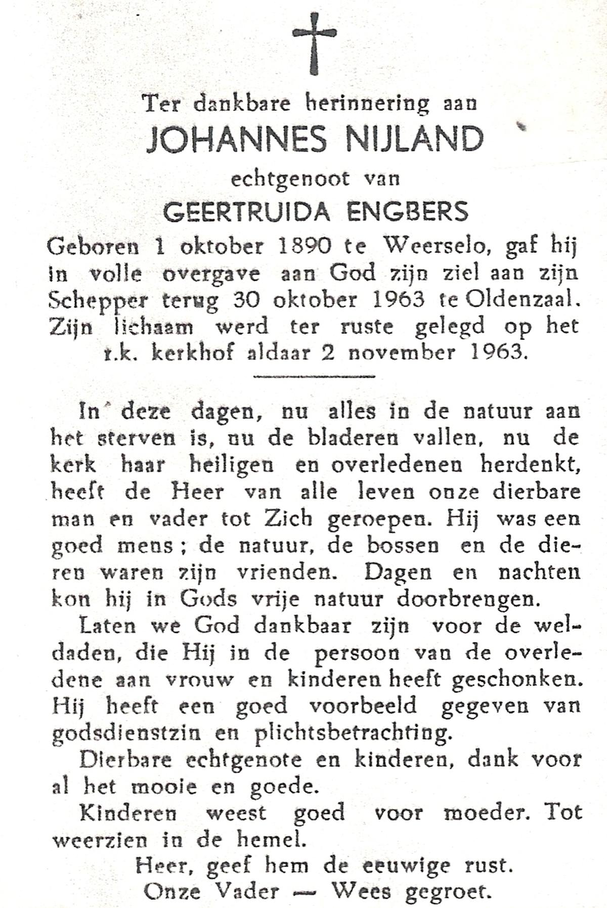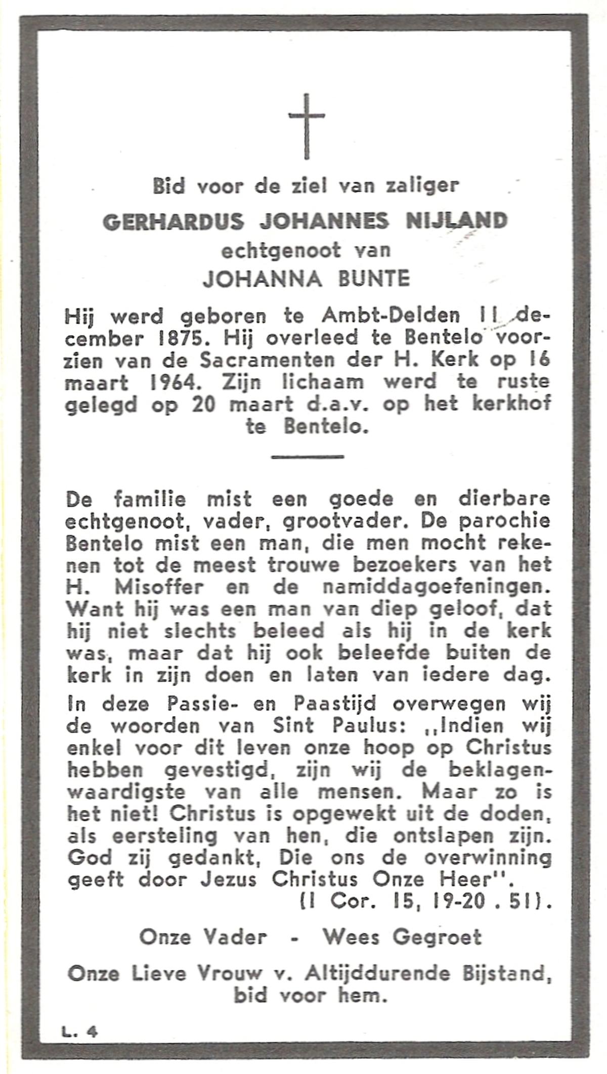 NIJLAND, Gerhardus Johannes, geboren op 11-12-1875 te Delden, Ambt, overleden op 16-3-1964 te Bentelo op 88-jarige leeftijd, begraven op 20-3-1964 te Bentelo.