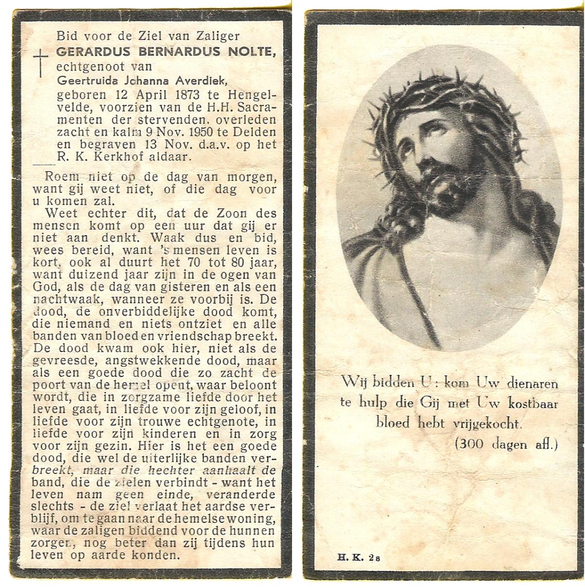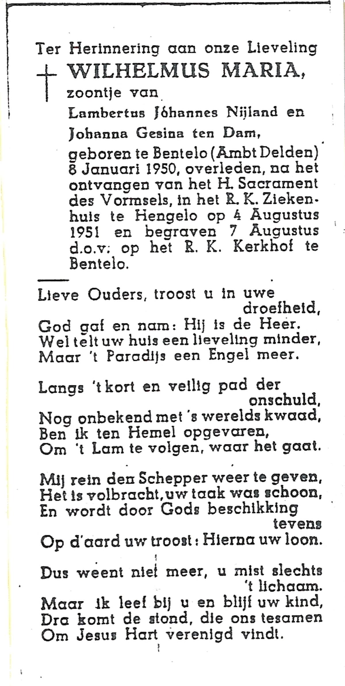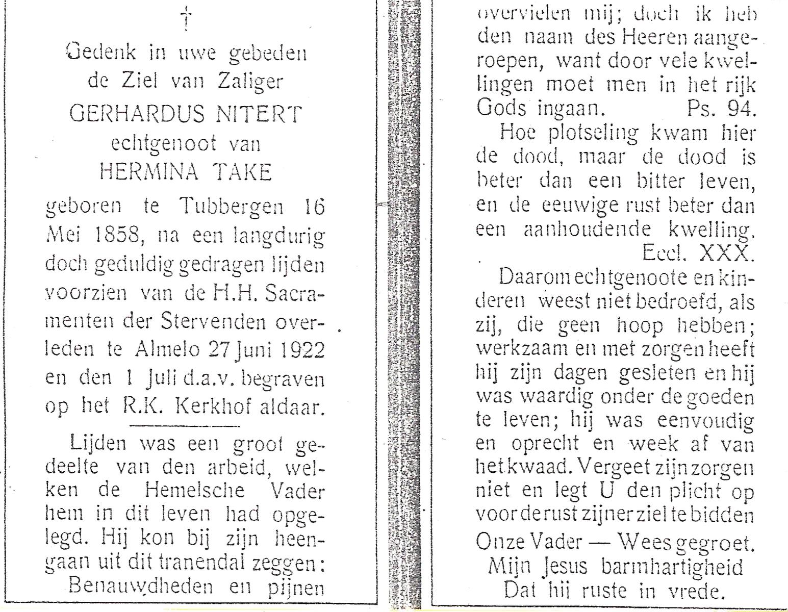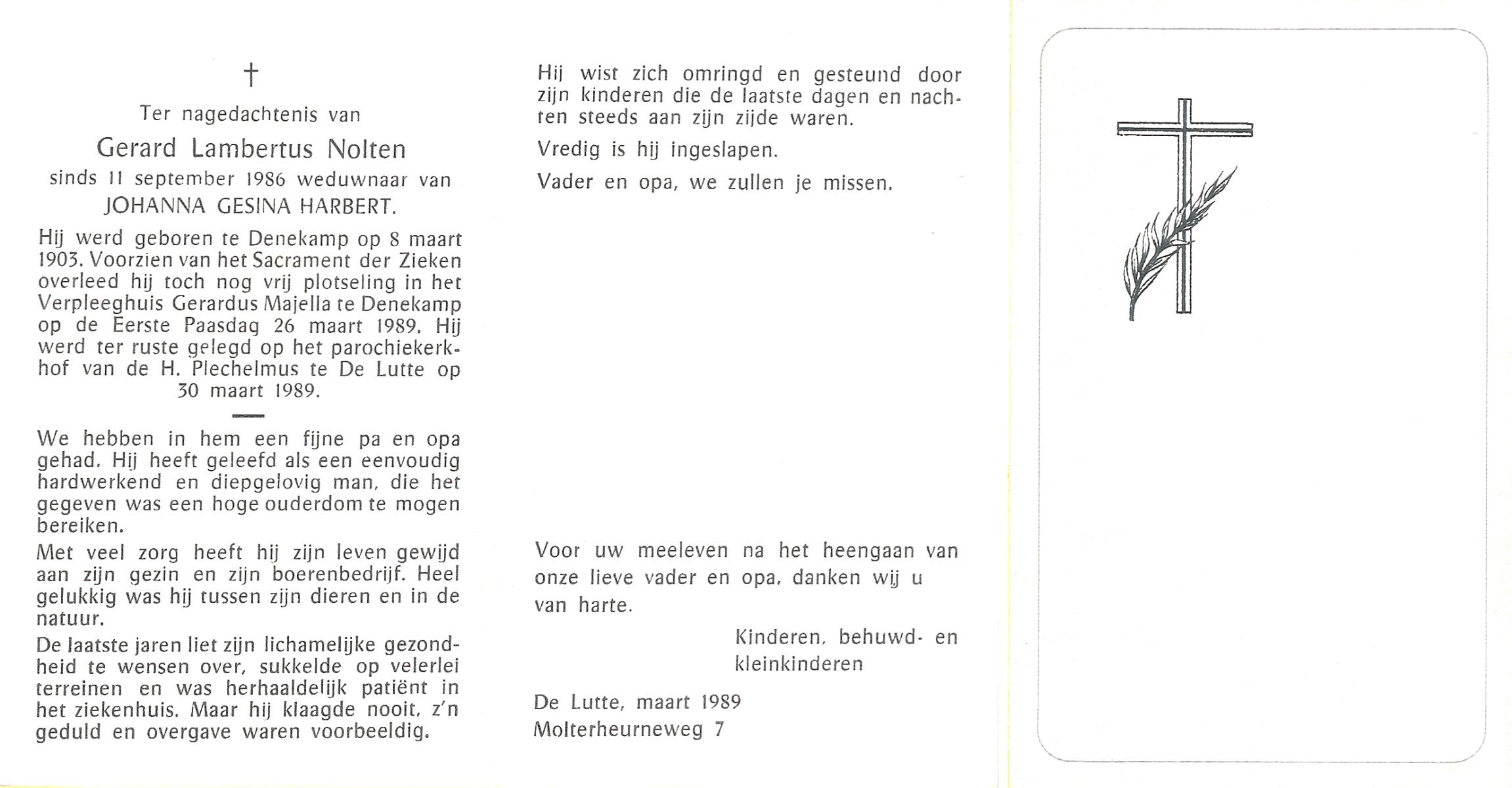 NIJLAND, Gerhardus Johannes, geboren op 11-12-1875 te Delden, Ambt, overleden op 16-3-1964 te Bentelo op 88-jarige leeftijd, begraven op 20-3-1964 te Bentelo.