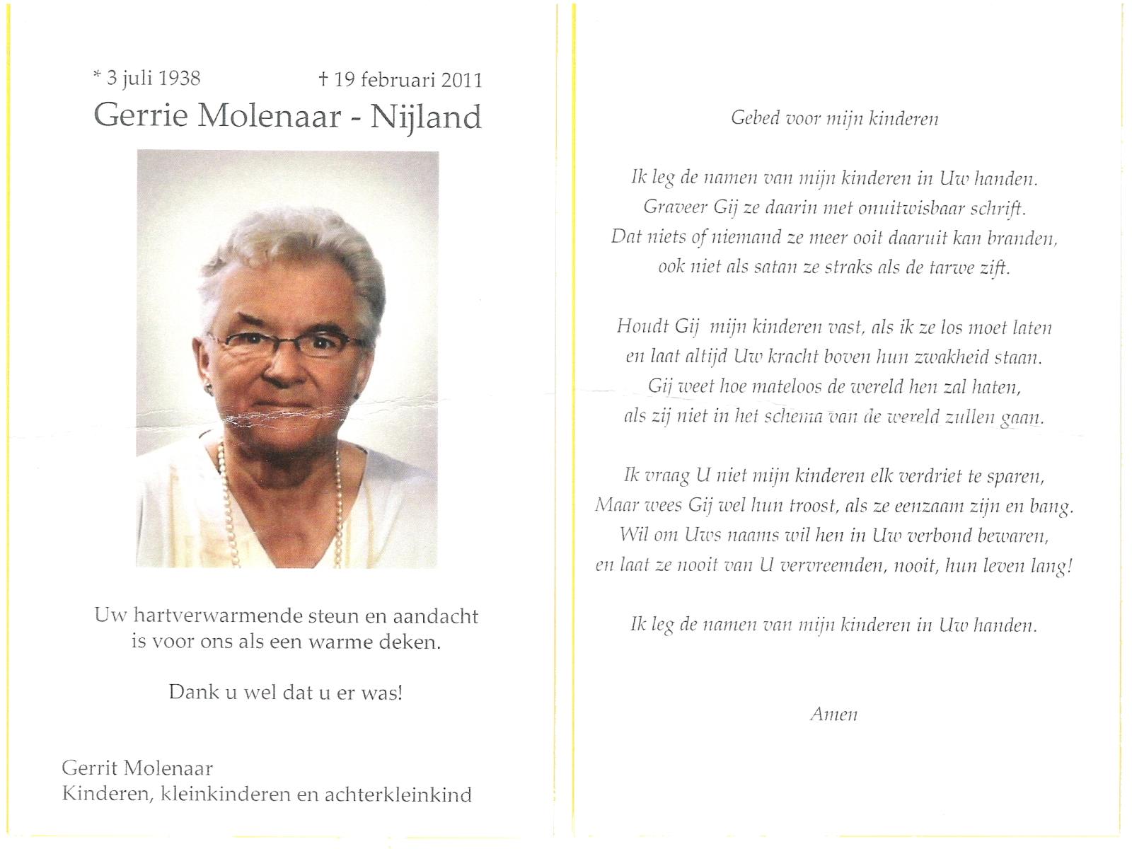 NIJLAND, Gerrie, geboren op 3-7-1938, overleden op 19-2-2011 te Hellendoorn, Nijverdal op 72-jarige leeftijd.